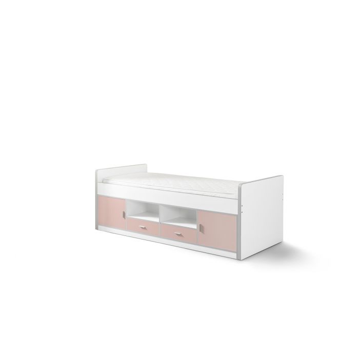 This space-saving BONNY cabin bed in light pink has 2 cabinets with a door and in the middle 2 drawers with a shelf above.