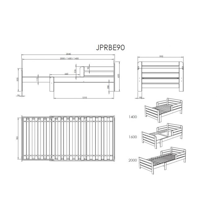 This transformable JUMPER bed in white can evolve together with your child. The width of the bed is 90 cm and the length can be fixed on 140, 160 and 200 cm.