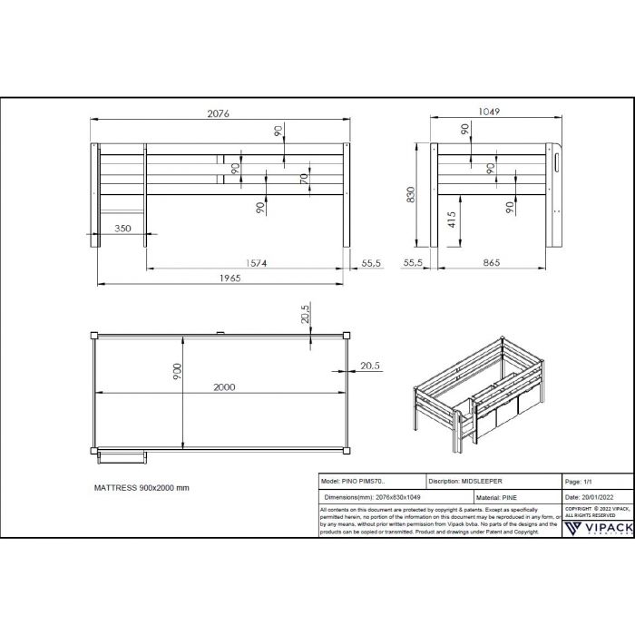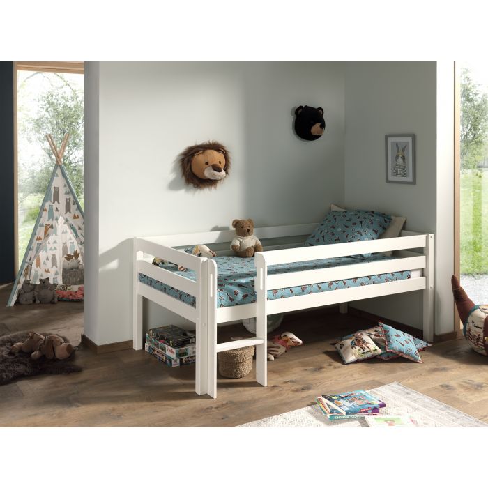This PINO mid-sleeper is white lacquered and made of solid Scandinavian pine wood. The slatted base is included and is suitable for a mattress of 90 x 200 cm. The space between the bed and the floor is 41.5 cm.