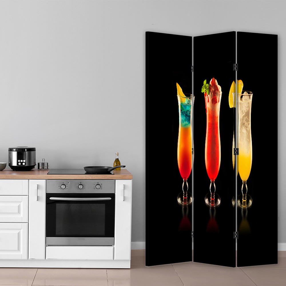 - Paravent avec image de cocktails sur fond noir, composé de 3 parties.
