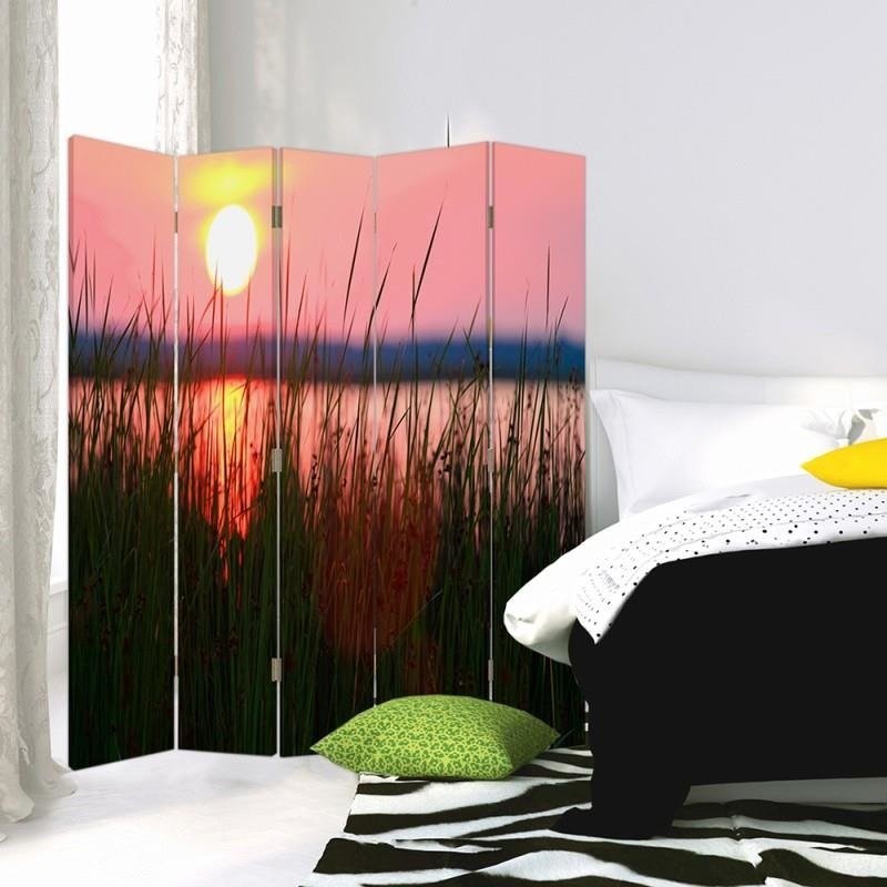 Paravent séparateur d'espaces avec coucher de soleil sur le lac imprimé sur toile avec cadre en mdf