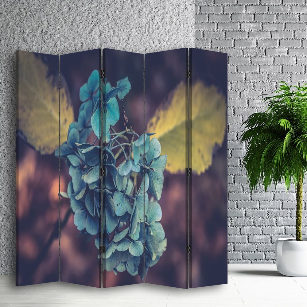 Paravent séparateur d'espaces avec image d'une fleur turquoise imprimée sur toile avec finition bleue et cadre en mdf