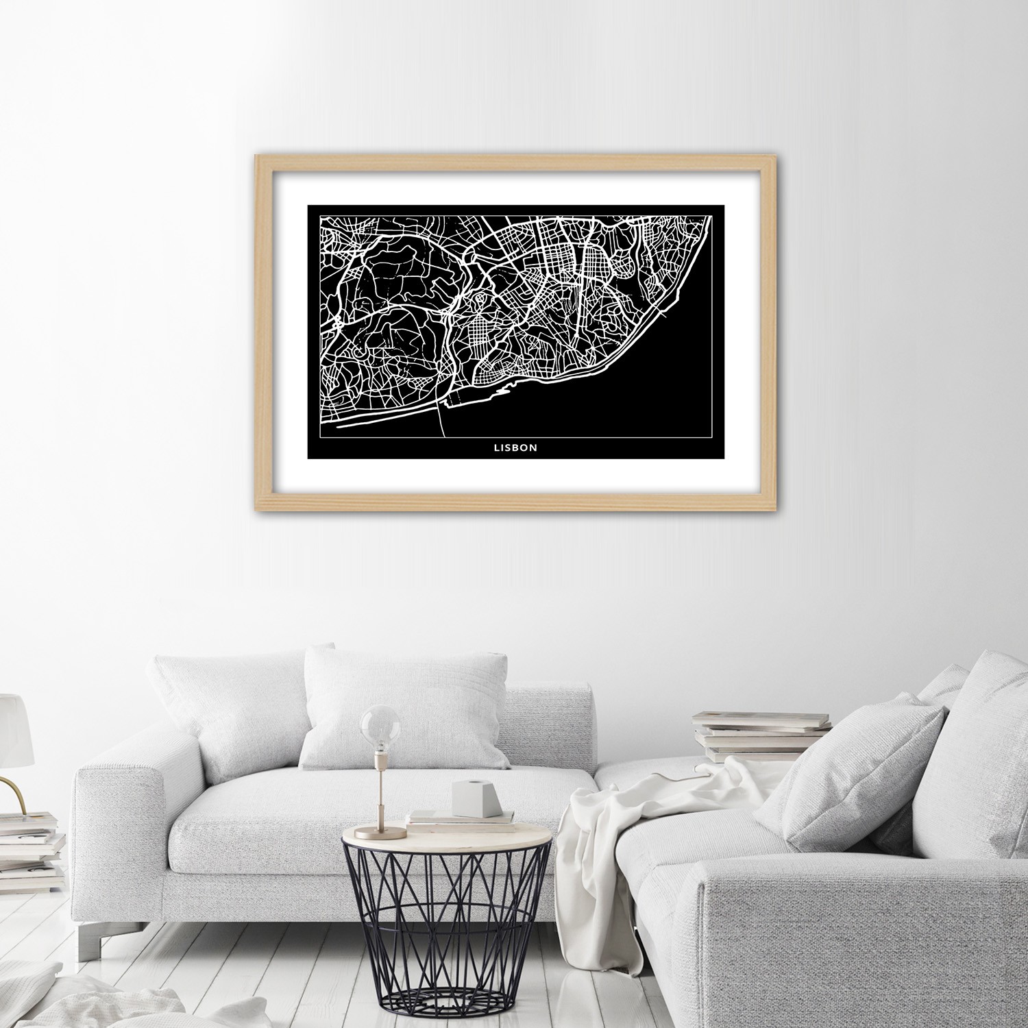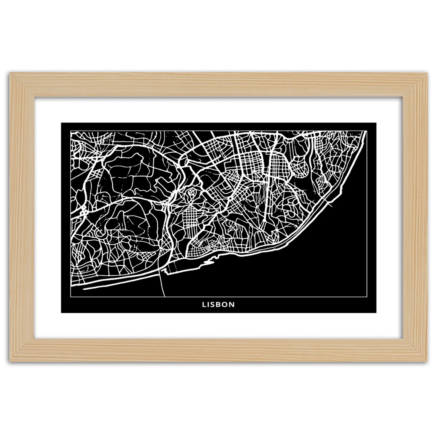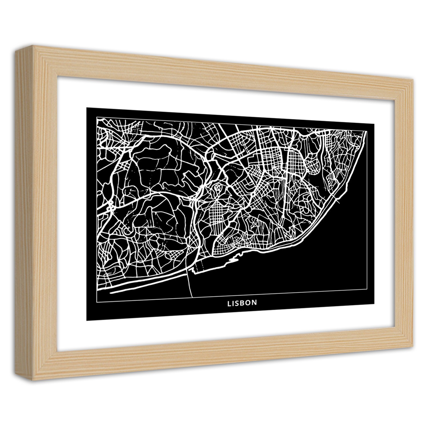 Cadre avec carte de lisbonne fabriqué en hdf de couleur noir et blanc