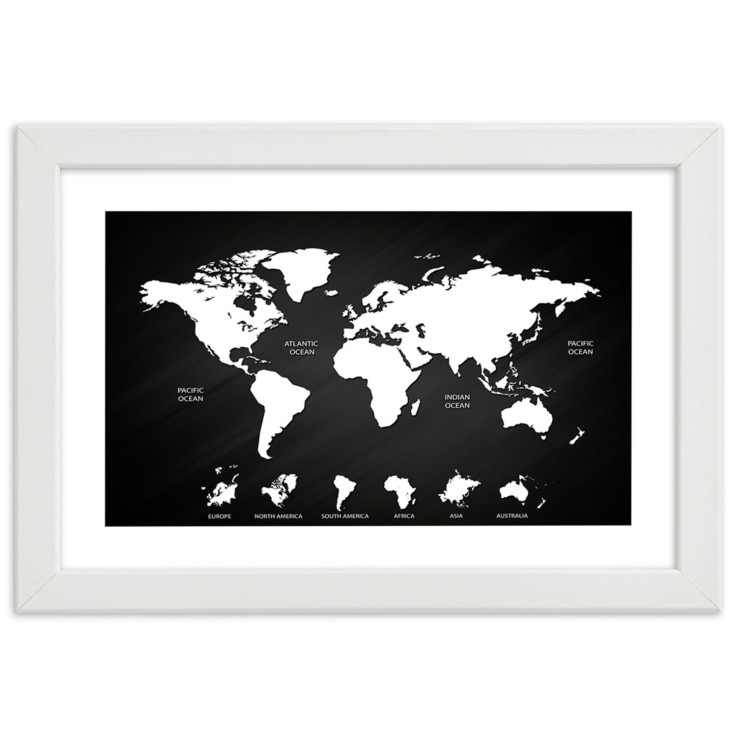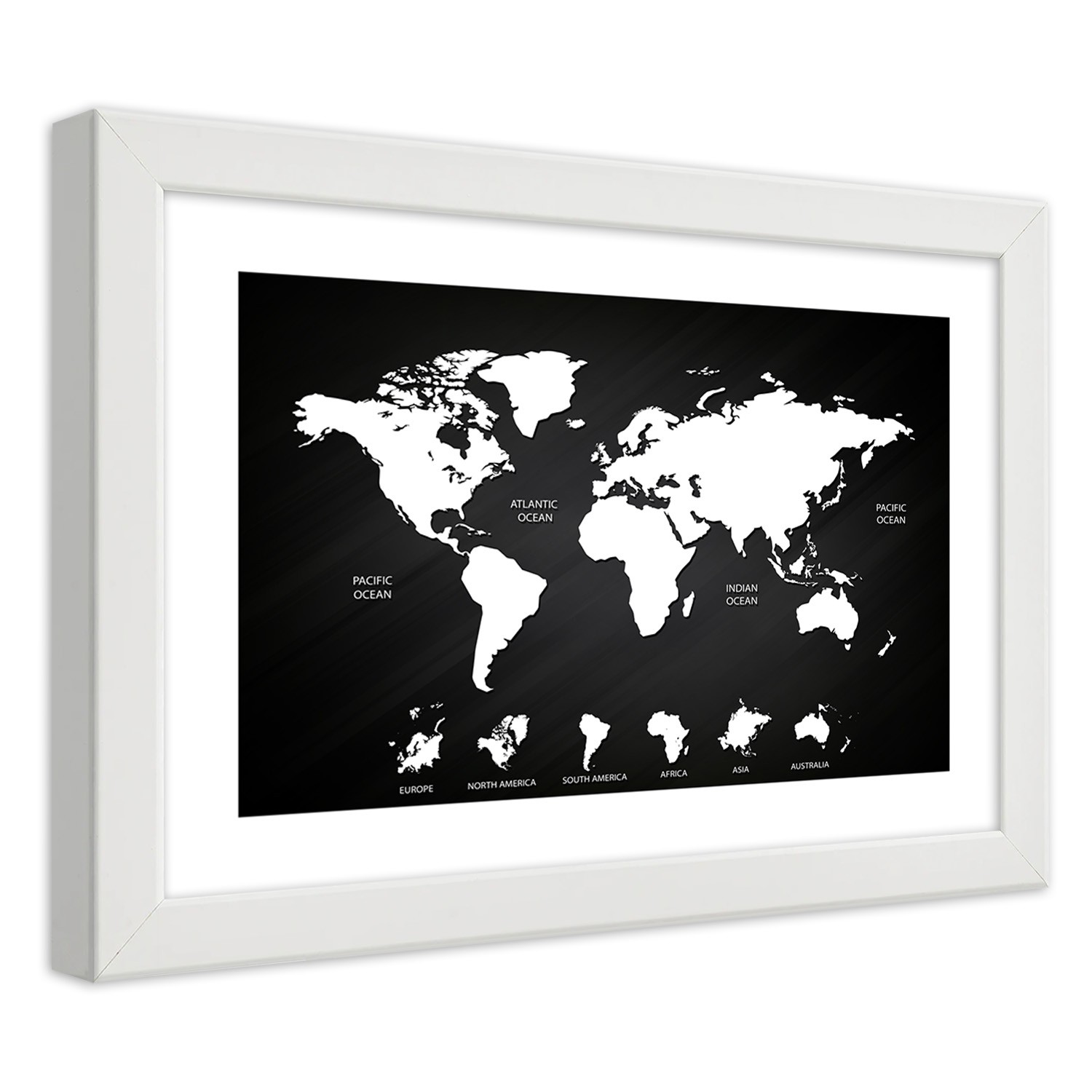Informations sur le produit "Cadre avec image de mappemonde contrastée imprimée sur papier satiné blanc et noir avec cadre en bois"