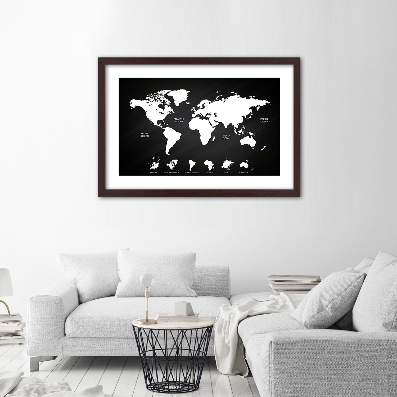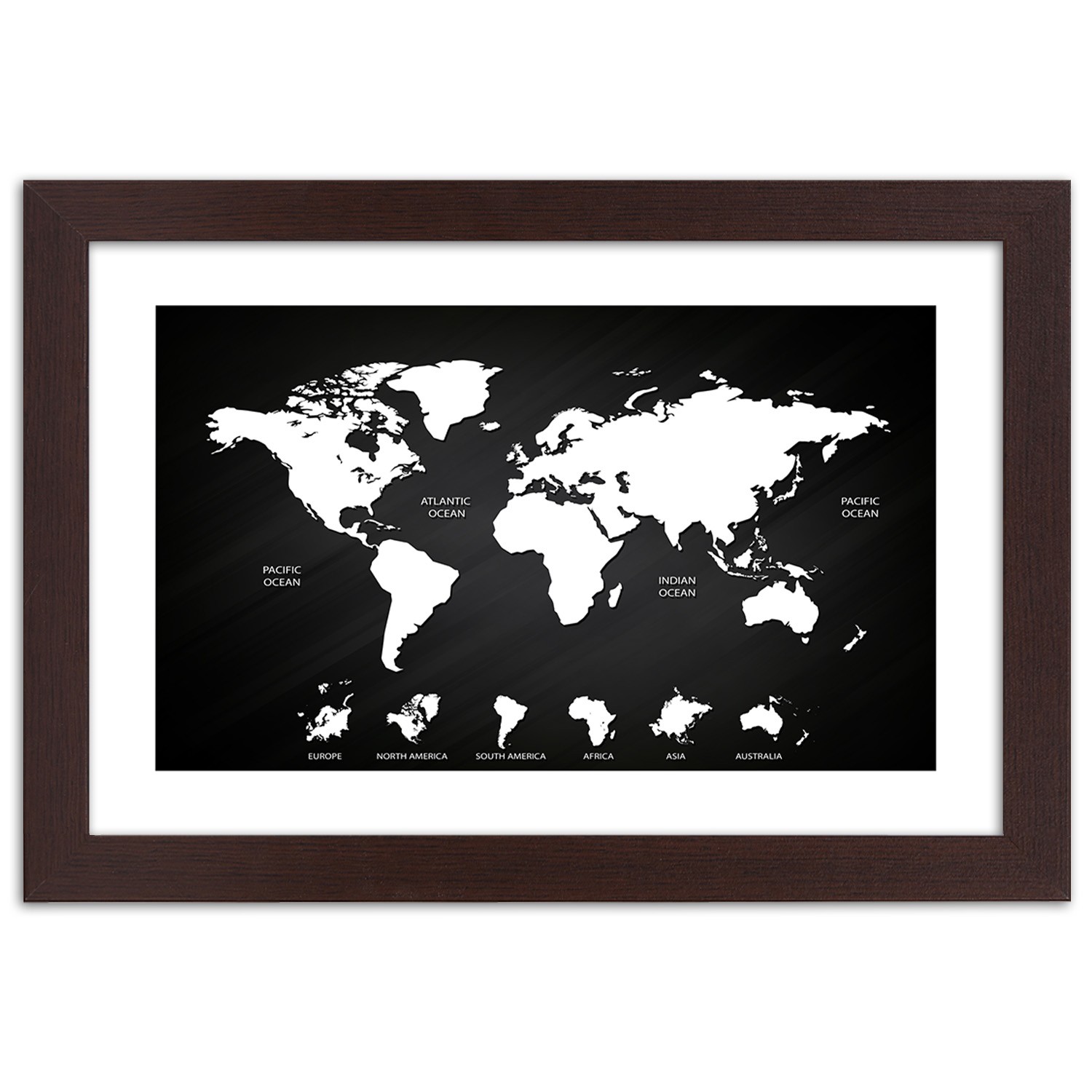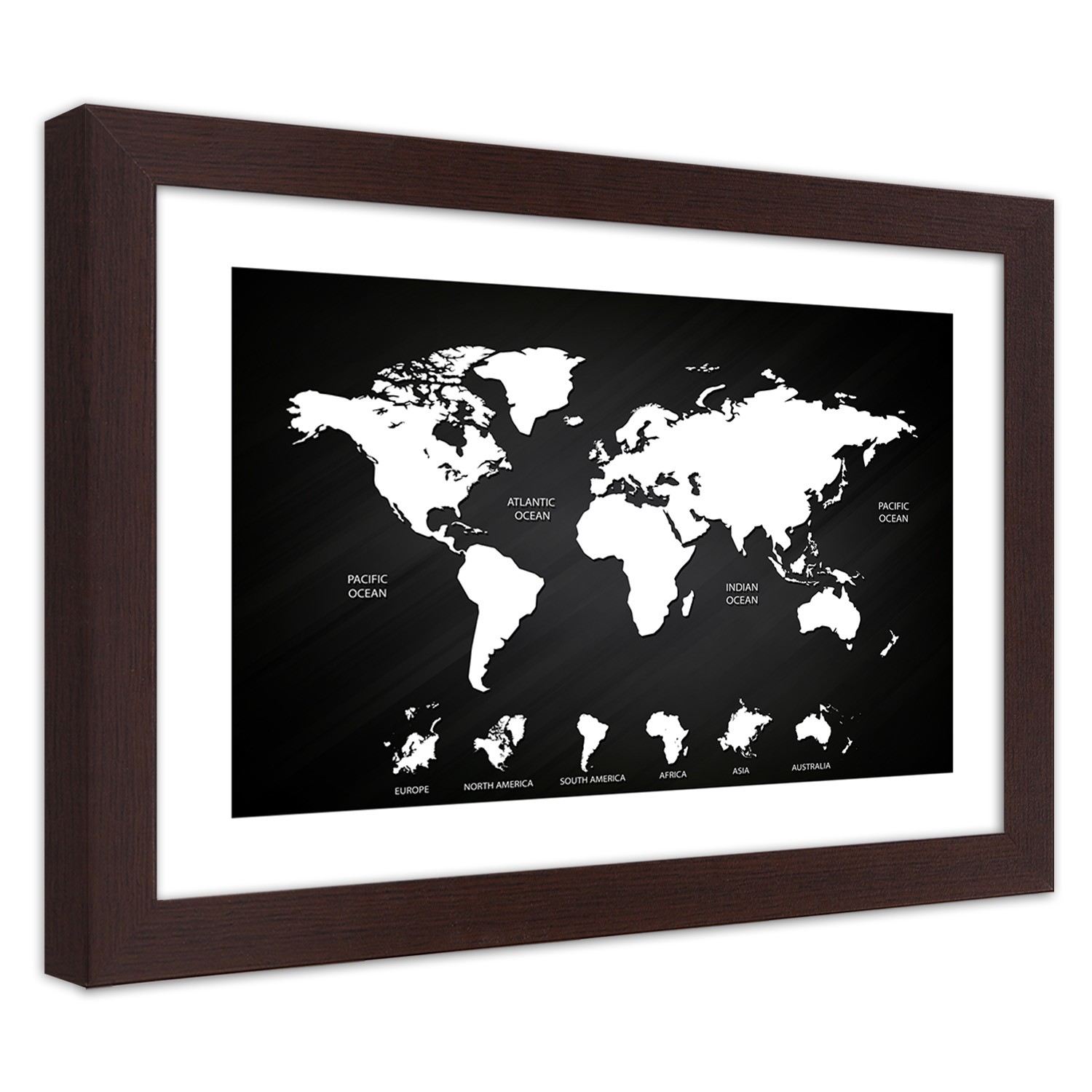 - Cadre « carte du monde et des continents contrastée » imprimé sur papier satiné avec encadrement en MDF (fibre de densité moyenne).
