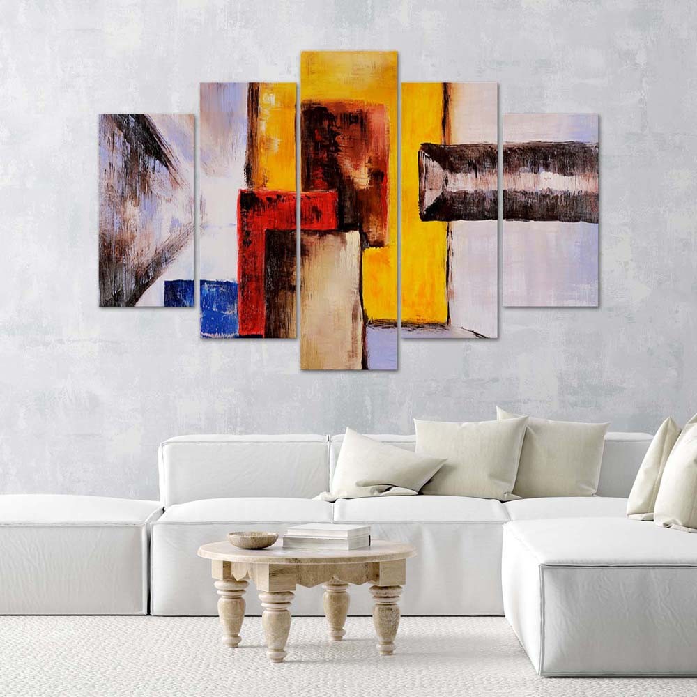 Cadre de cinq panneaux imprimés sur toile avec encadrement en mdf jaune solide