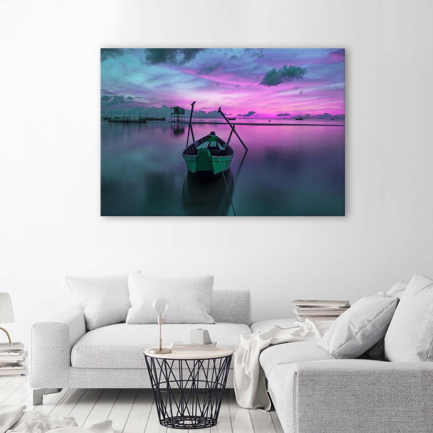 Cadre décoratif en mdf avec image imprimée sur toile d'un bateau sur le lac couleur violette