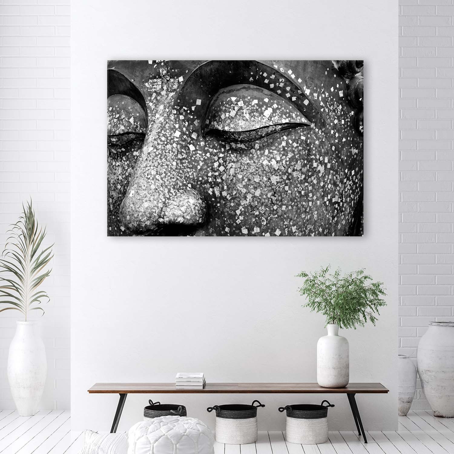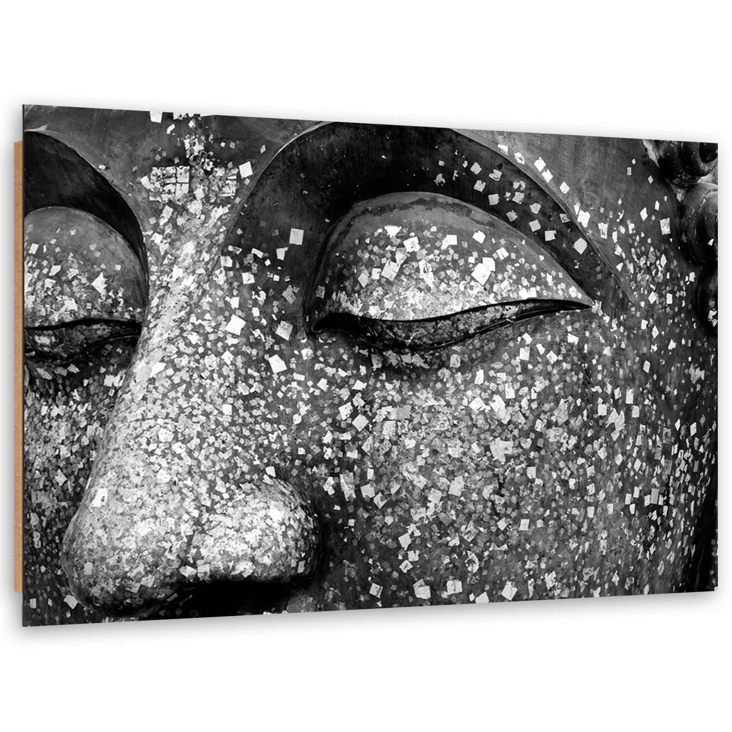 Cadre imprimé sur toile avec image des yeux de bouddha couleur blanc et noir fabriqué en mdf
