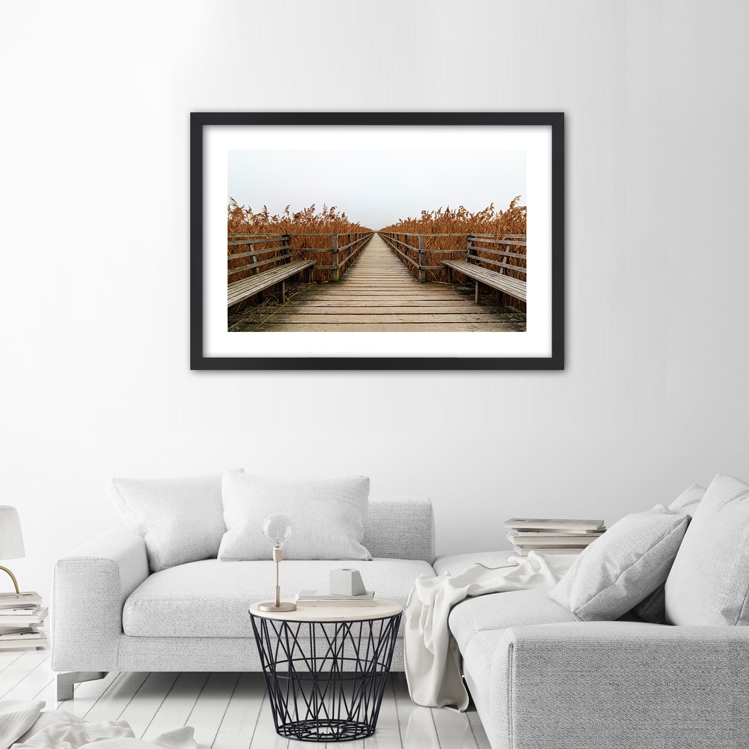 Cadre noir en mdf plaqué avec un poster de la nature et d'un ponton sur le lac