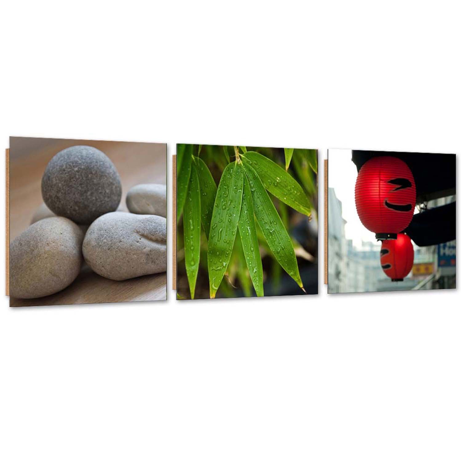 Informations sur le produit "Ensemble de cadres décoratifs panneaux en toile et mdf avec image de feuilles pierres et lanternes orientales"