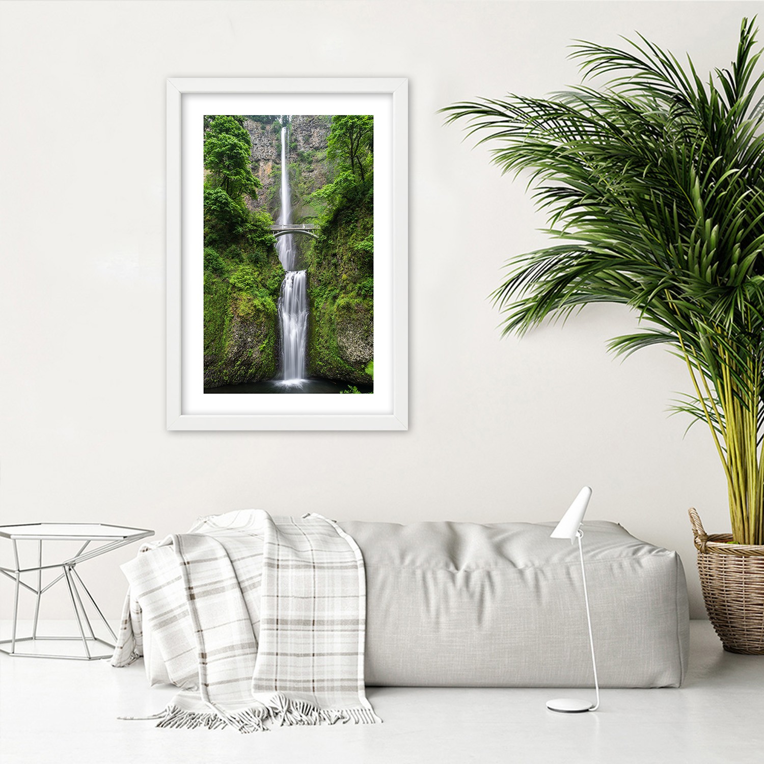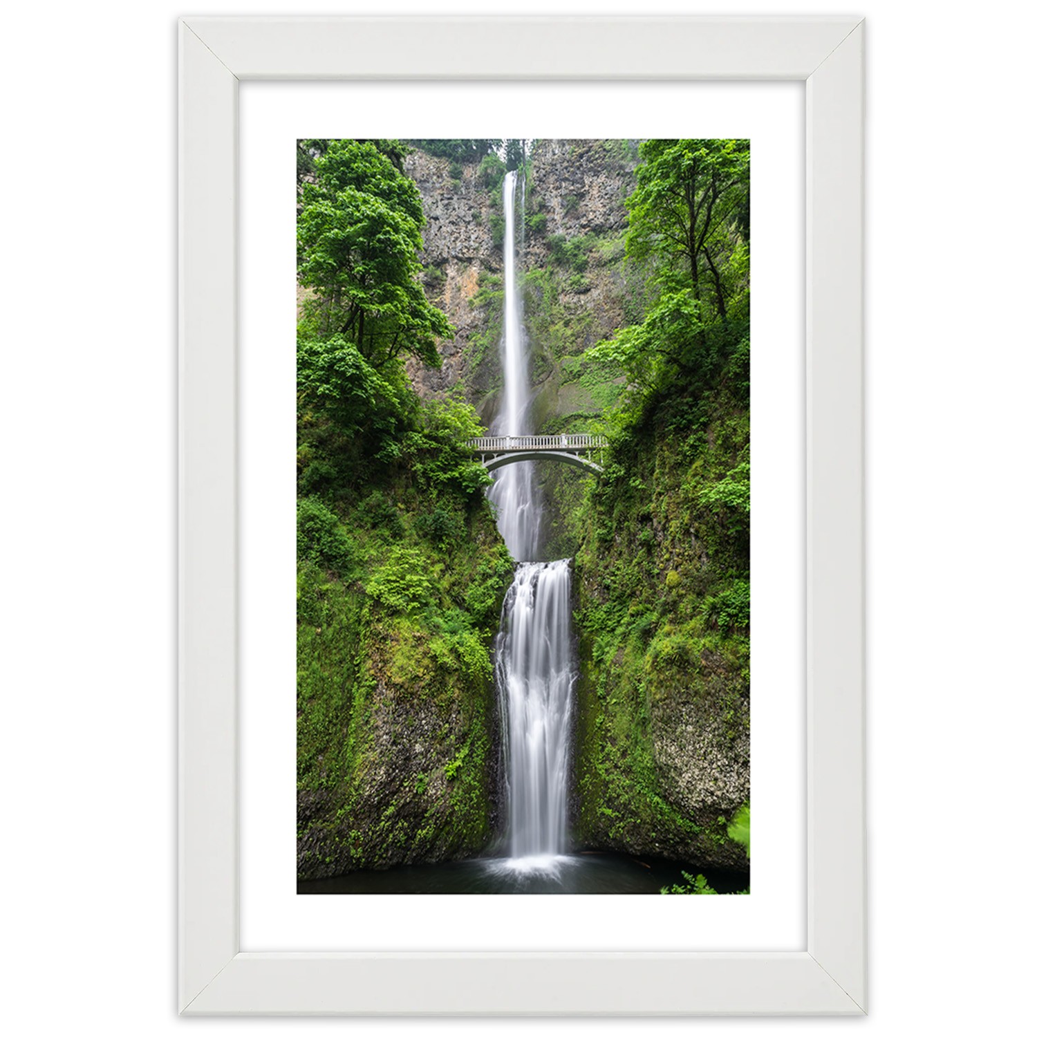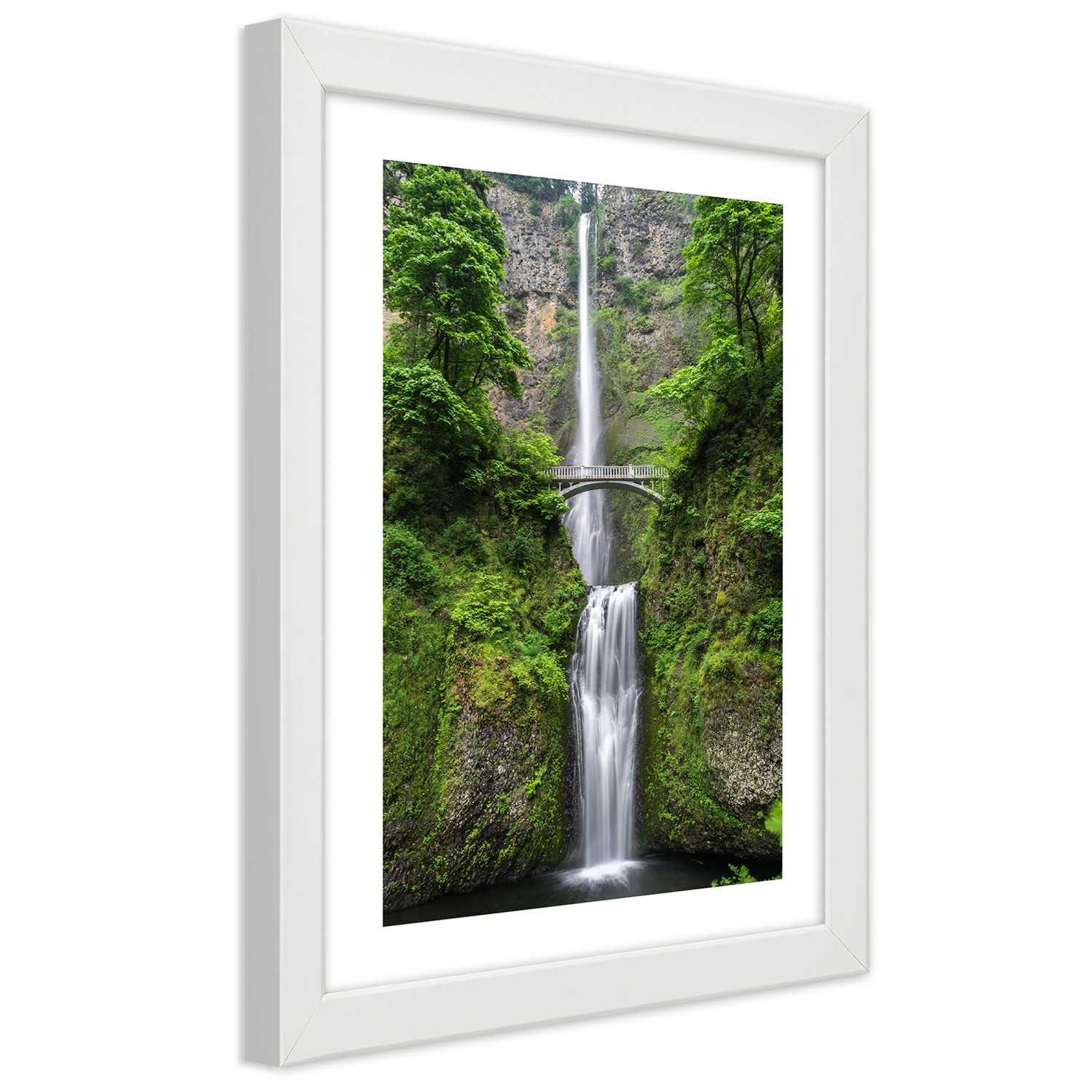 Picture in white frame, Bridge over a waterfall