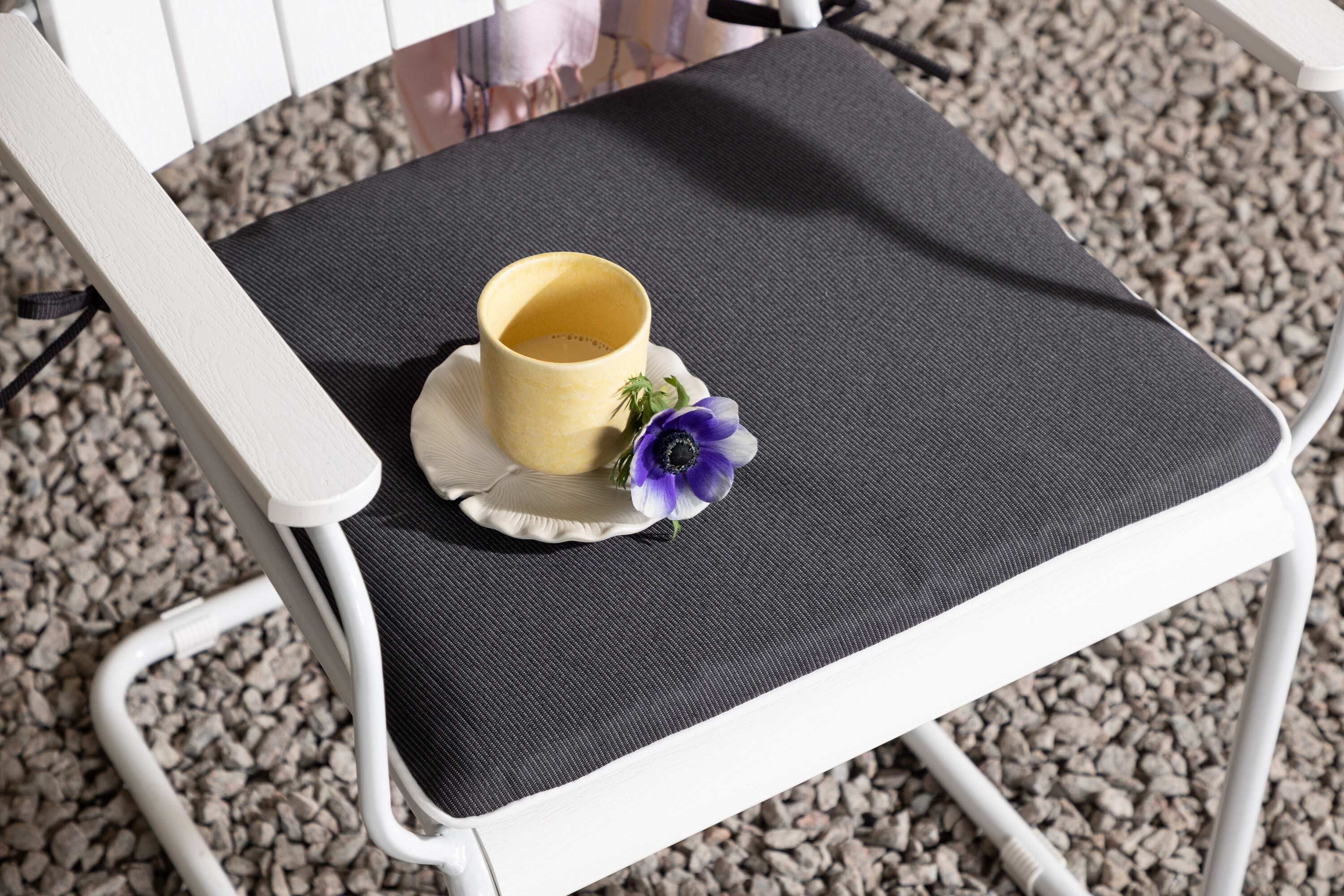 Coussin de siège gris simple et pratique adapté à nos chaises Holmsund. Le coussin est fourni avec les cordons sur le côté qui aident à le maintenir correctement en place. Profitez de l'été - soigné et confortable !
