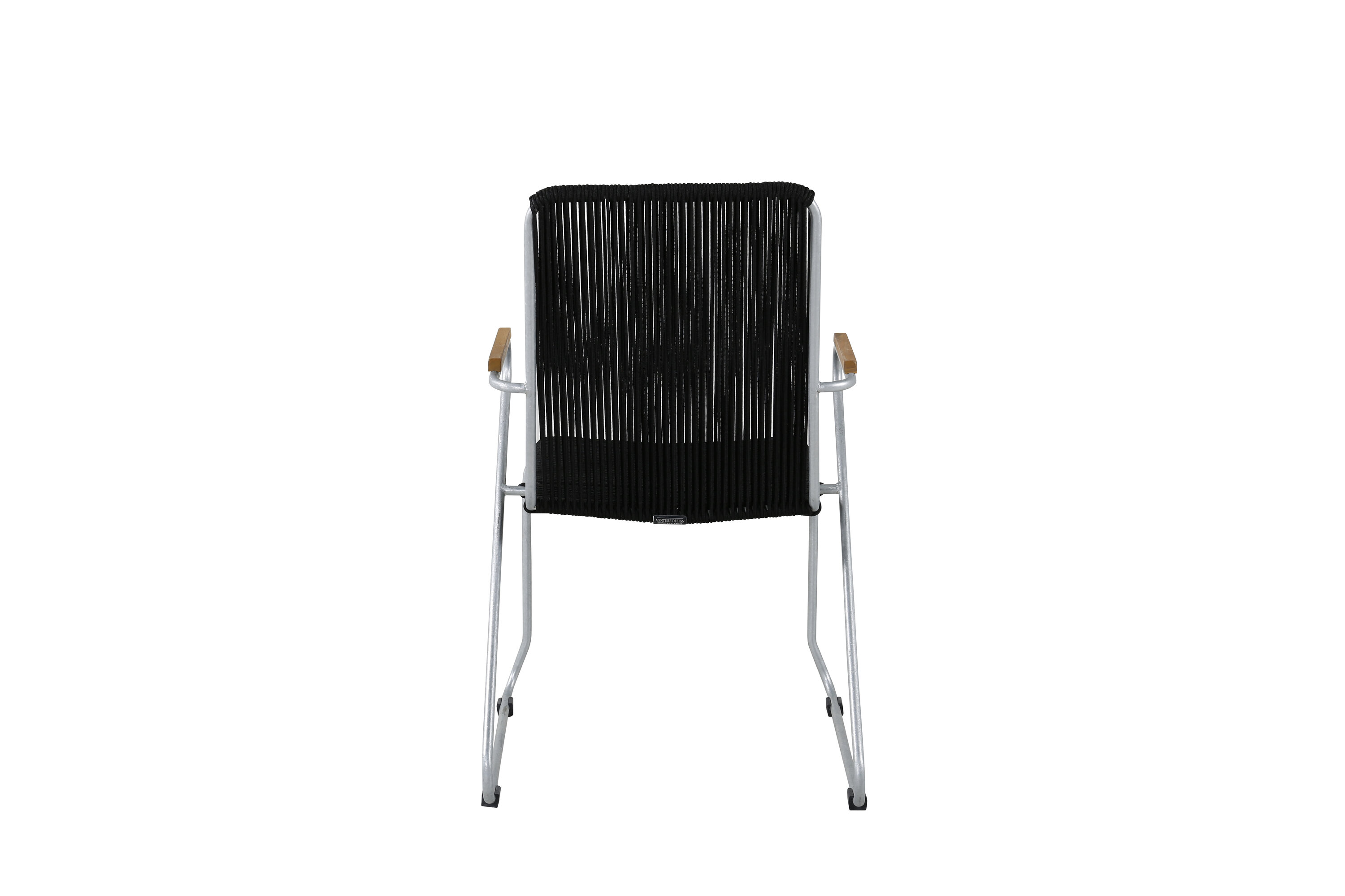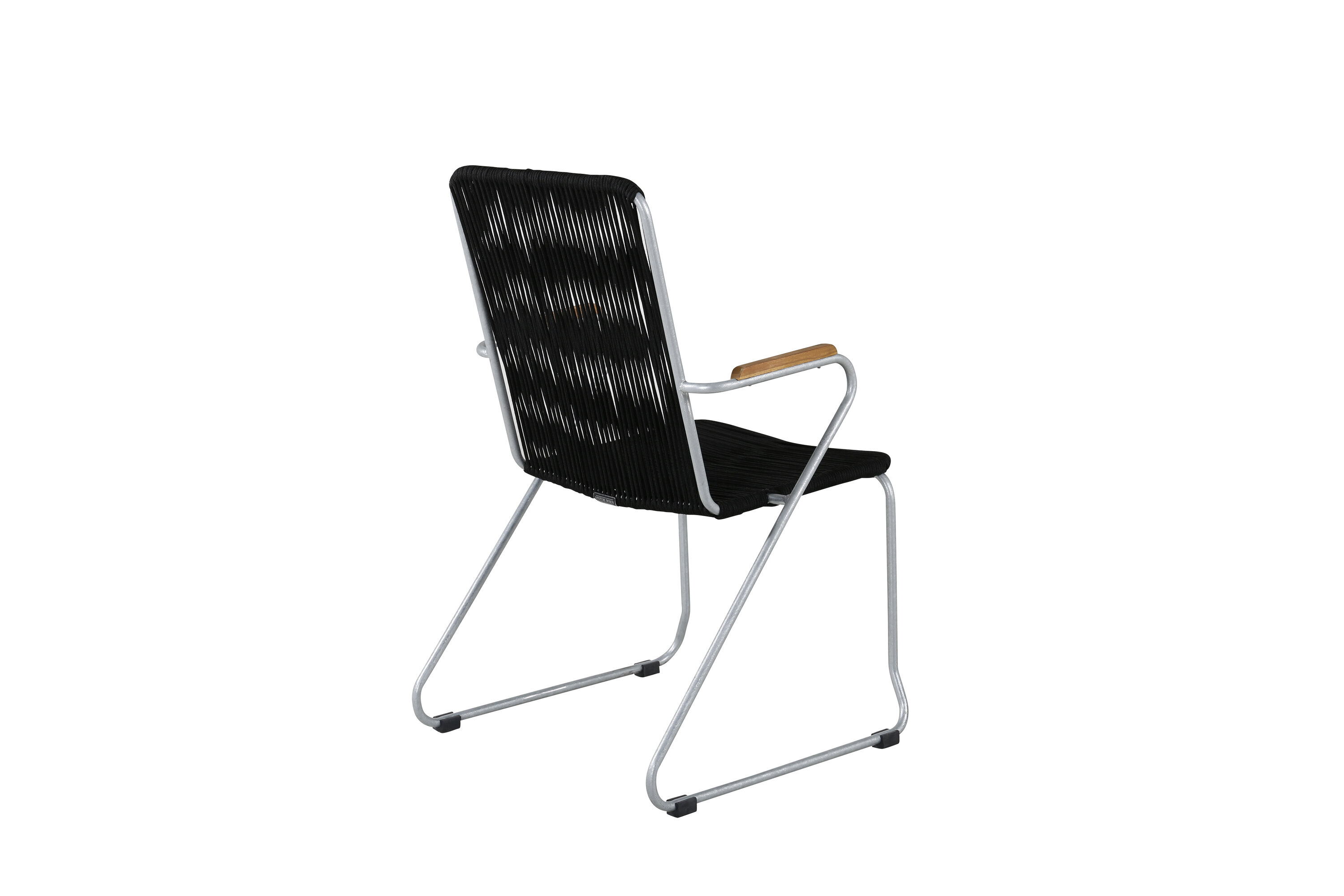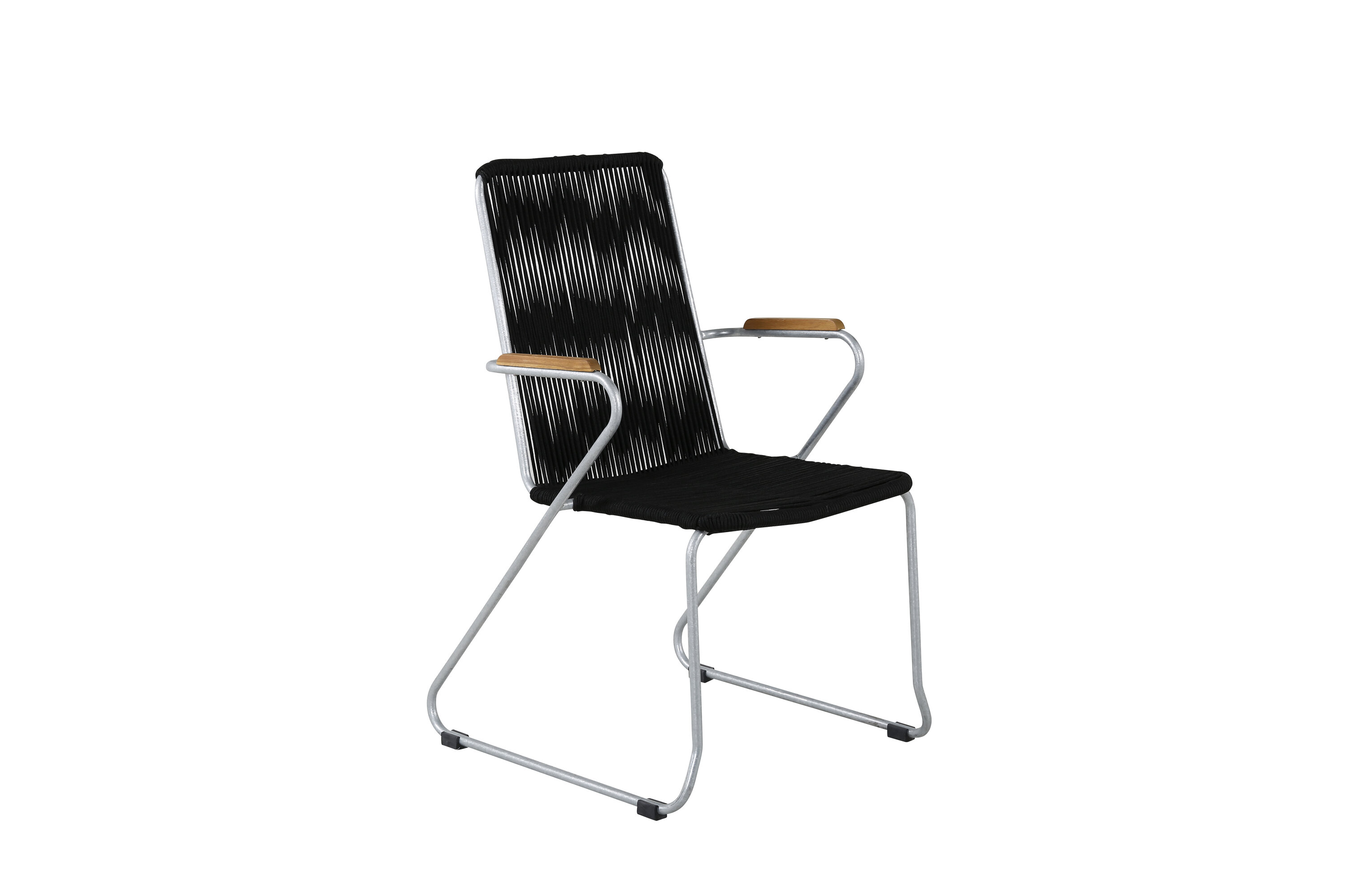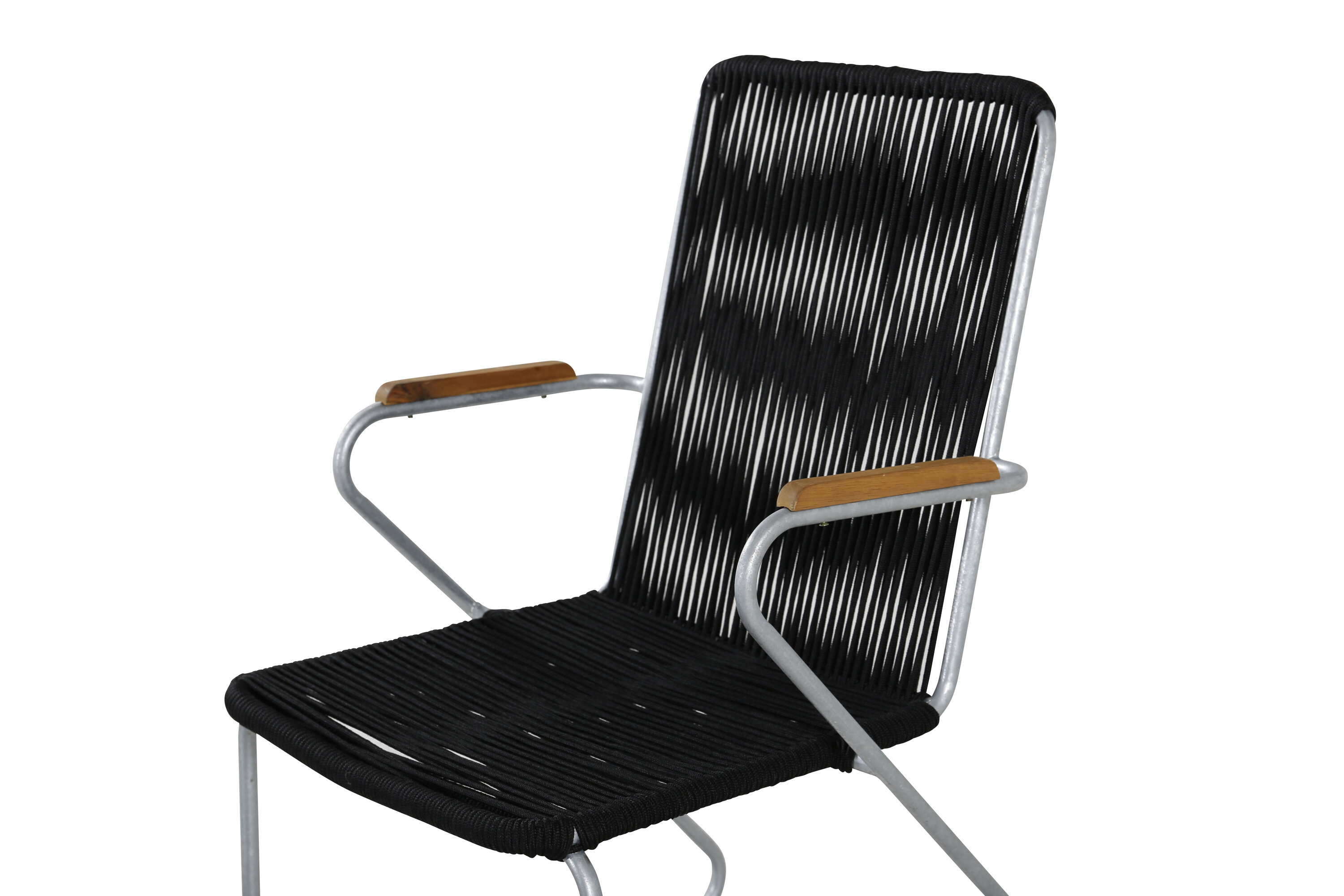 Moderne, élégante et durable - une chaise tendance pour tous les goûts ! BoIS a un design confortable dans la construction en zinc, siège en corde noire et accoudoirs décoratifs en teck. Un meuble qui vous invite à de nombreux moments agréables ! Profitez d'un peu plus de délicieux repas à l'extérieur et aménagez le balcon dans un esprit élégant. La chaise est empilable.