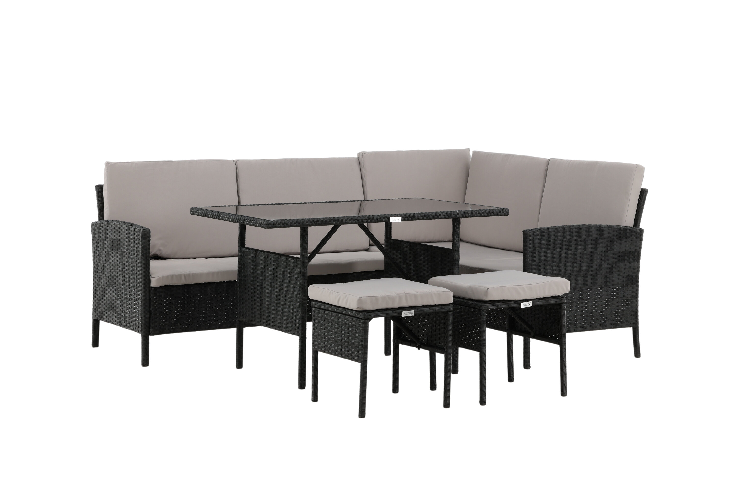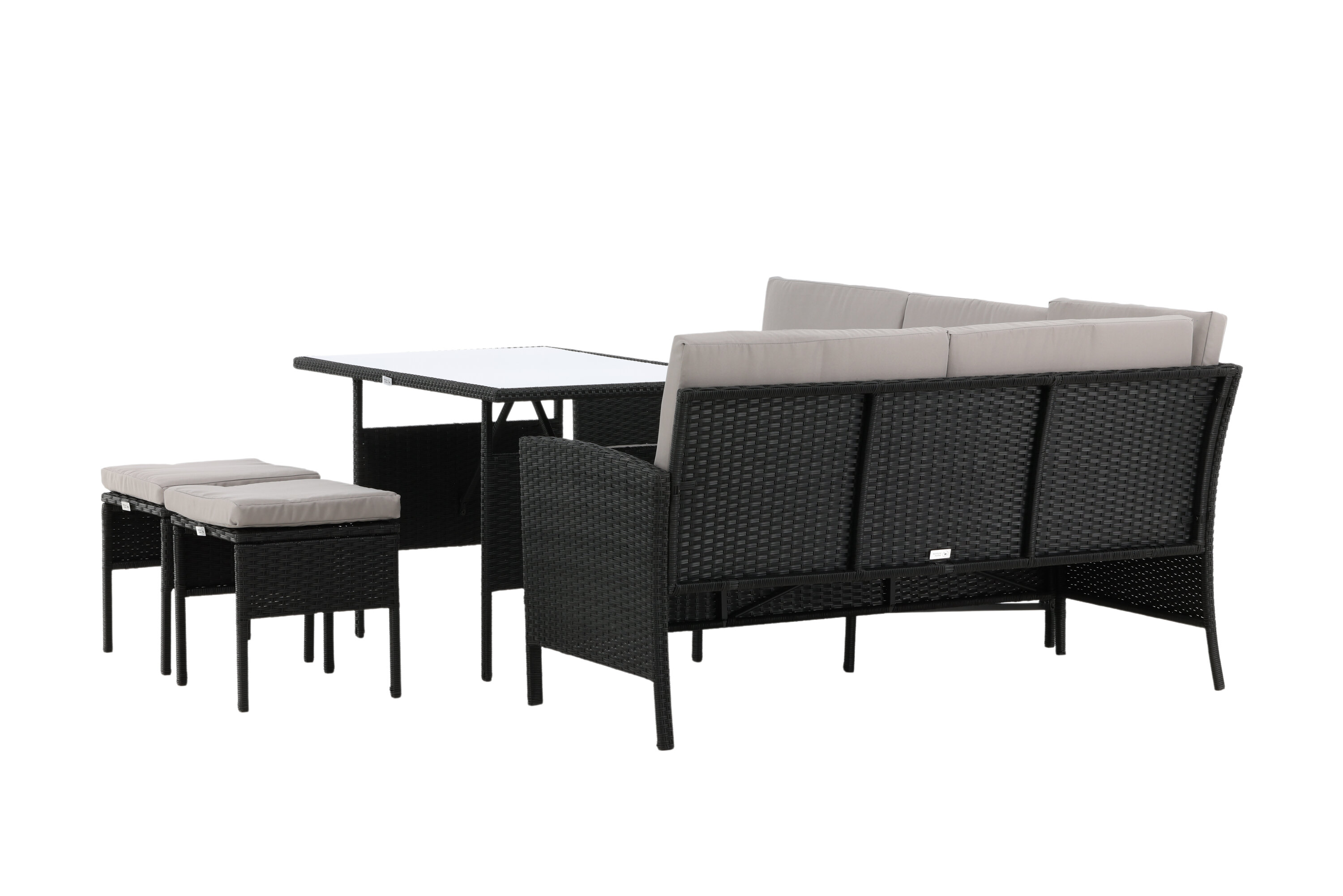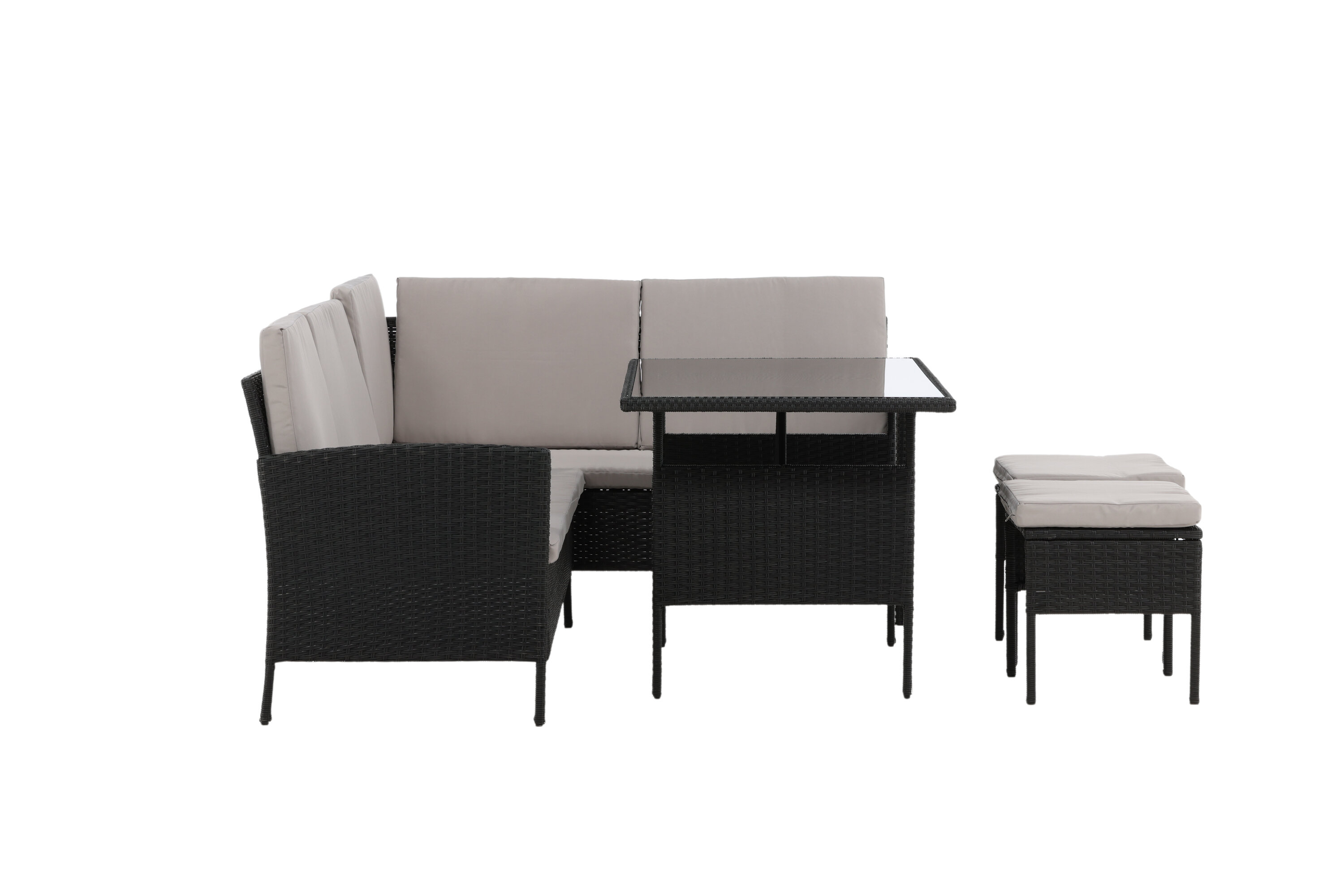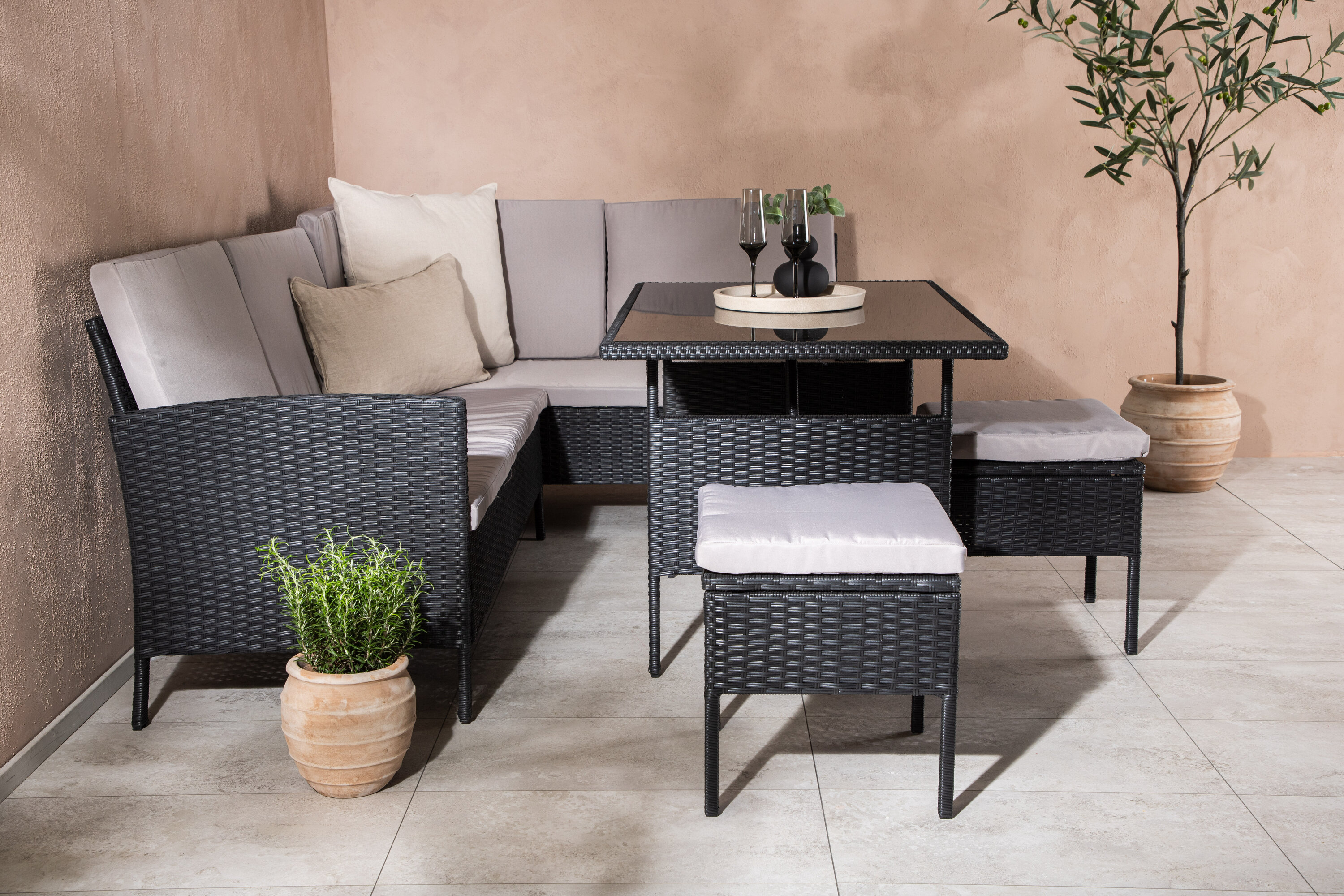 Le groupe de canapés Knock est idéal pour votre patio ou patio et est créé en mettant l'accent sur le confort et les deis intemporels. Le groupe canapé se compose d'un canapé d'angle en rotin artificiel noir avec quatre sièges et une partie d'angle, deux bites et une table supérieure en rotin artificiel avec une table en verre. Les coussins gris sont inclus dans le groupe canapé et contribuent à une sensation invitante !