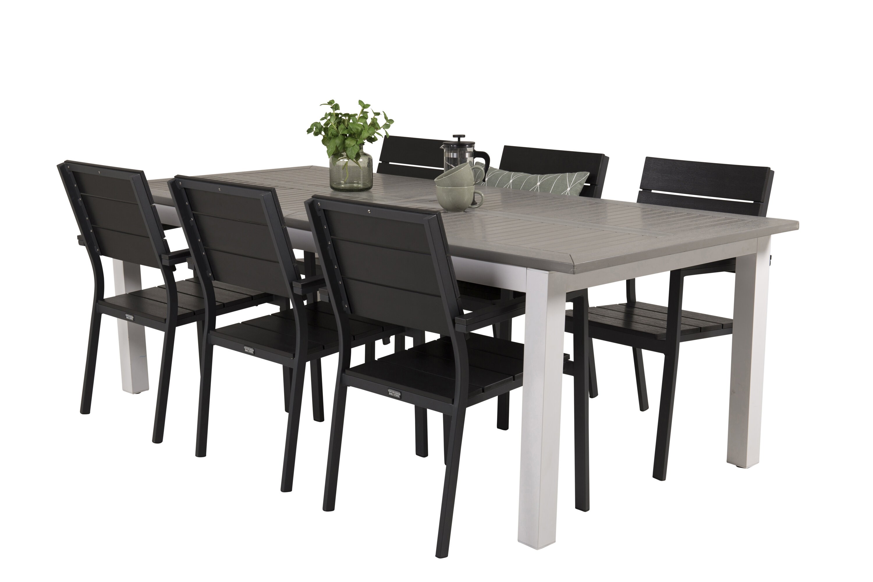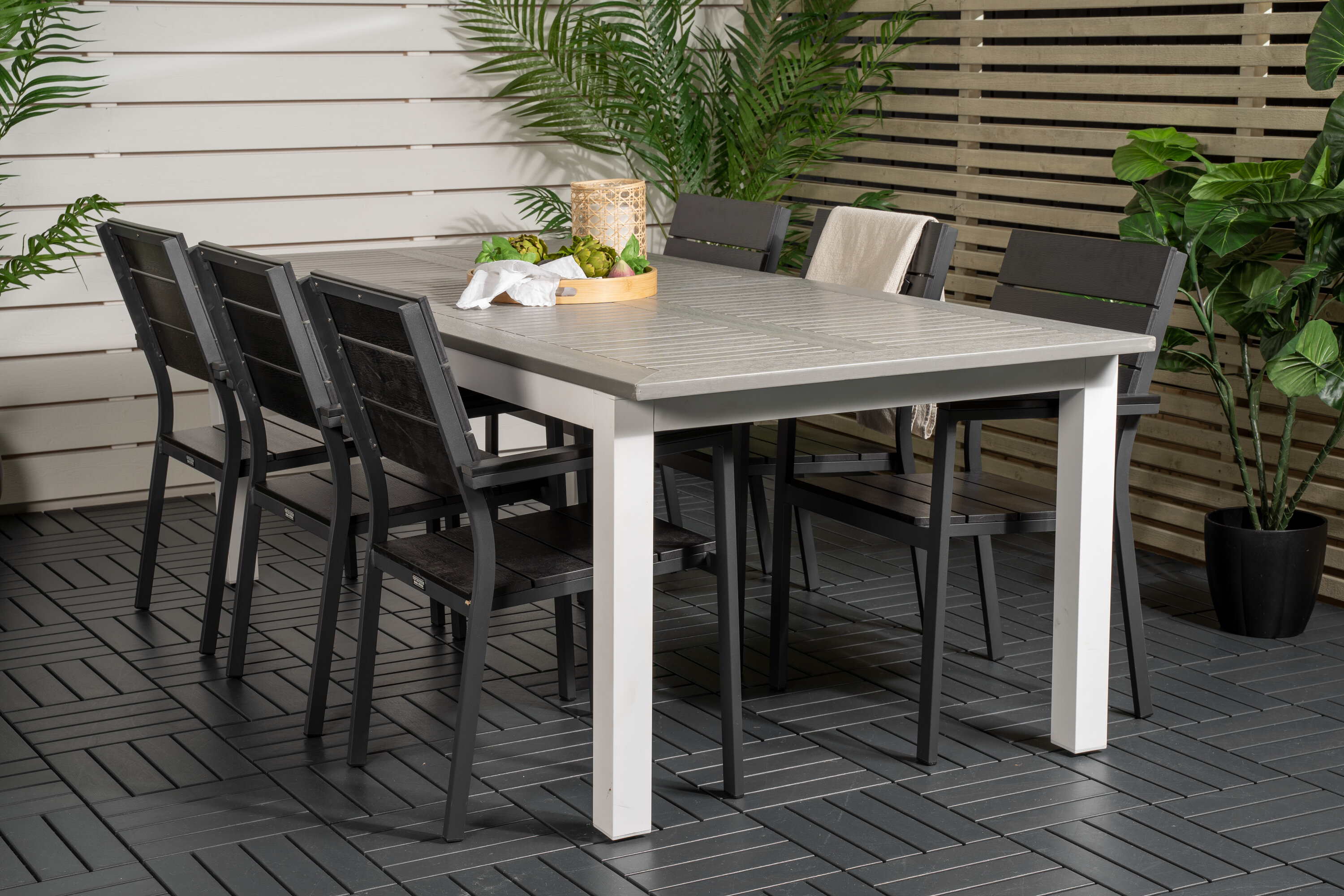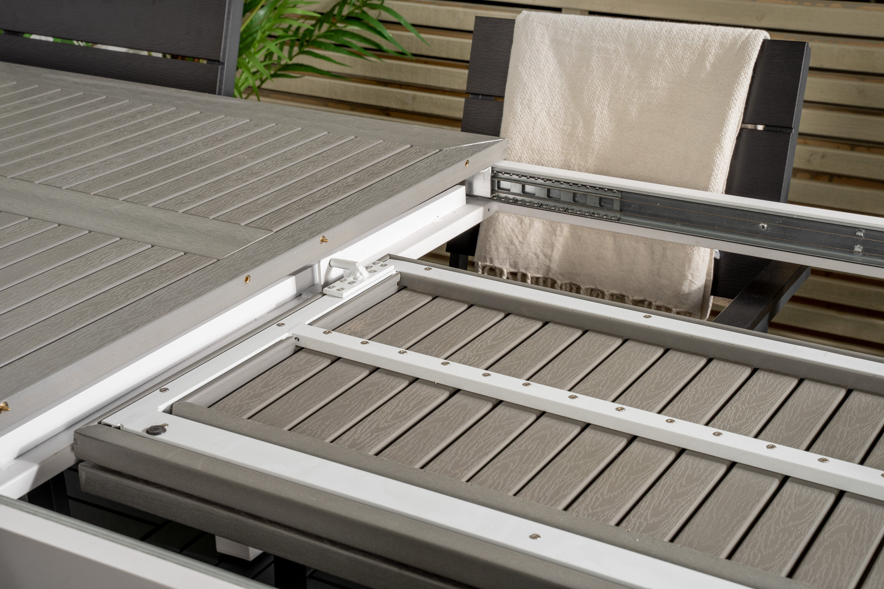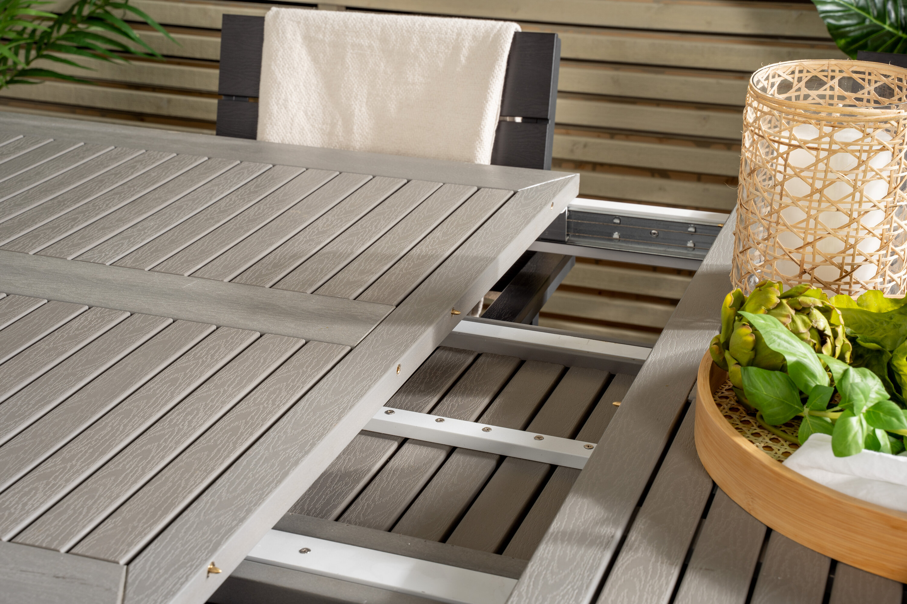 Groupe alimentaire qui s'adapte à la plupart des environnements ! Notre table à manger extensible Albany avec des chaises élégantes dans la série Levels est comme fait pour ceux qui veulent créer une sensation confortable et moderne dans le jardin ou dans l'espace extérieur. Élargissez vos invitations à dîner et évitez de vous soucier de l'hébergement de tout le monde.