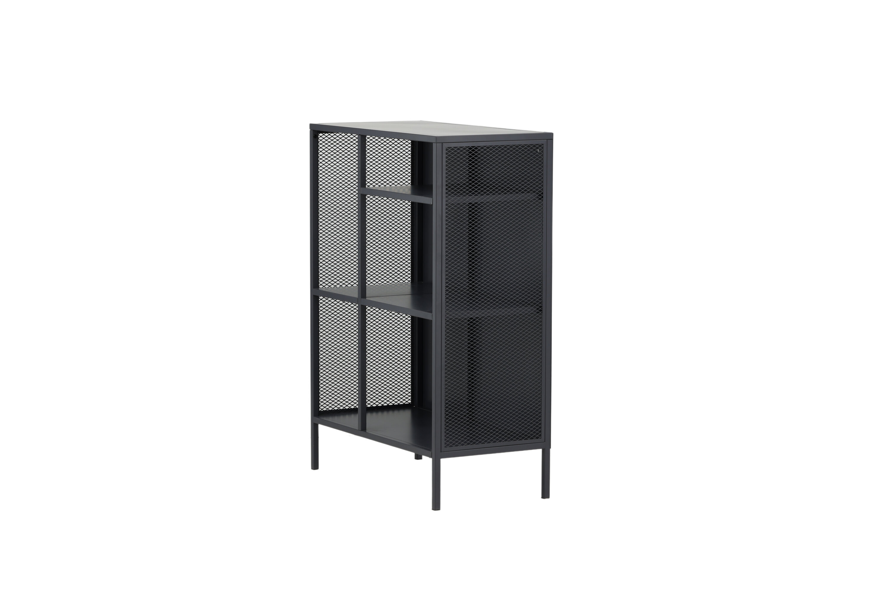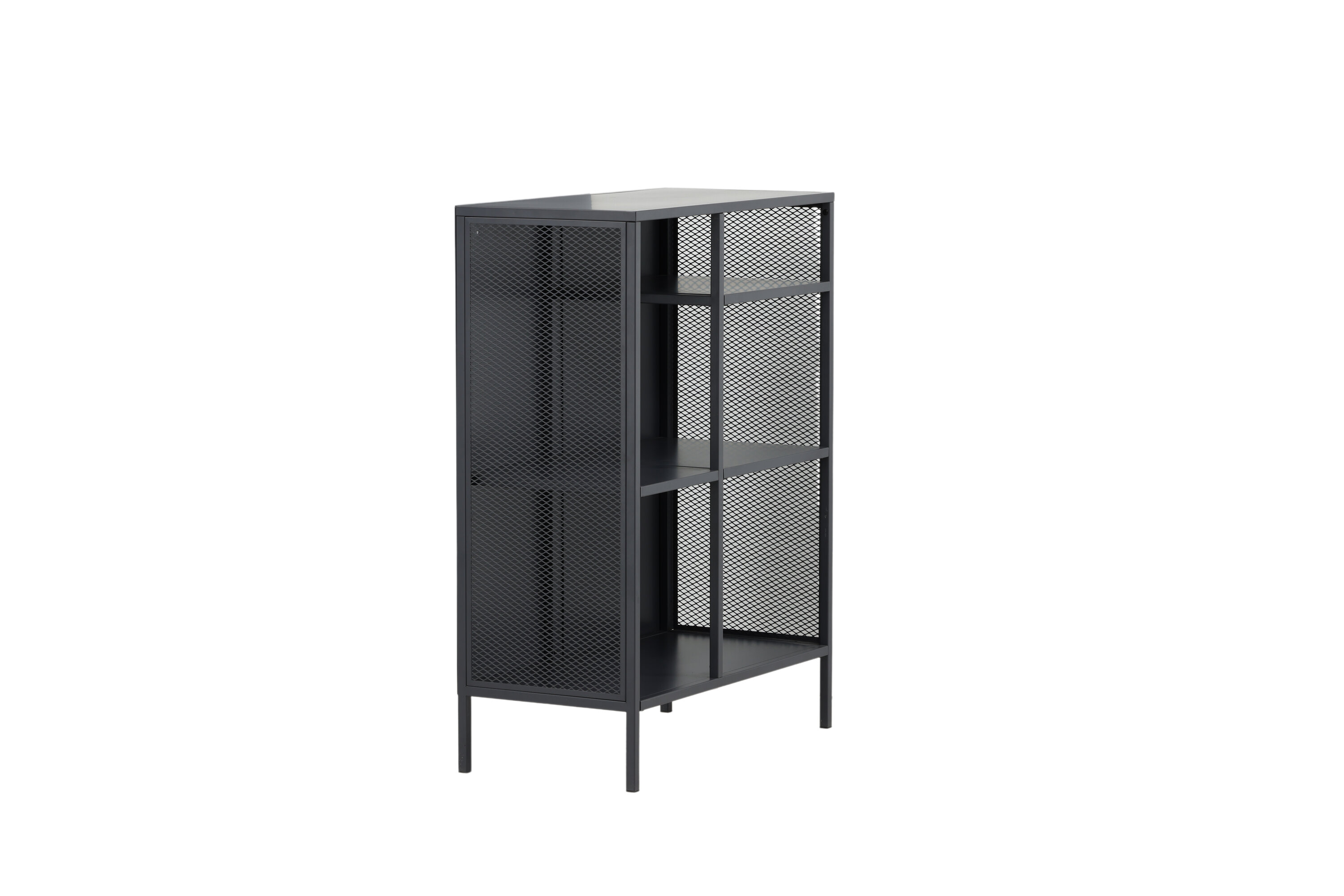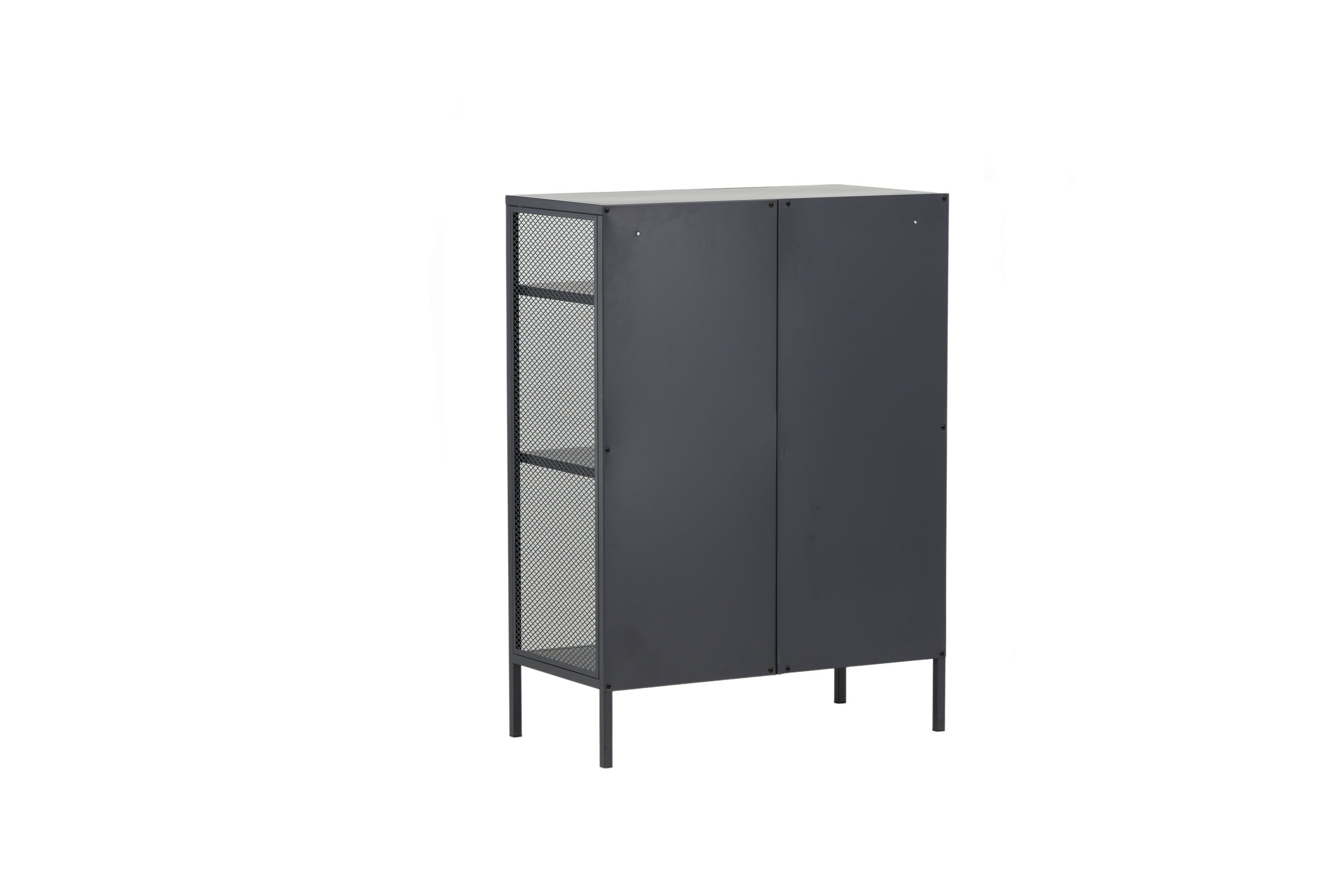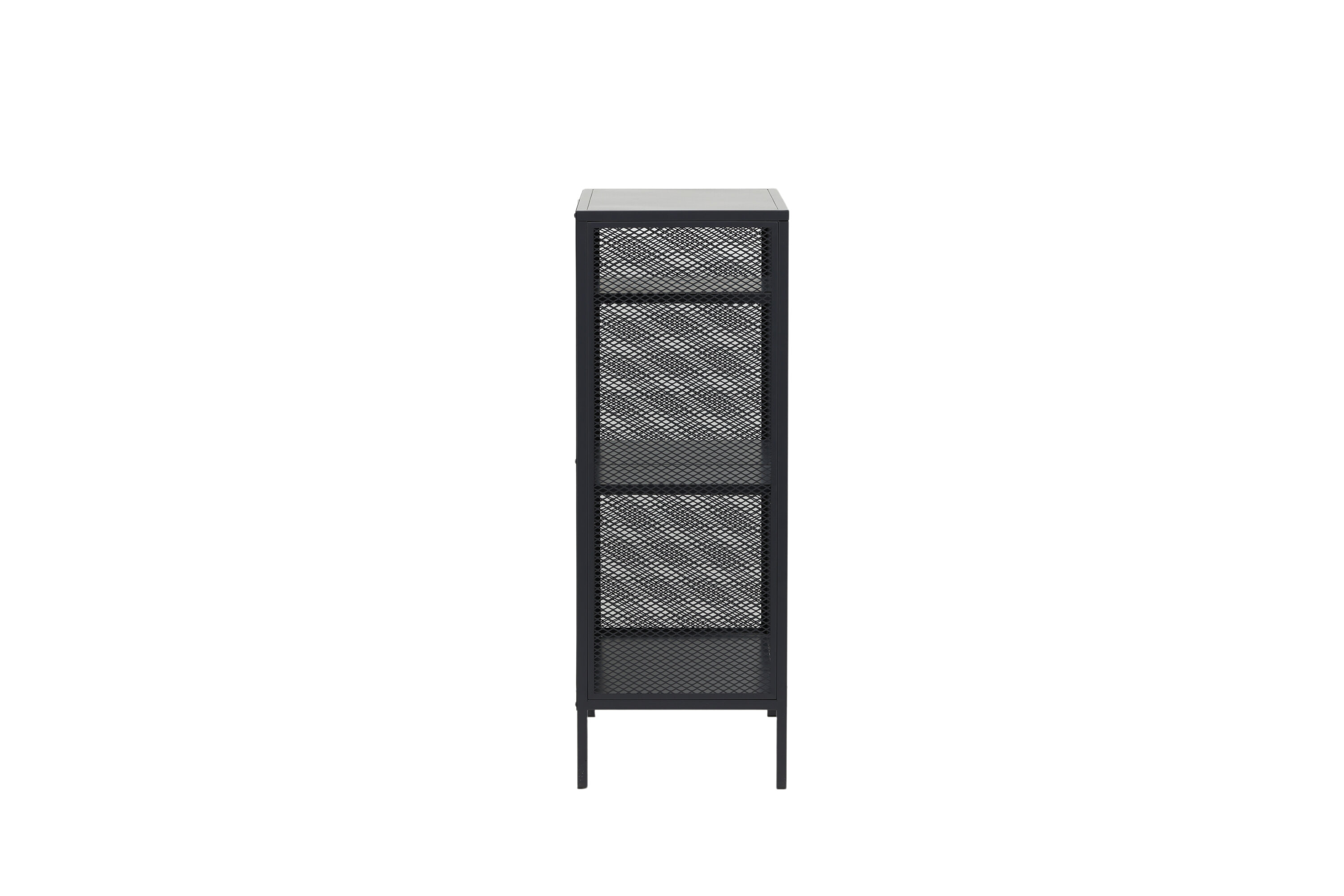 Misha, dans un design industriel robuste en acier gris revêtu de poudre avec trois surfaces en relief à différentes hauteurs. Filets sur les côtés de l'armoire pour une touche supplémentaire, reposant sur 4 pieds gris revêtus de poudre en acier. Dimensions : Longueur : 80 cm, largeur : 40 cm, hauteur : 110 cm. Un assemblage plus léger est requis.