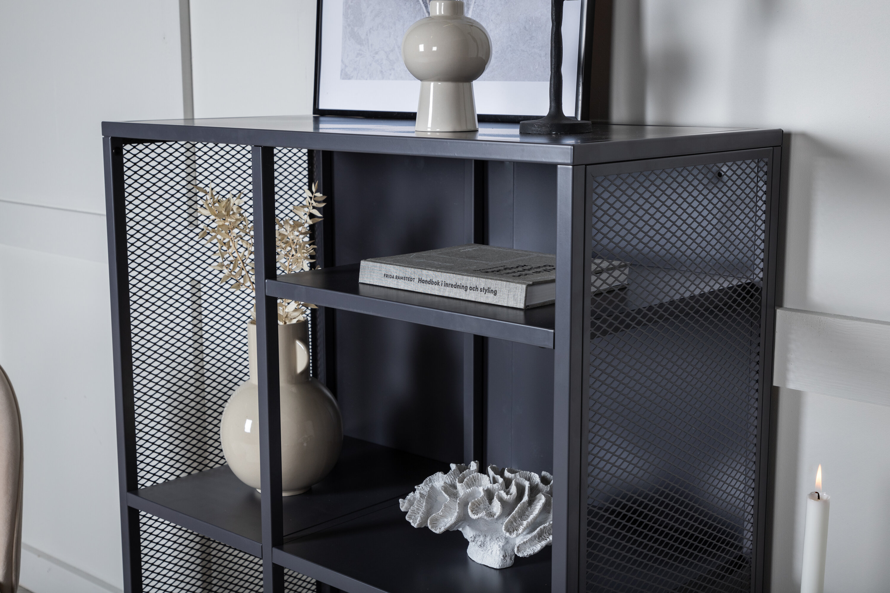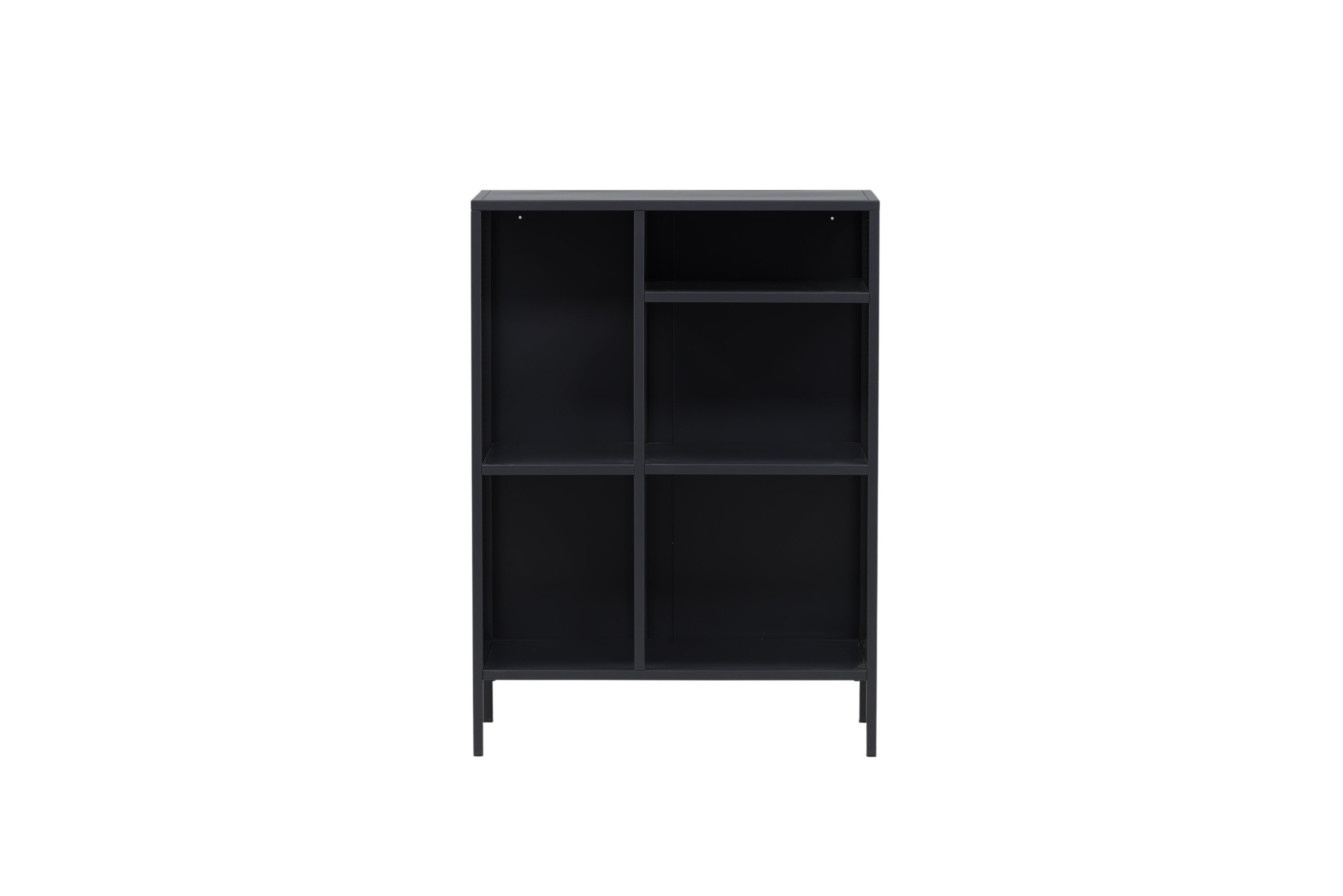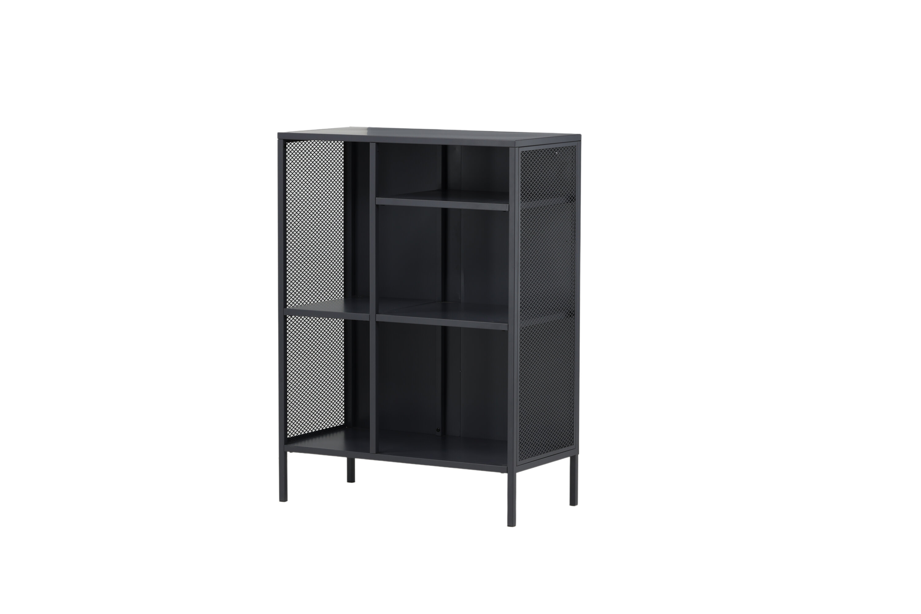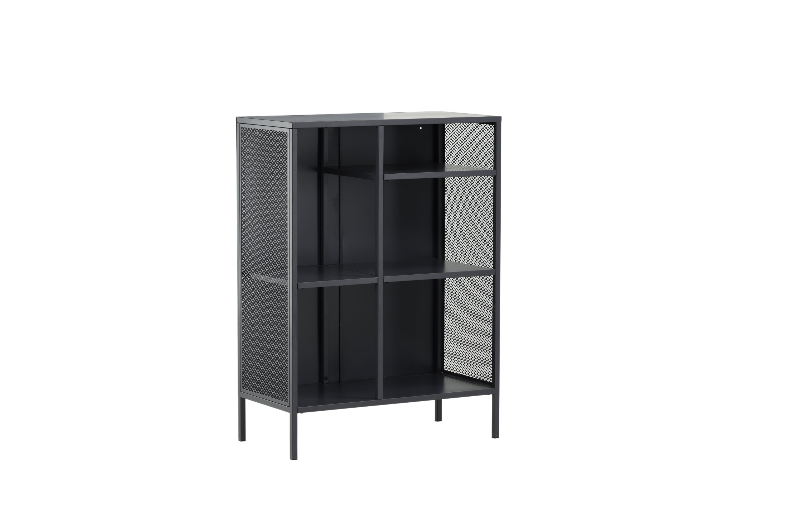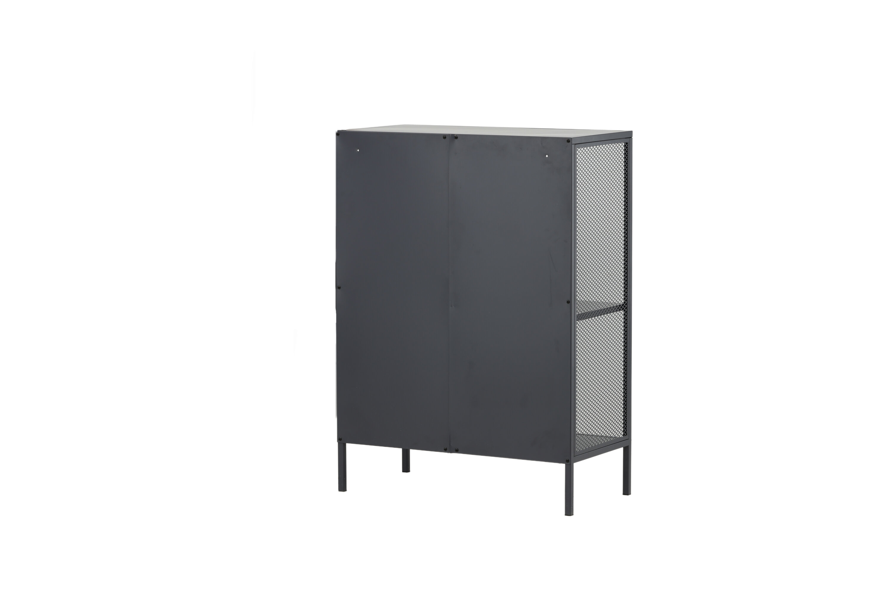 Misha, dans un design industriel robuste en acier gris revêtu de poudre avec trois surfaces en relief à différentes hauteurs. Filets sur les côtés de l'armoire pour une touche supplémentaire, reposant sur 4 pieds gris revêtus de poudre en acier. Dimensions : Longueur : 80 cm, largeur : 40 cm, hauteur : 110 cm. Un assemblage plus léger est requis.