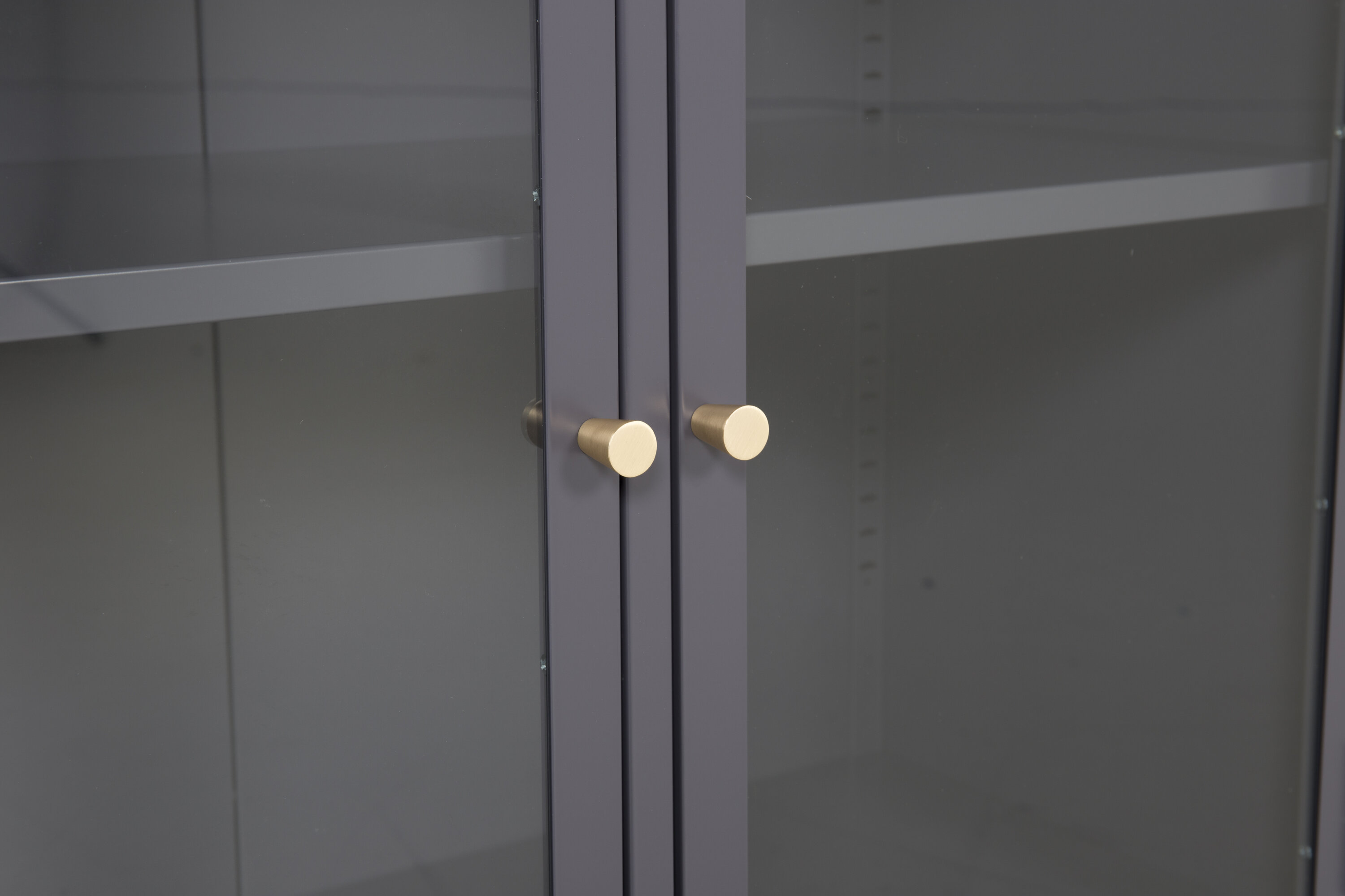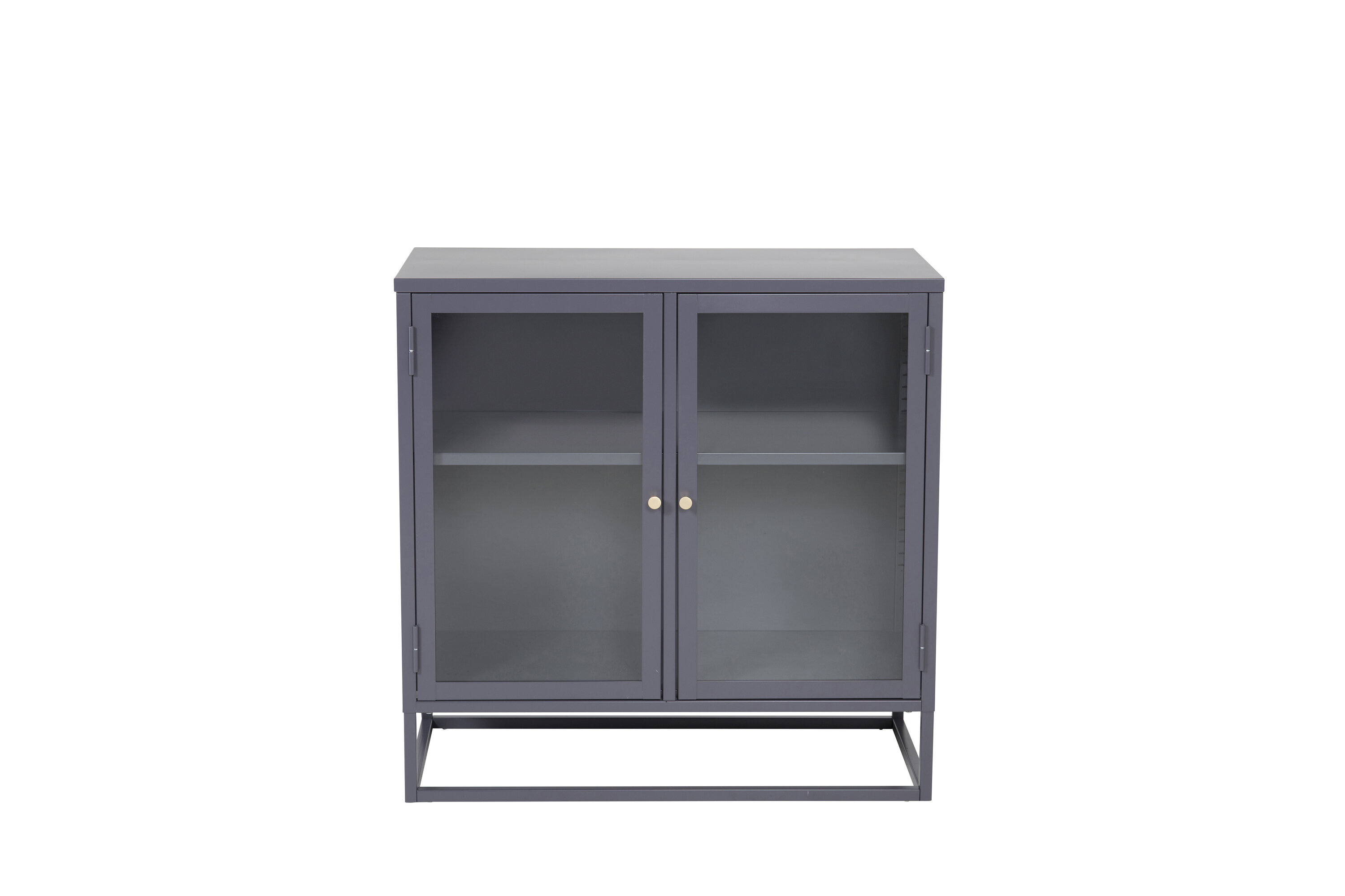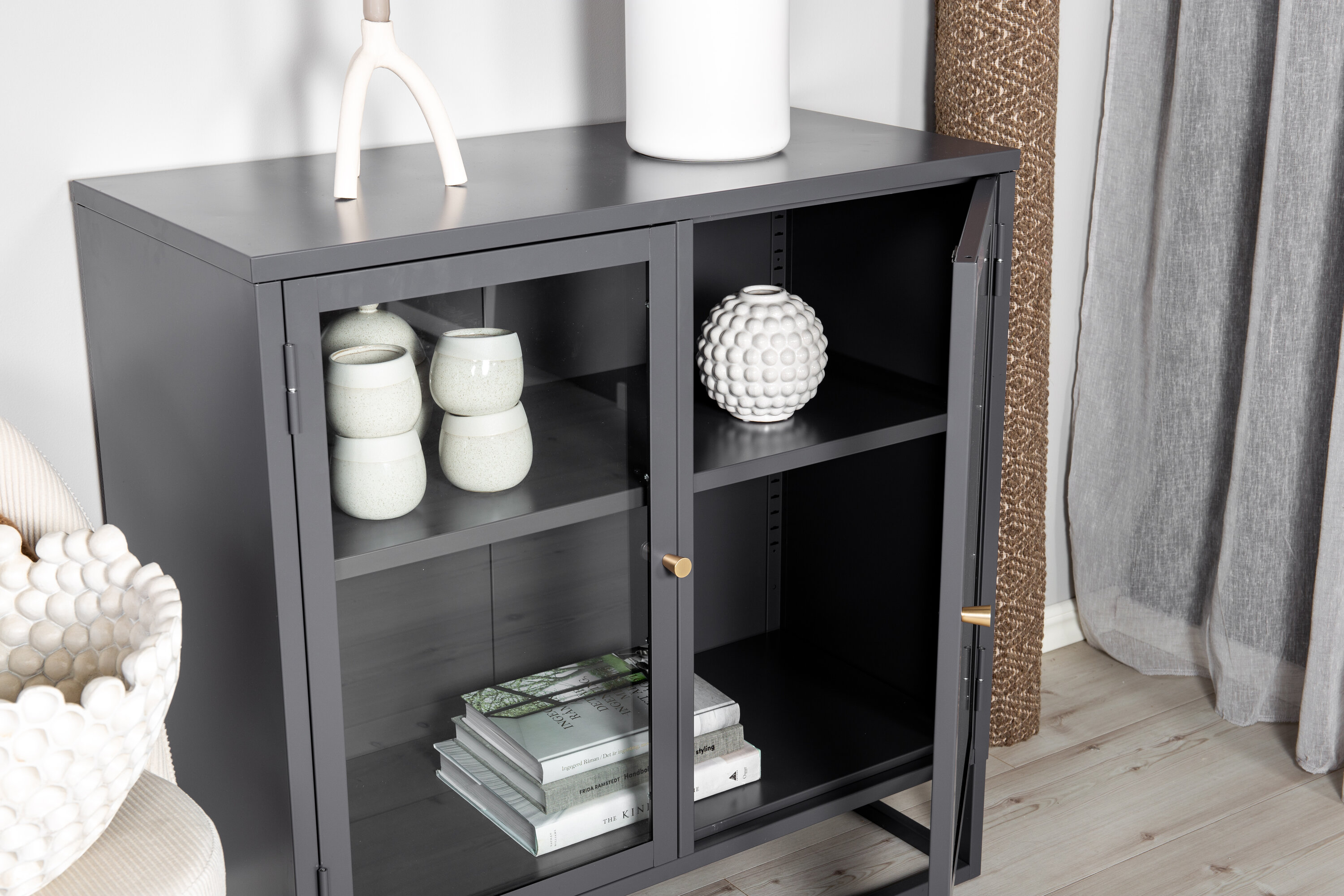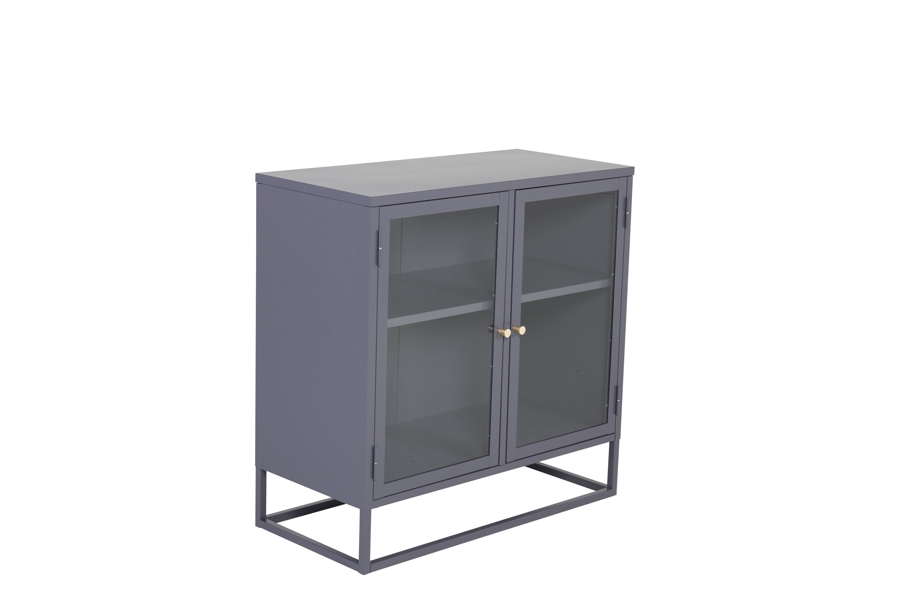 Baktal, dans un design industriel moderne en acier gris clair revêtu de poudre avec deux portes en verre. Un cadre en acier gris clair revêtu de poudre et deux surfaces en relief. Les portes ont des bourgeons de couleur laiton. L'ensemble de l'armoire repose sur un cadre ouvert en acier gris clair revêtu de poudre. Dimensions : Longueur : 85 cm, largeur : 40 cm, hauteur : 85 cm. Un assemblage plus léger est requis.
