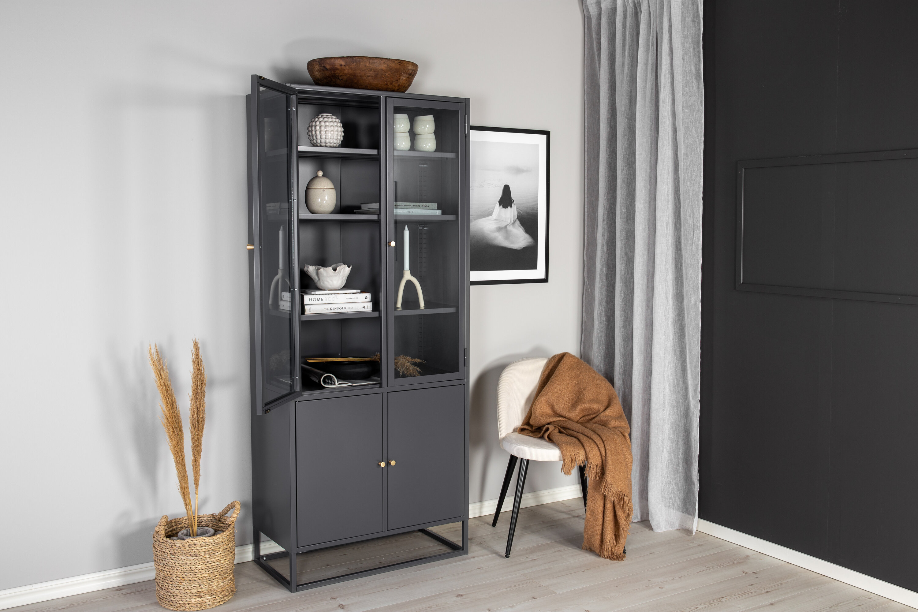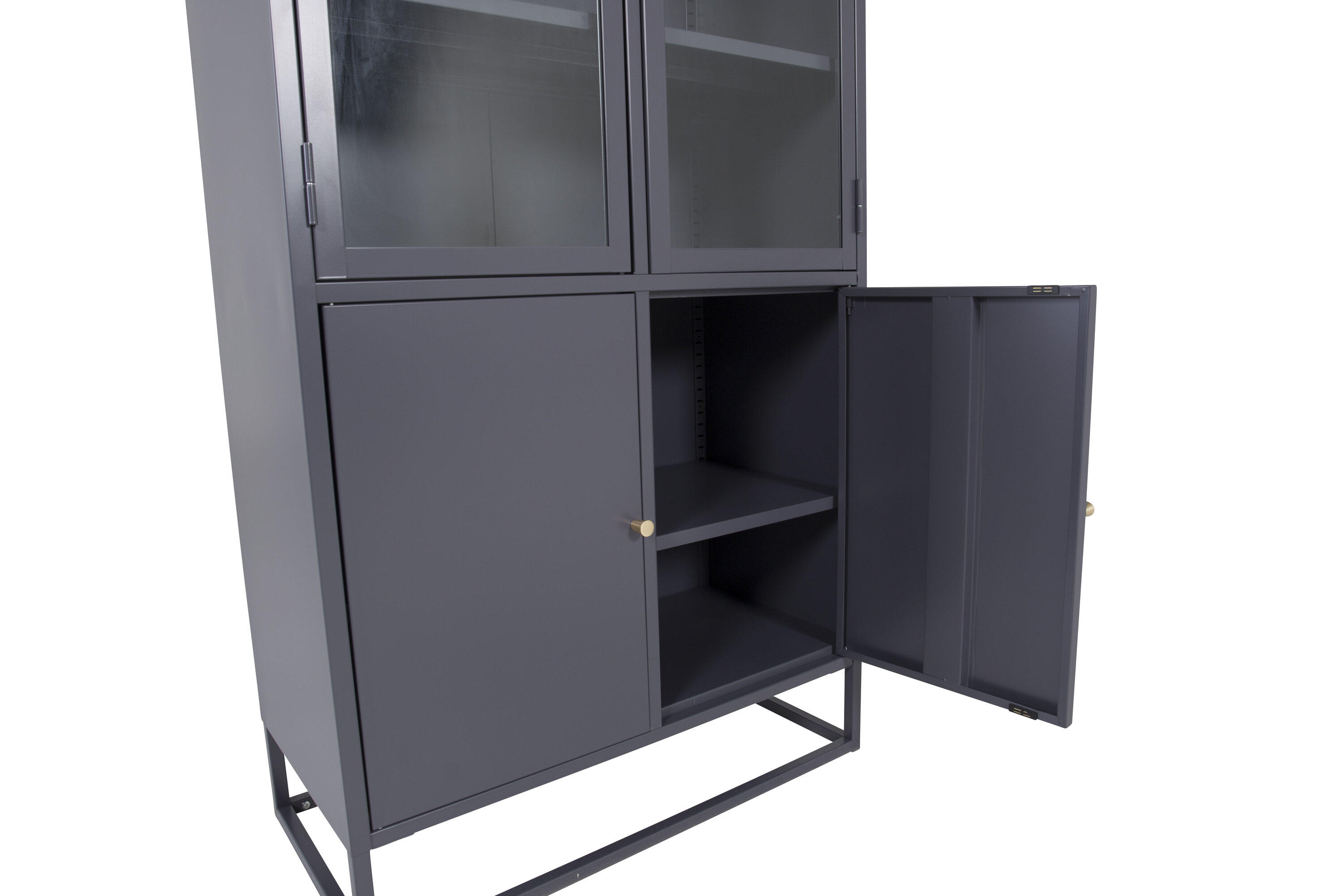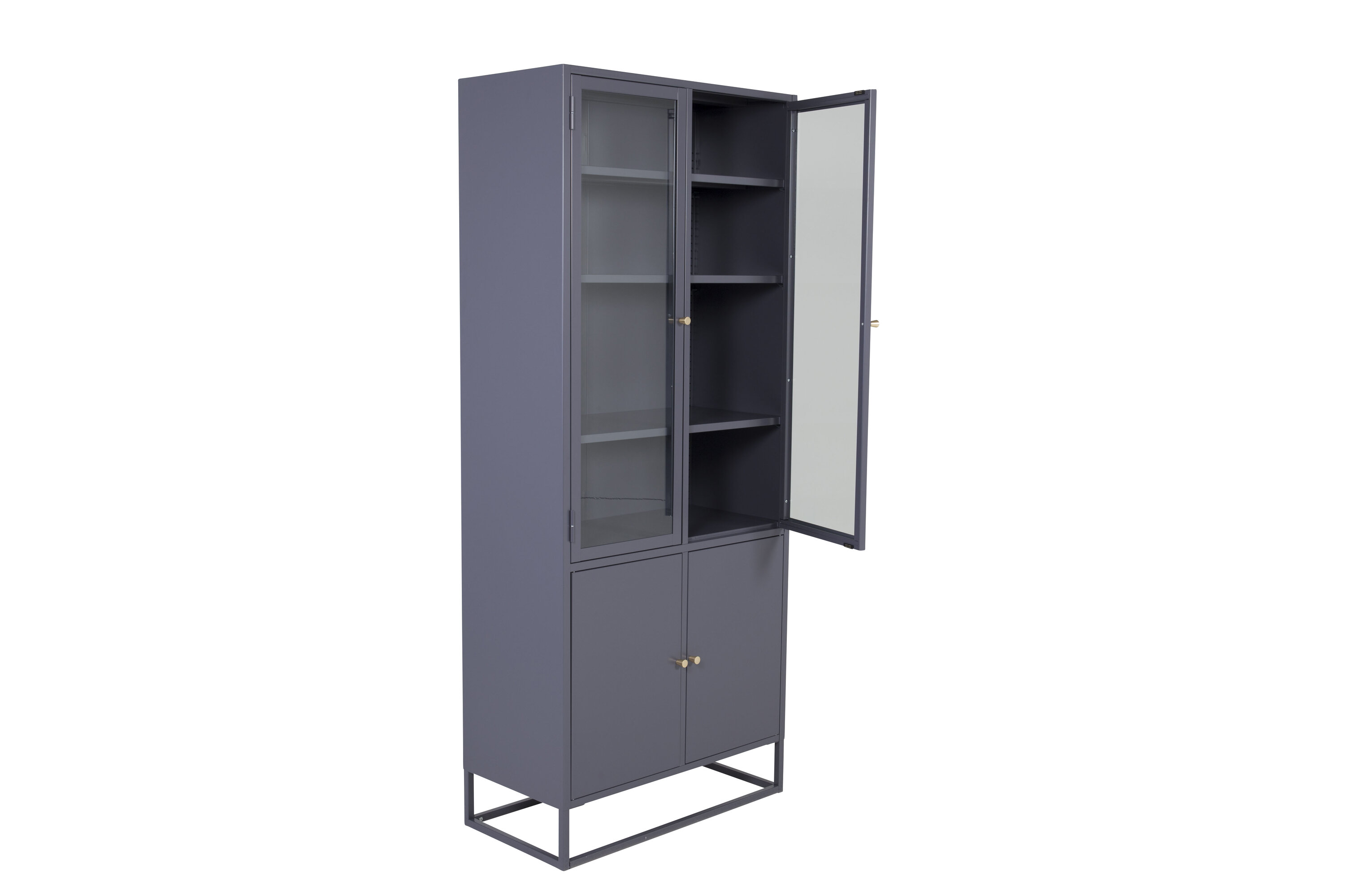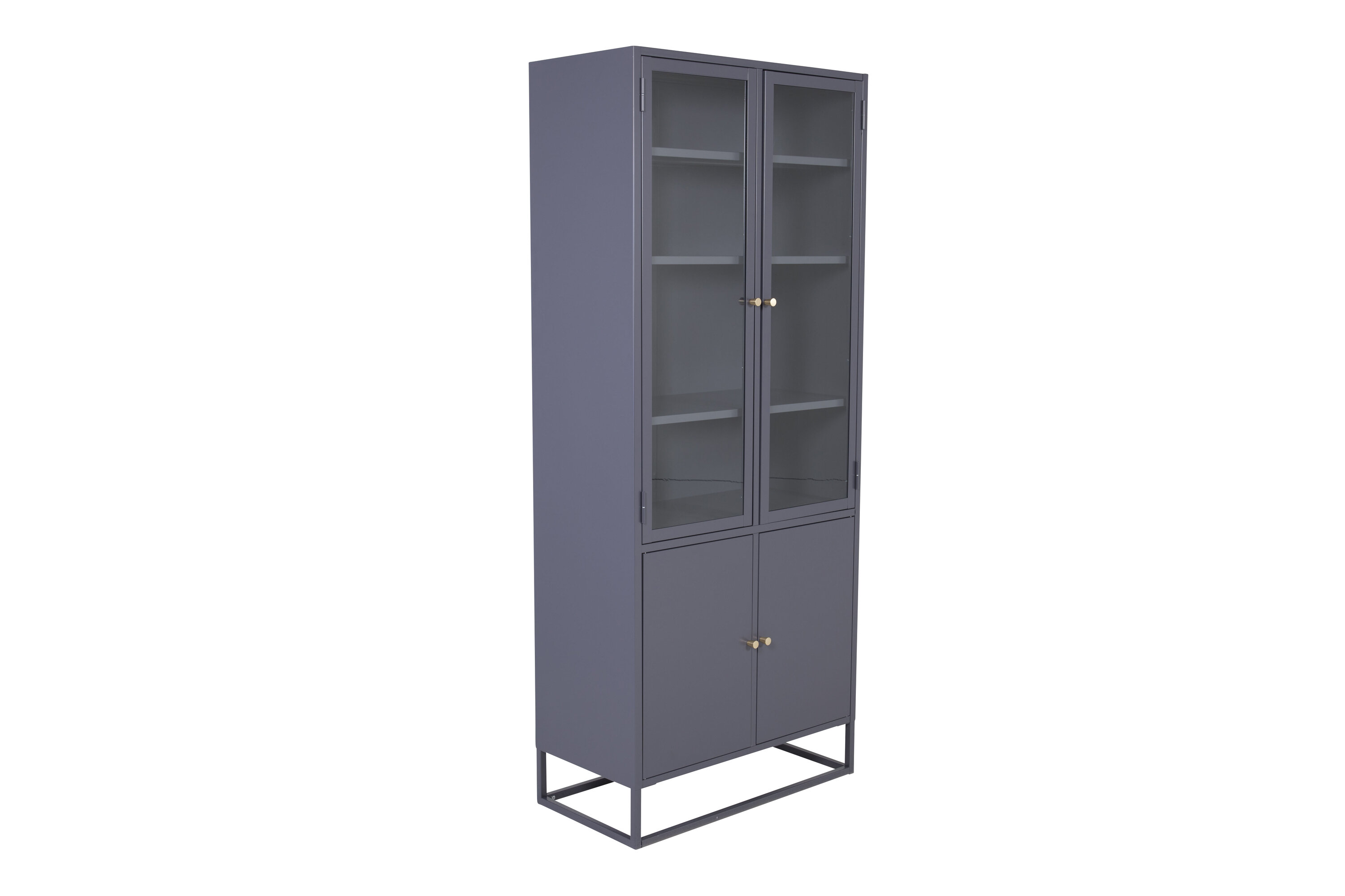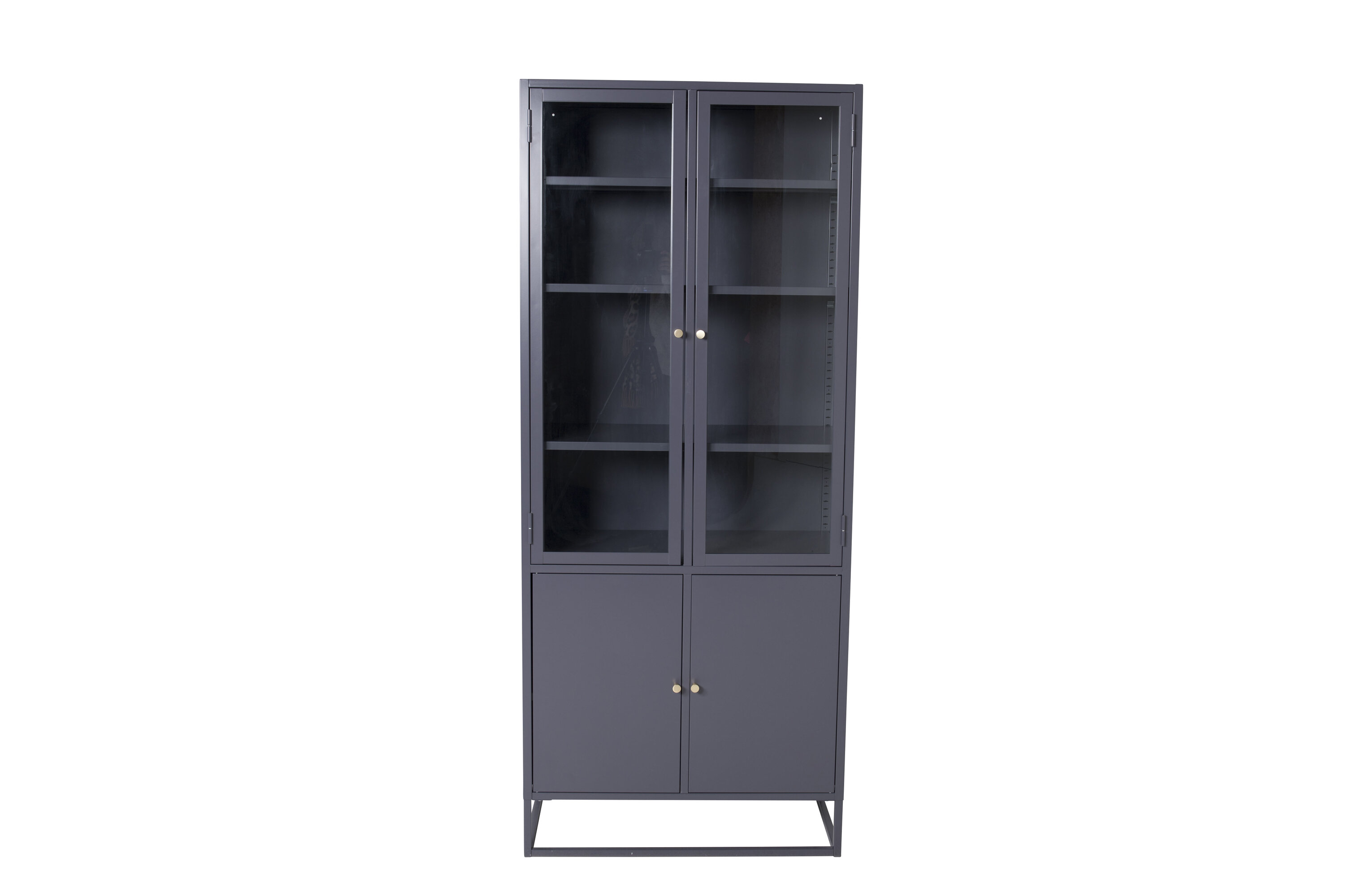 Bakal, au design industriel moderne, en acier gris foncé thermolaqué. La partie supérieure a deux grandes portes en verre avec un cadre en acier gris foncé poudré et quatre étagères. La partie inférieure dispose de deux portes plus courtes avec rangement caché en acier gris foncé thermolaqué et de deux étagères. Toutes les portes ont des boutons de couleur laiton. L'ensemble de l'armoire repose sur un cadre ouvert en acier gris foncé thermolaqué. Dimensions : Longueur : 80 cm, Largeur : 40,5 cm, Hauteur : 190 cm. Assemblage facile requis.