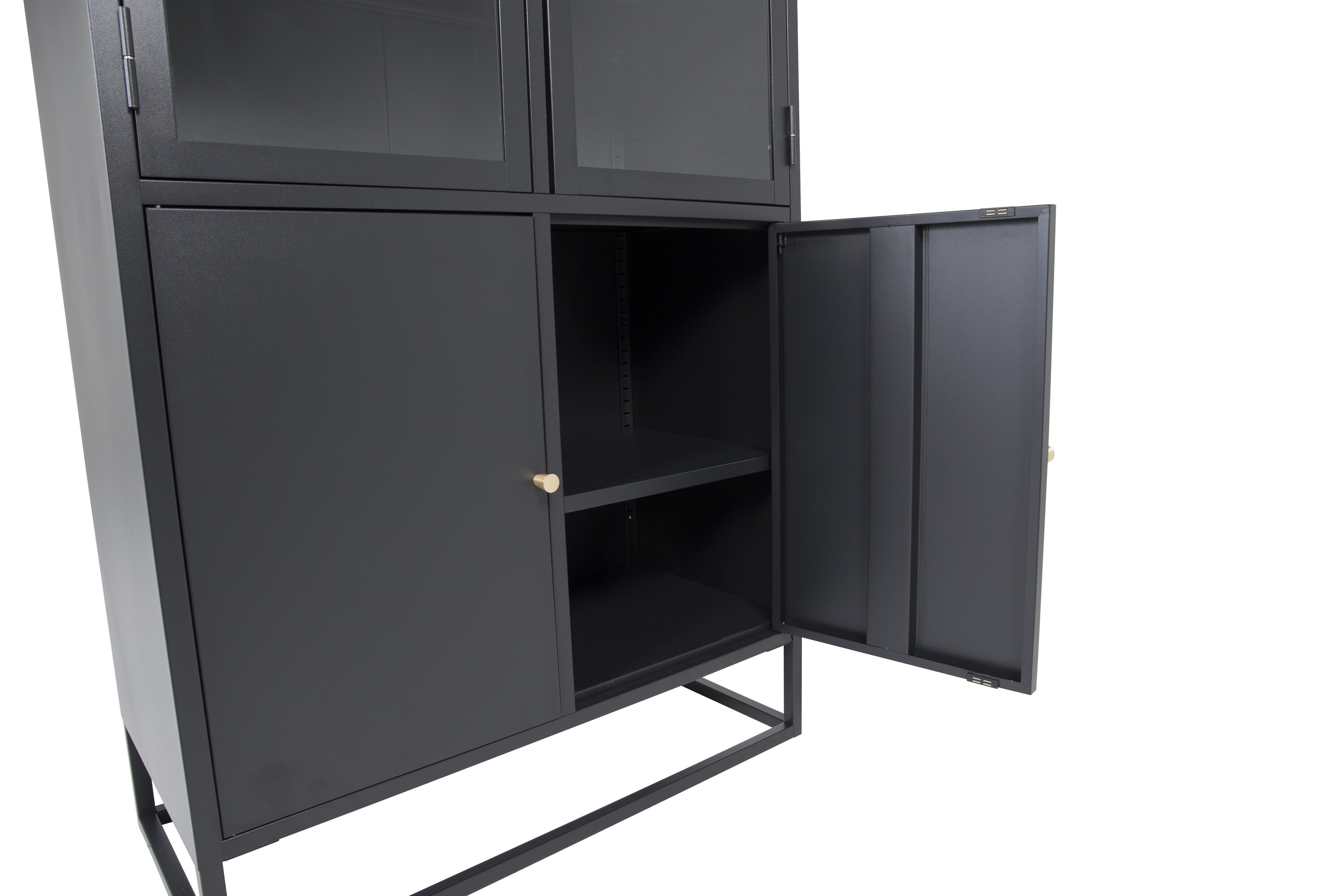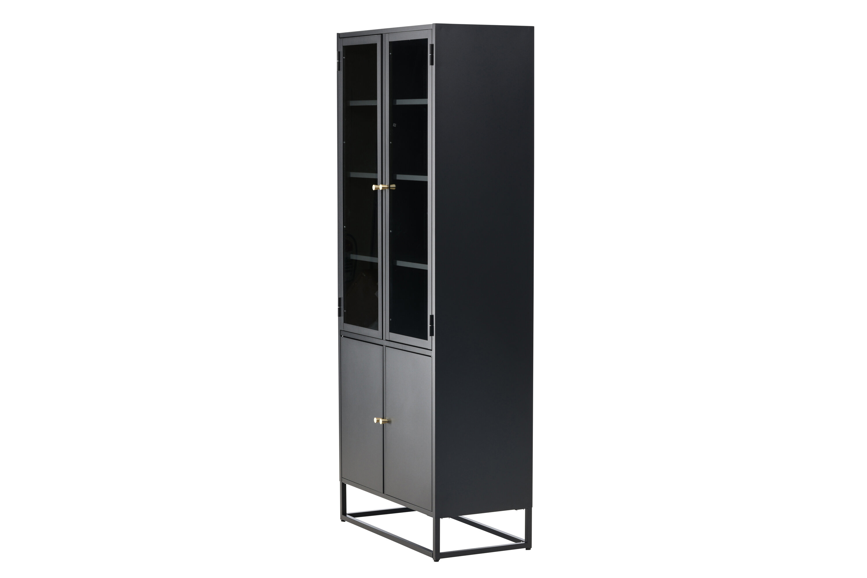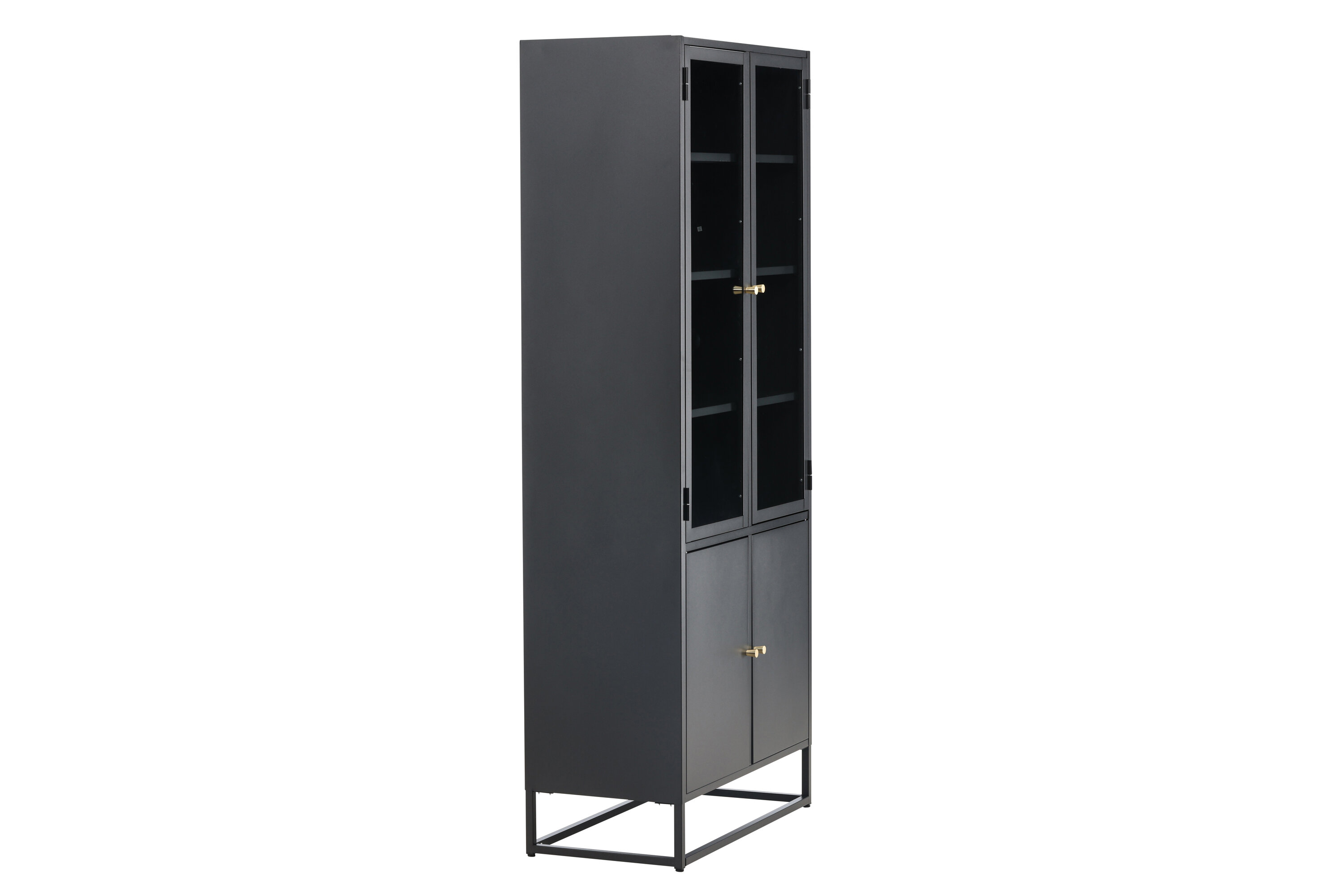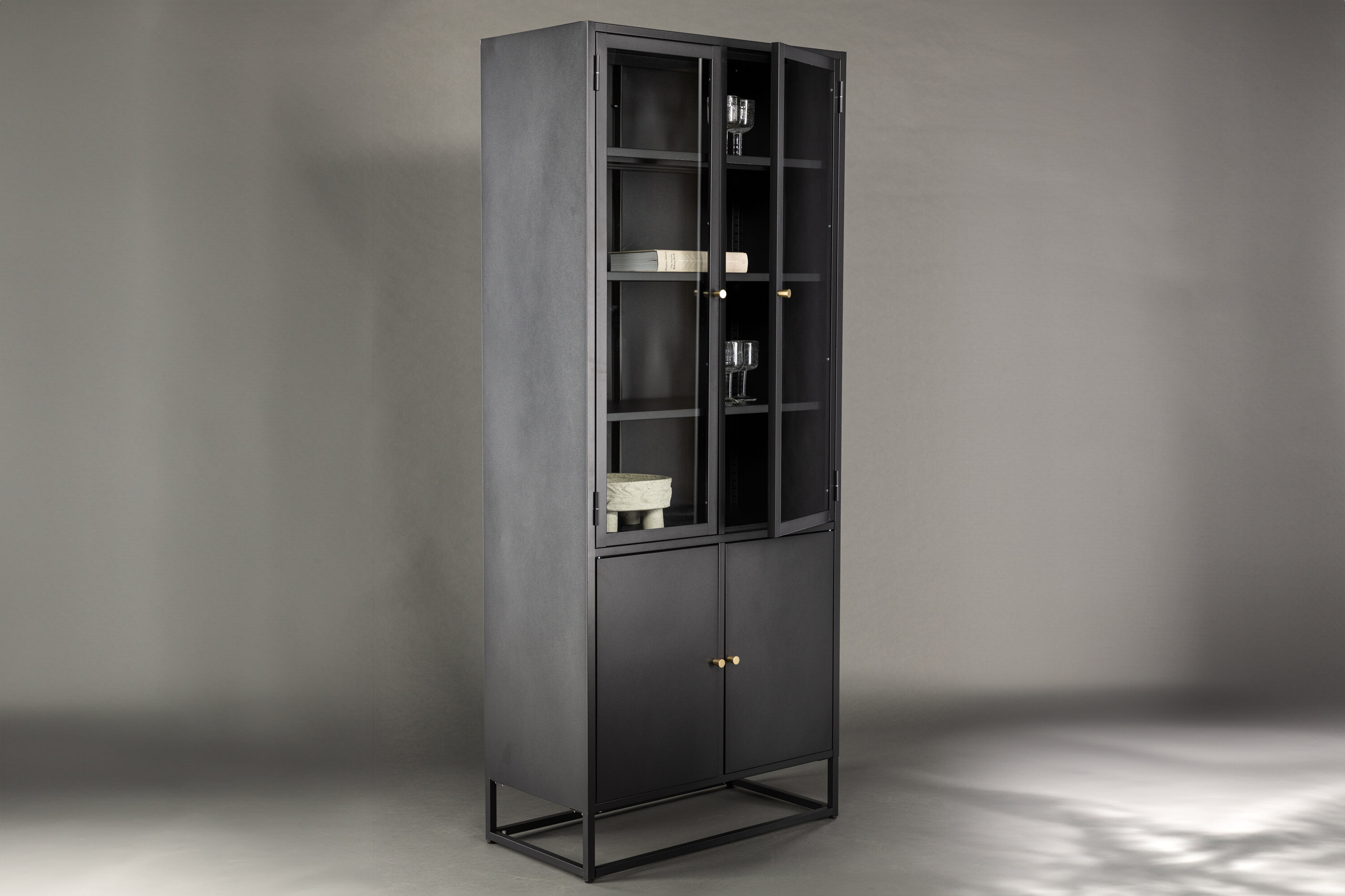 Baktal, dans un design industriel moderne en acier noir revêtu de poudre. La tige avec deux grandes portes en verre avec un cadre en acier noir revêtu de poudre et quatre surfaces en relief. La partie inférieure avec deux portes inférieures à rangement caché en acier noir thermolaqué avec deux surfaces en relief. Toutes les portes ont des boutons de couleur laiton. L'ensemble de l'armoire repose sur un cadre ouvert en acier revêtu de poudre noire. Dimensions : Longueur : 80 cm, largeur : 40,5 cm, hauteur : 190 cm. Un assemblage plus léger est requis.