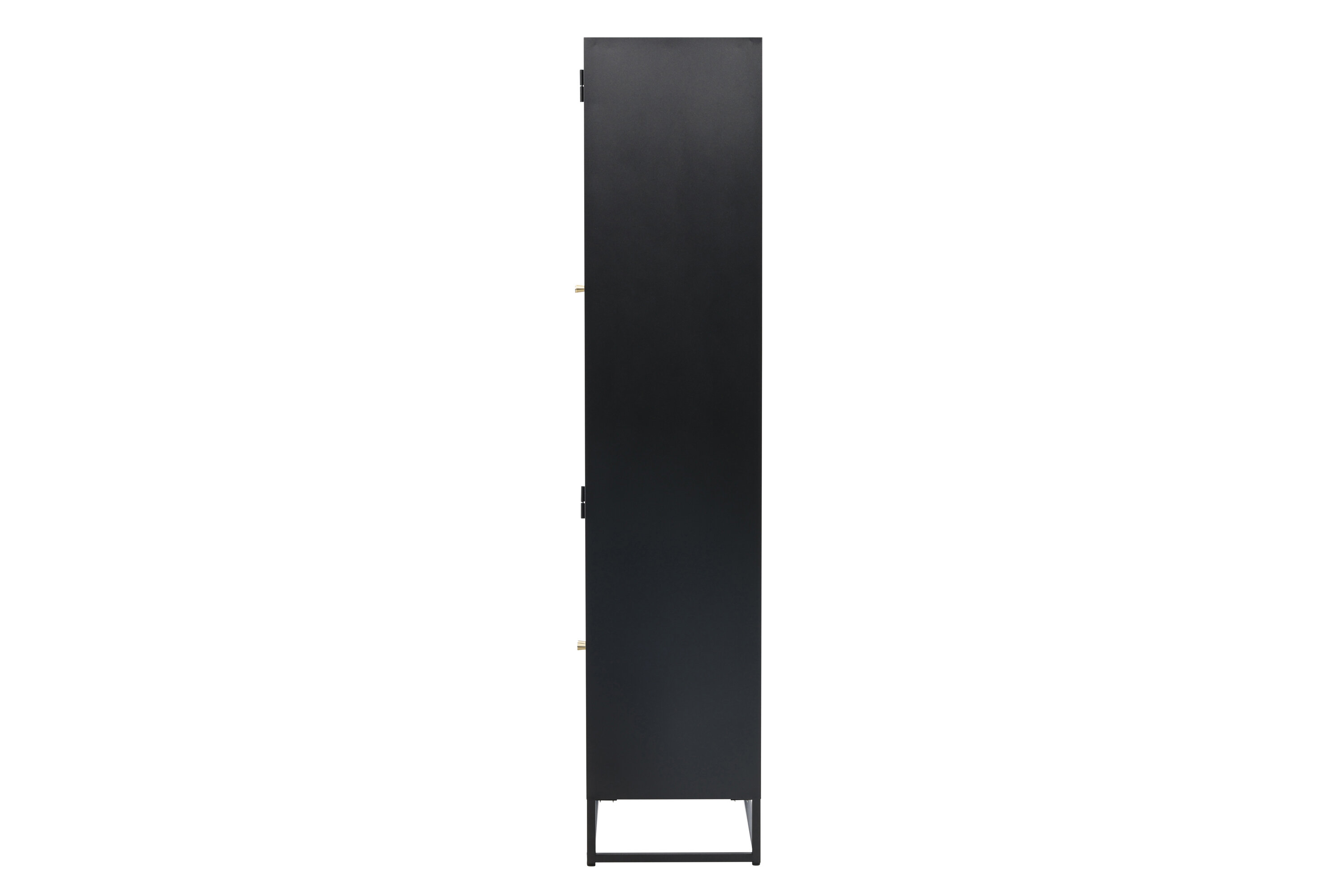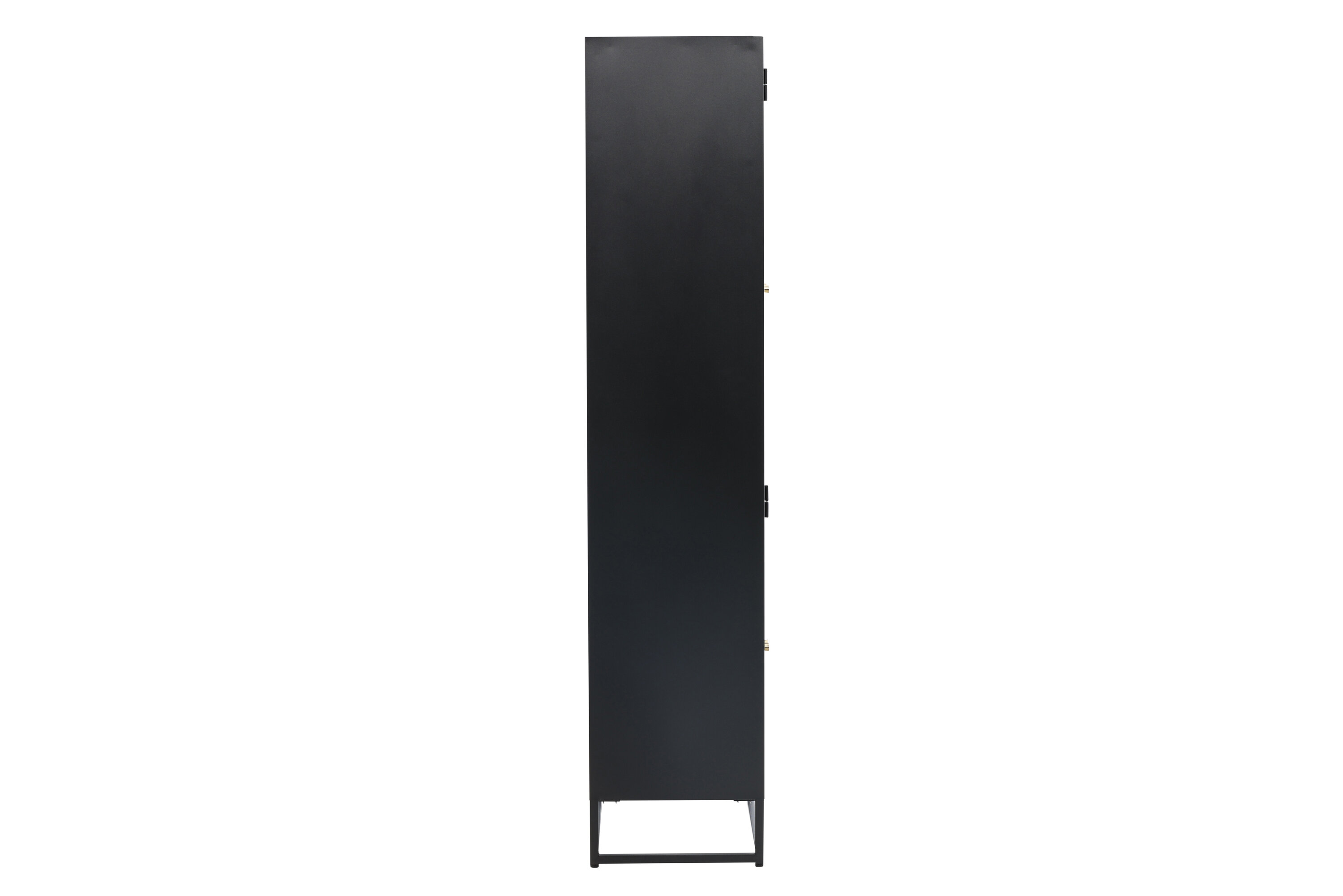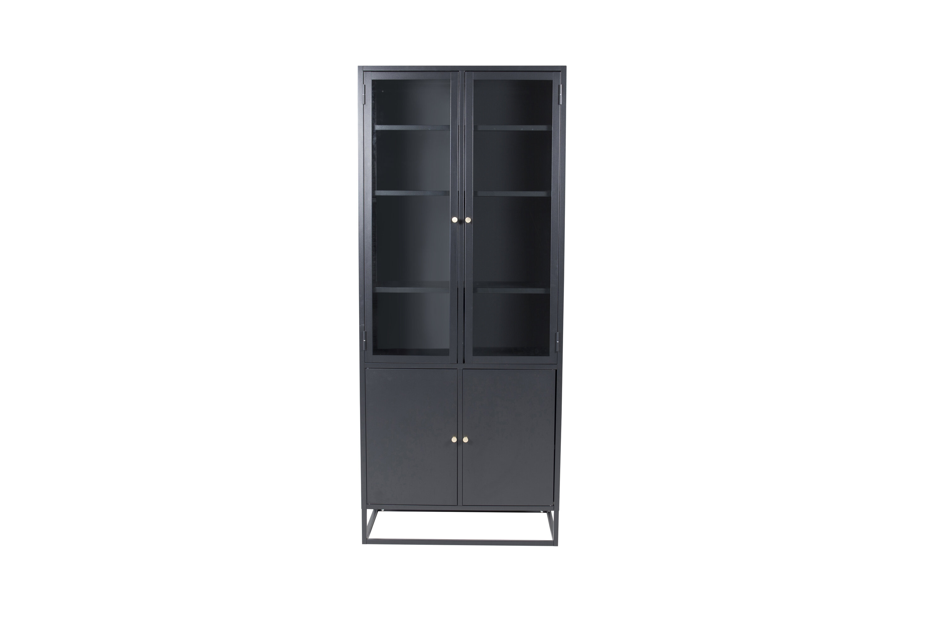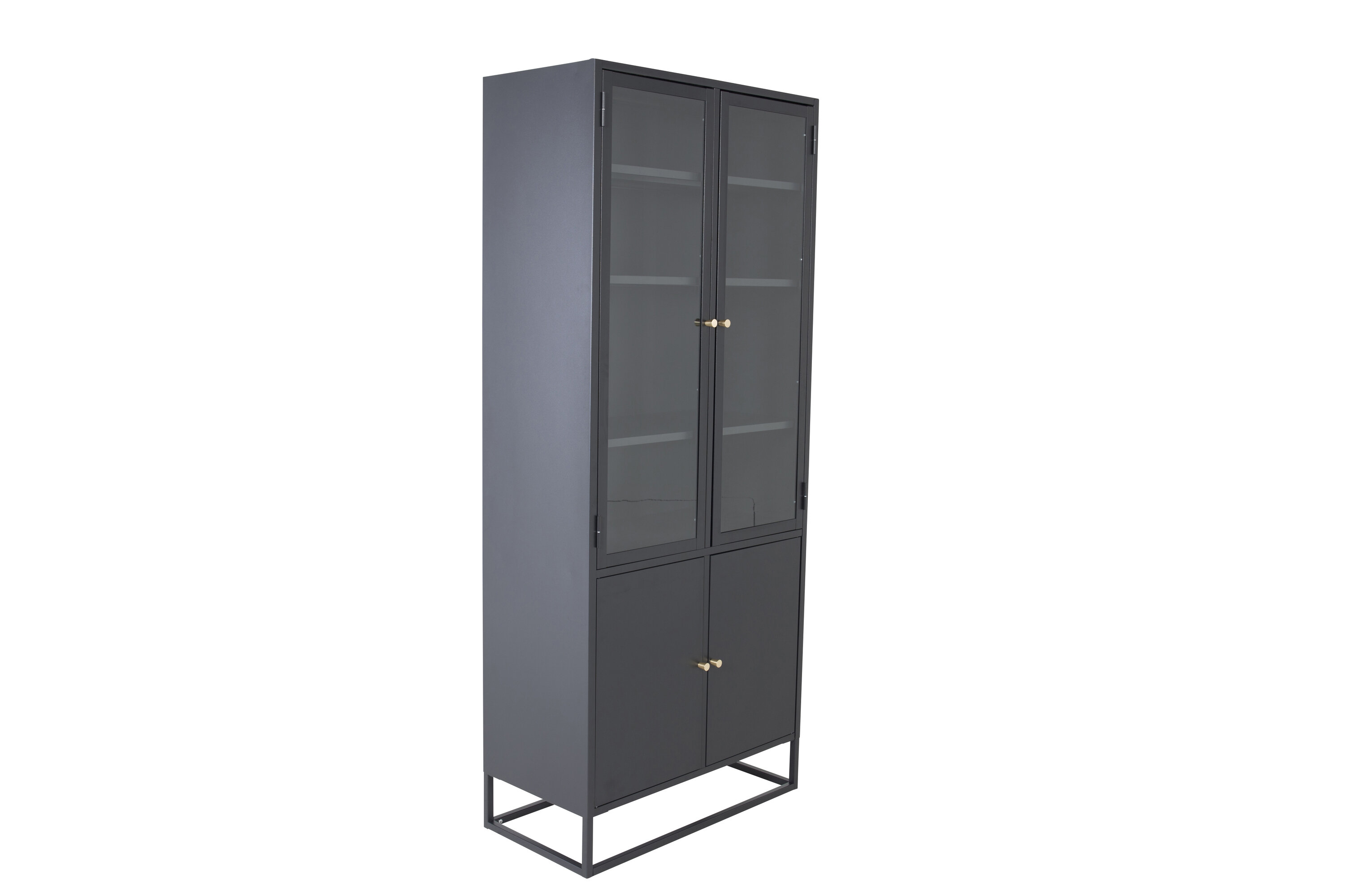 Baktal, dans un design industriel moderne en acier noir revêtu de poudre. La tige avec deux grandes portes en verre avec un cadre en acier noir revêtu de poudre et quatre surfaces en relief. La partie inférieure avec deux portes inférieures à rangement caché en acier noir thermolaqué avec deux surfaces en relief. Toutes les portes ont des boutons de couleur laiton. L'ensemble de l'armoire repose sur un cadre ouvert en acier revêtu de poudre noire. Dimensions : Longueur : 80 cm, largeur : 40,5 cm, hauteur : 190 cm. Un assemblage plus léger est requis.
