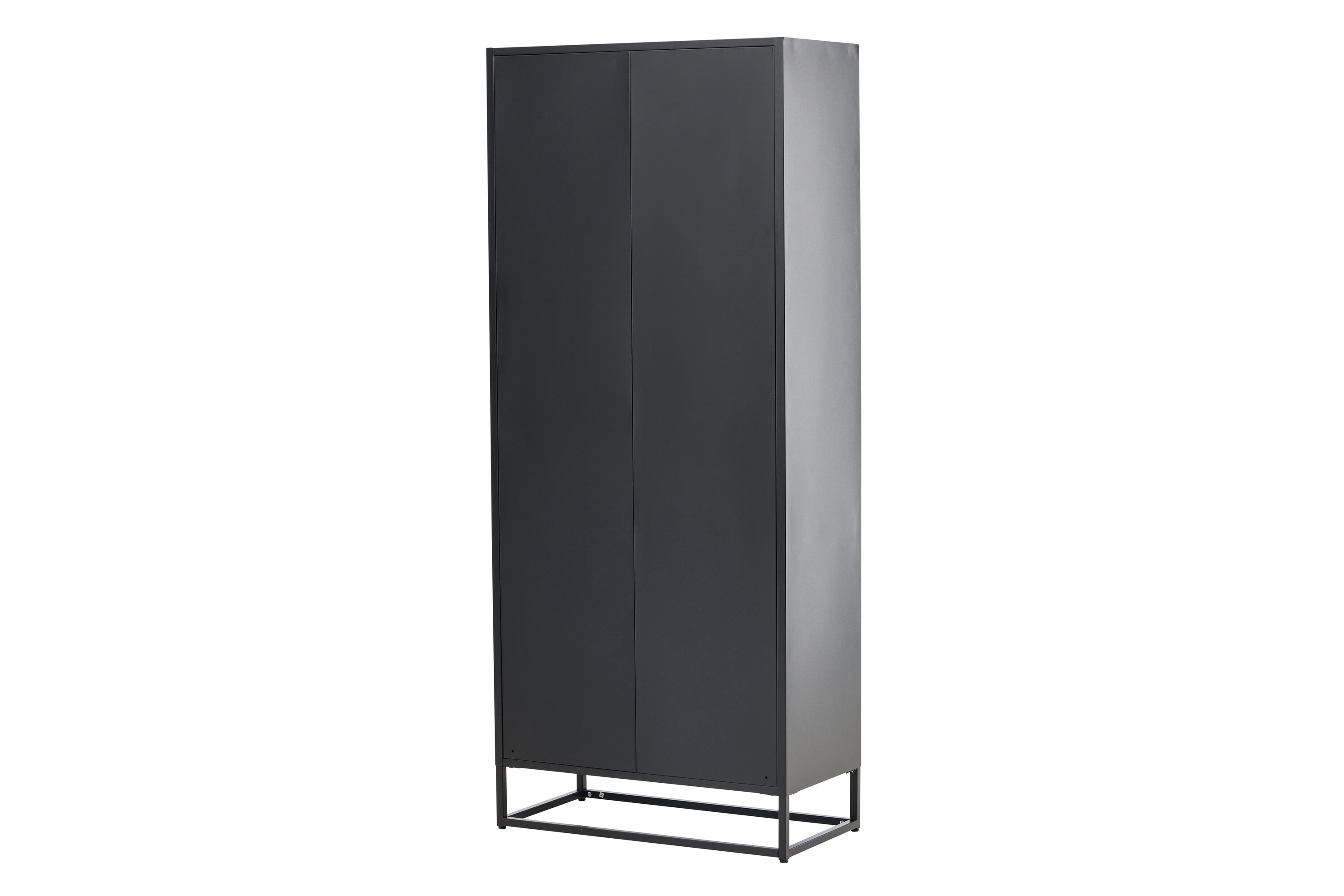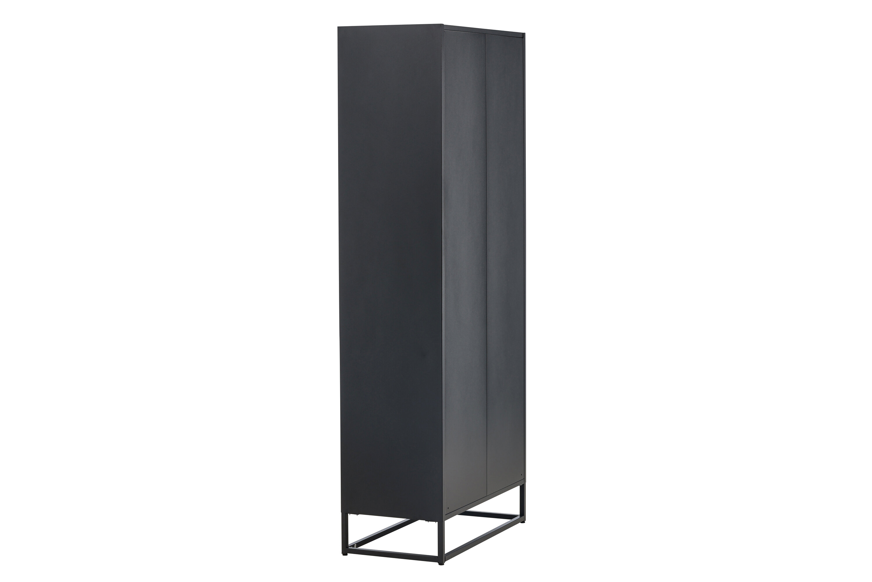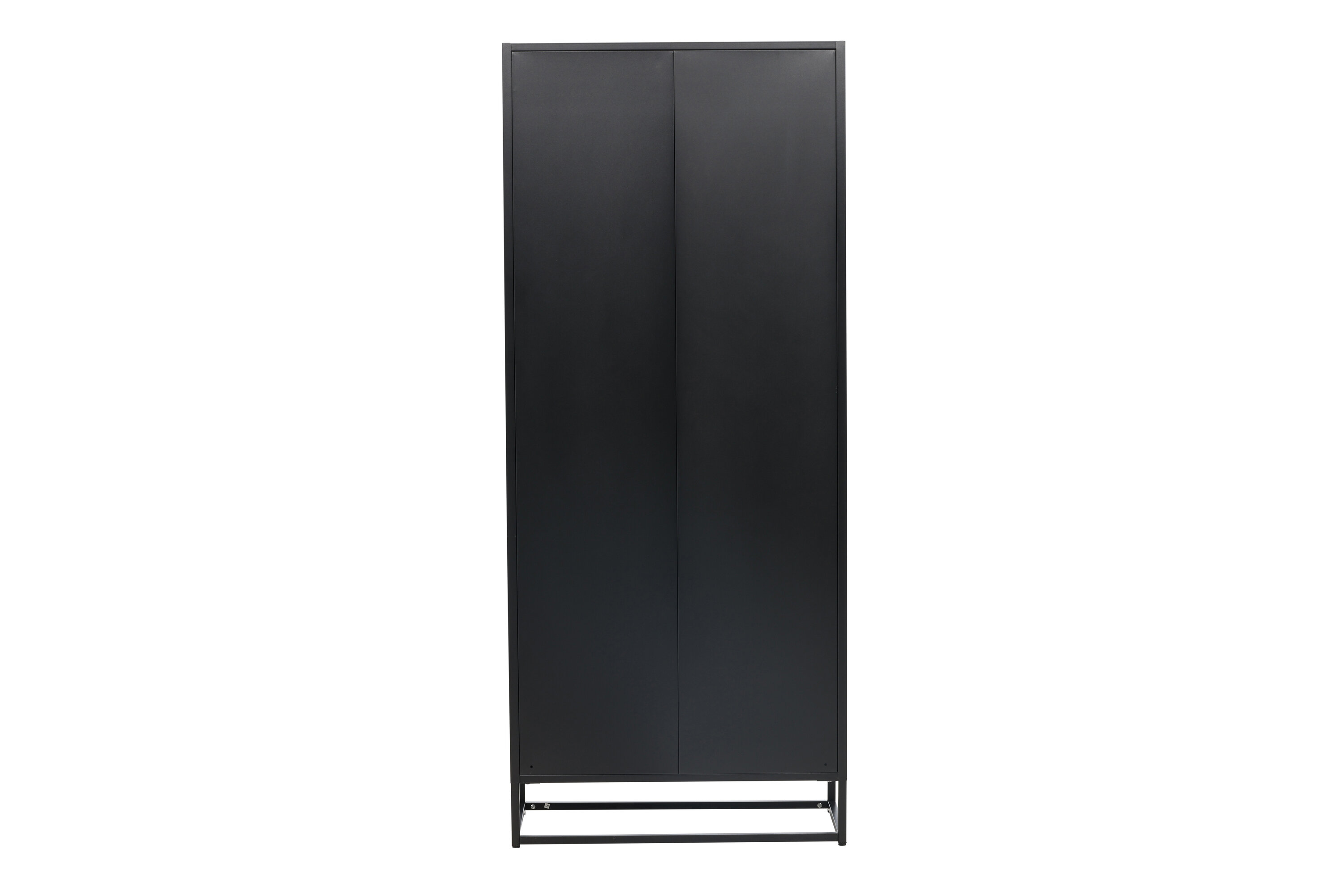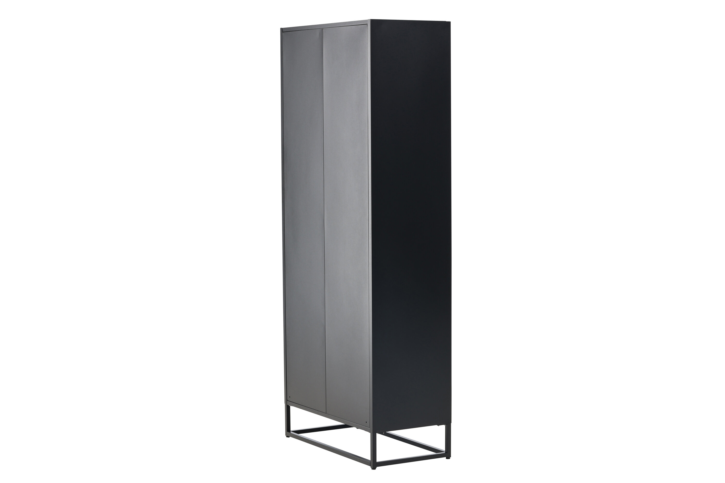 Baktal, dans un design industriel moderne en acier noir revêtu de poudre. La tige avec deux grandes portes en verre avec un cadre en acier noir revêtu de poudre et quatre surfaces en relief. La partie inférieure avec deux portes inférieures à rangement caché en acier noir thermolaqué avec deux surfaces en relief. Toutes les portes ont des boutons de couleur laiton. L'ensemble de l'armoire repose sur un cadre ouvert en acier revêtu de poudre noire. Dimensions : Longueur : 80 cm, largeur : 40,5 cm, hauteur : 190 cm. Un assemblage plus léger est requis.