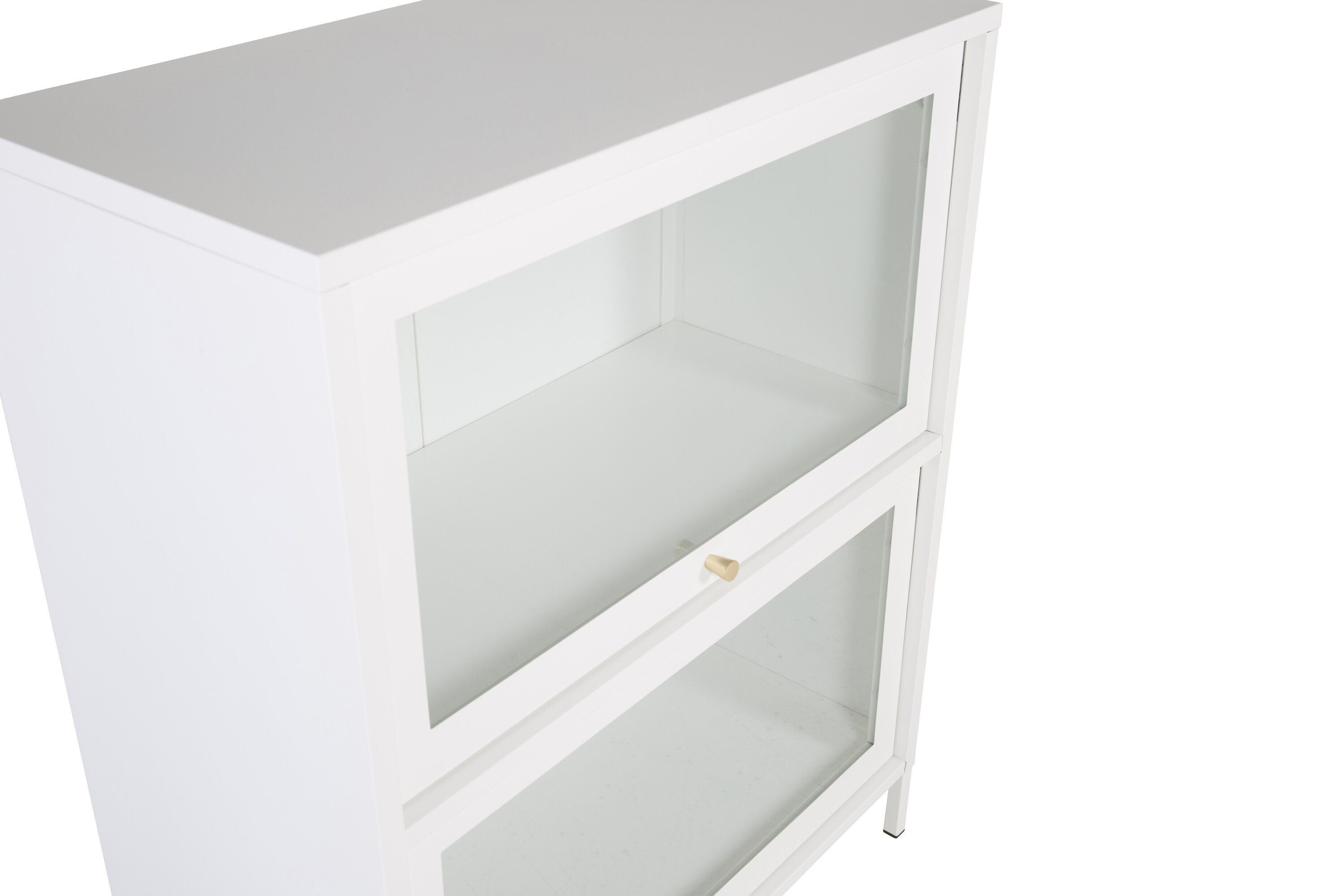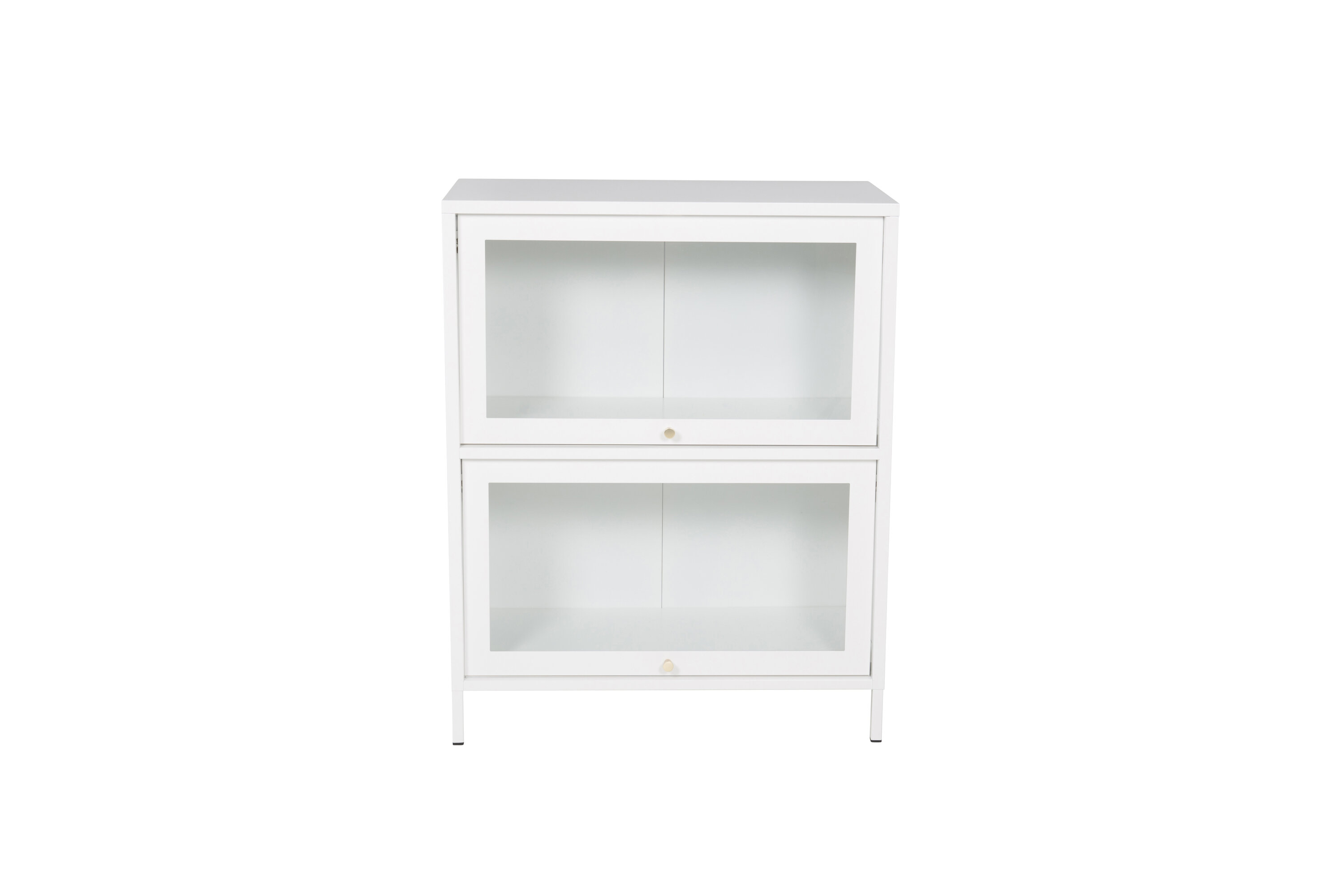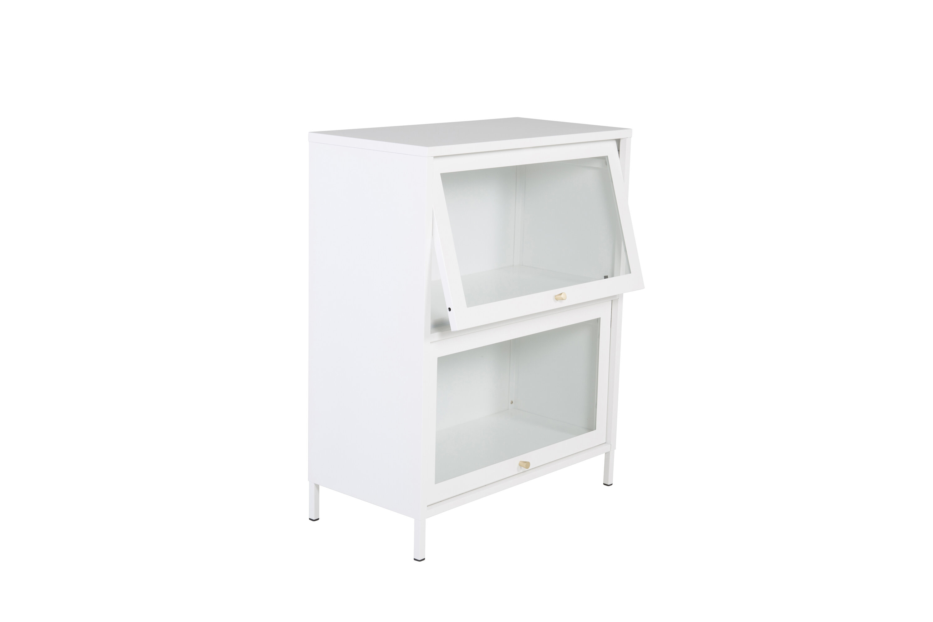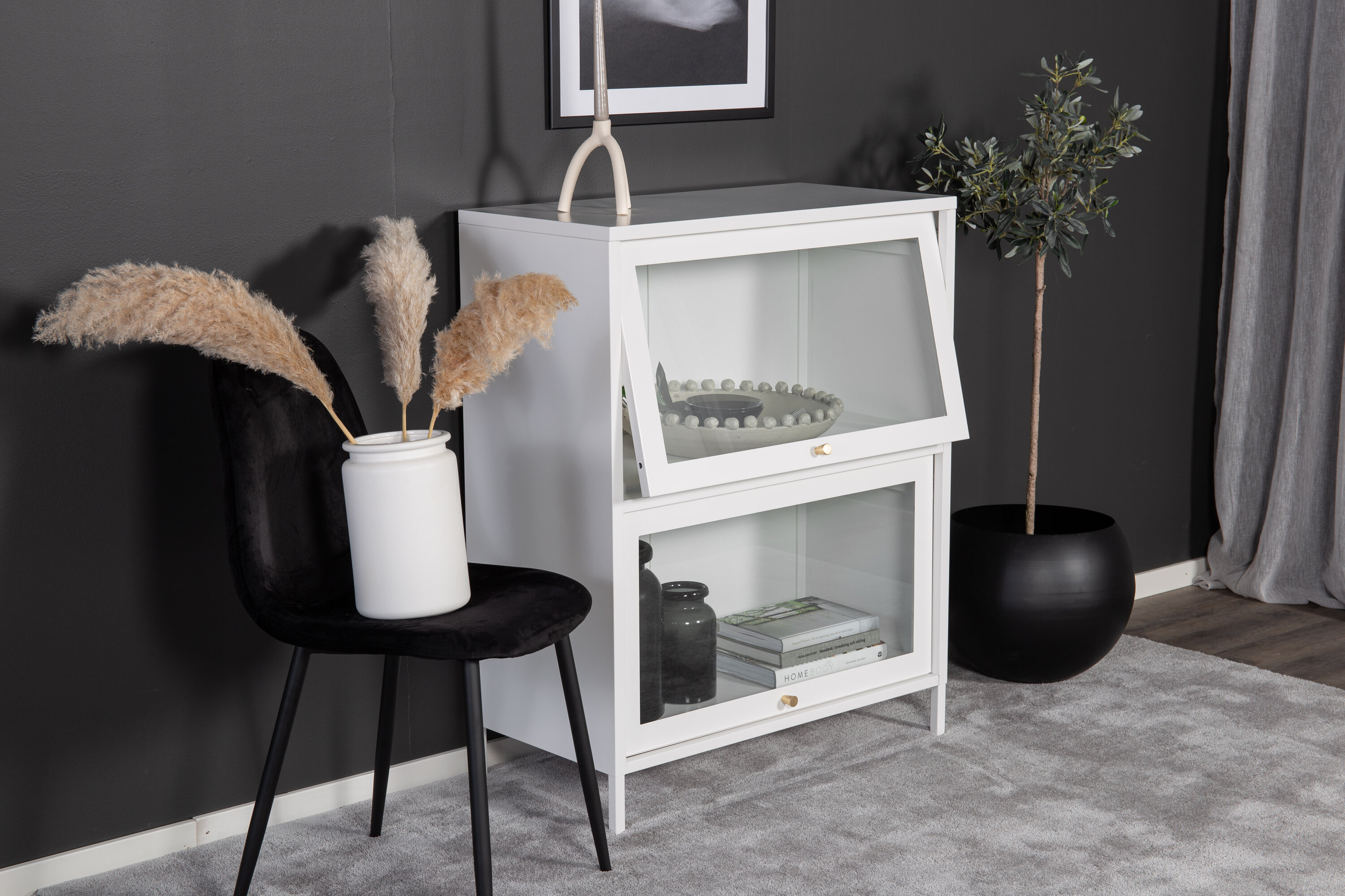 Baktal, dans un design industriel moderne en acier blanc revêtu de poudre avec deux portes en verre. Un cadre en acier blanc revêtu de poudre et des bourgeons de couleur laiton. Les portes vitrées s'ouvrent vers le haut. Le présentoir repose sur quatre pieds en acier blanc thermolaqué. Dimensions : Longueur : 80 cm, largeur : 40 cm, hauteur : 100 cm. Un assemblage plus léger est requis.