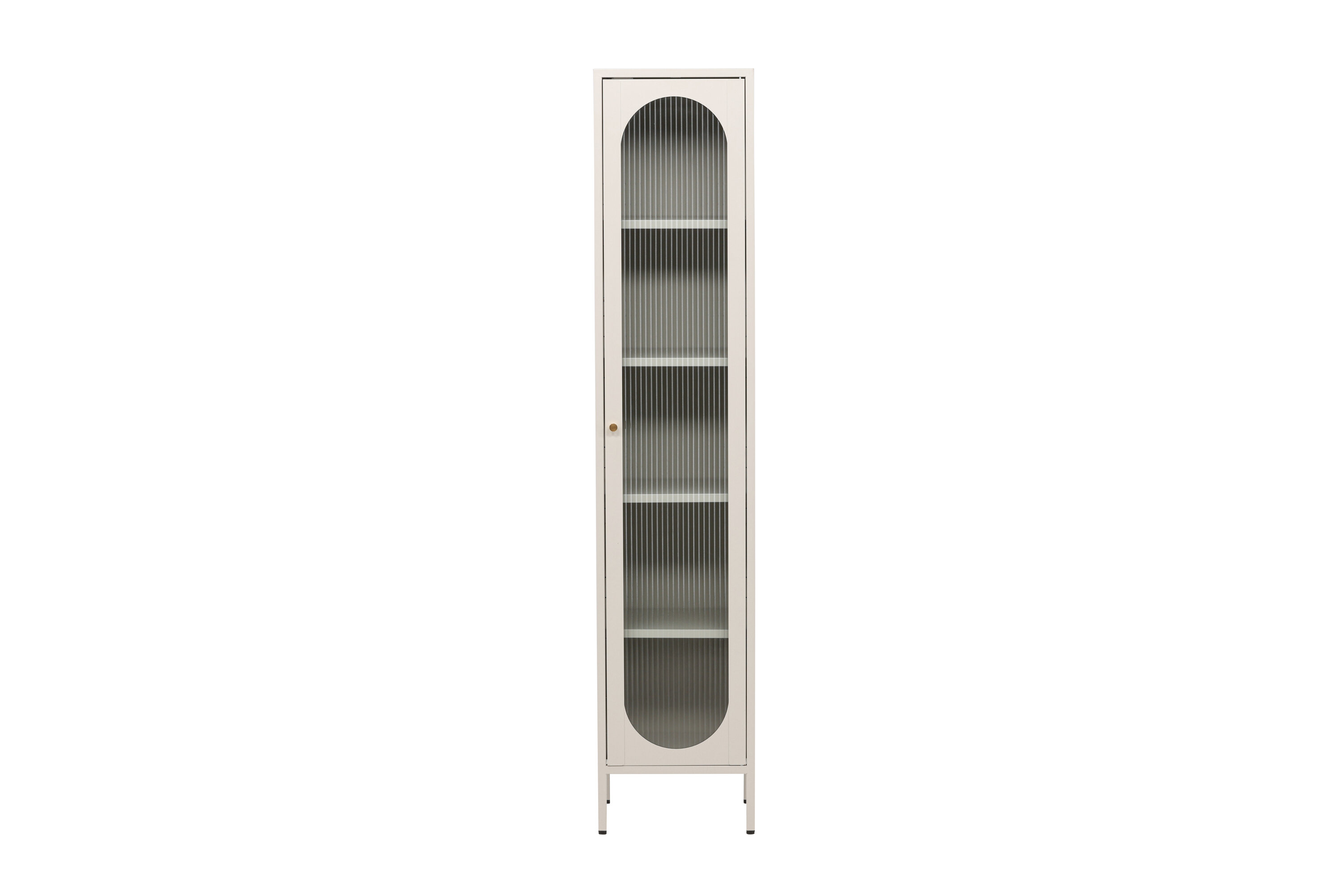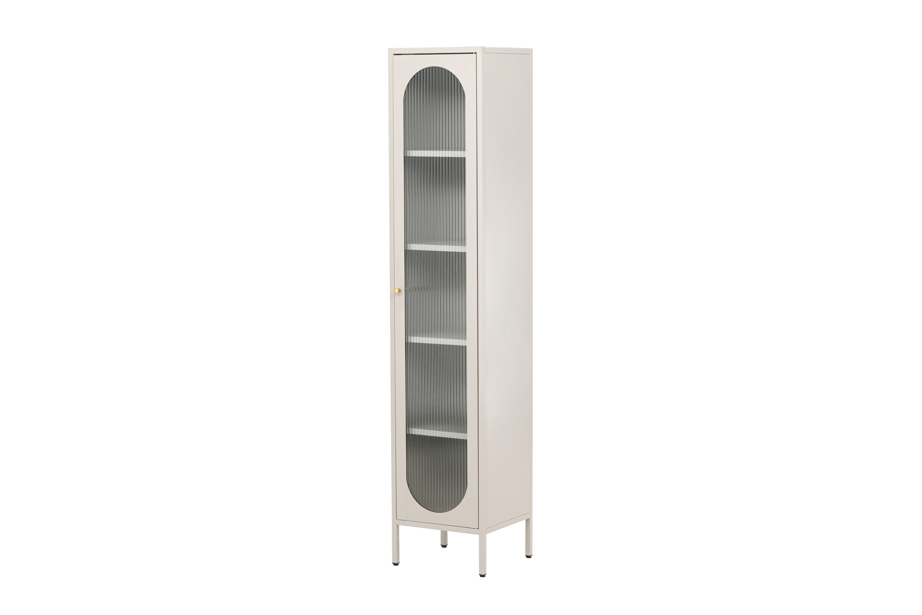 L'armoire est équipée de quatre étagères spacieuses, offrant beaucoup d'espace pour l'organisation. La porte de l'armoire est en verre ondulé, ajoutant une touche subtile de texture et une dimension visuelle unique au mobilier.