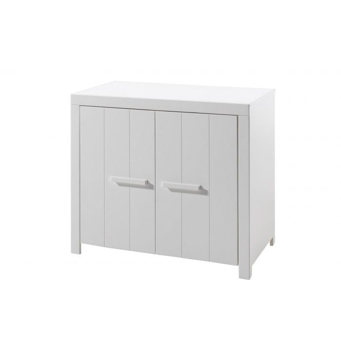 This ERIK chest of 2 doors in white is made out of lacquered MDF and solid pine. The vertical grooves gives it a finiqhing touch and there's a soft-close system on the doors.