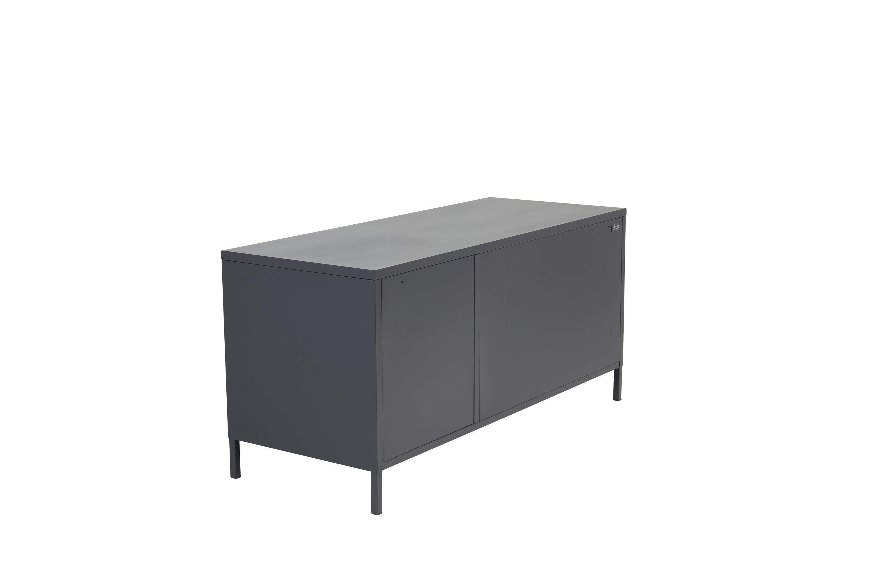 Acero, en acier noir thermolaqué au design industriel avec trois portes en verre clair. Cadre en acier noir poudré, poignée argentée et étagère amovible. Dimensions : Longueur : 80 cm, largeur : 43 cm, hauteur : 97 cm. Un assemblage plus léger est requis.