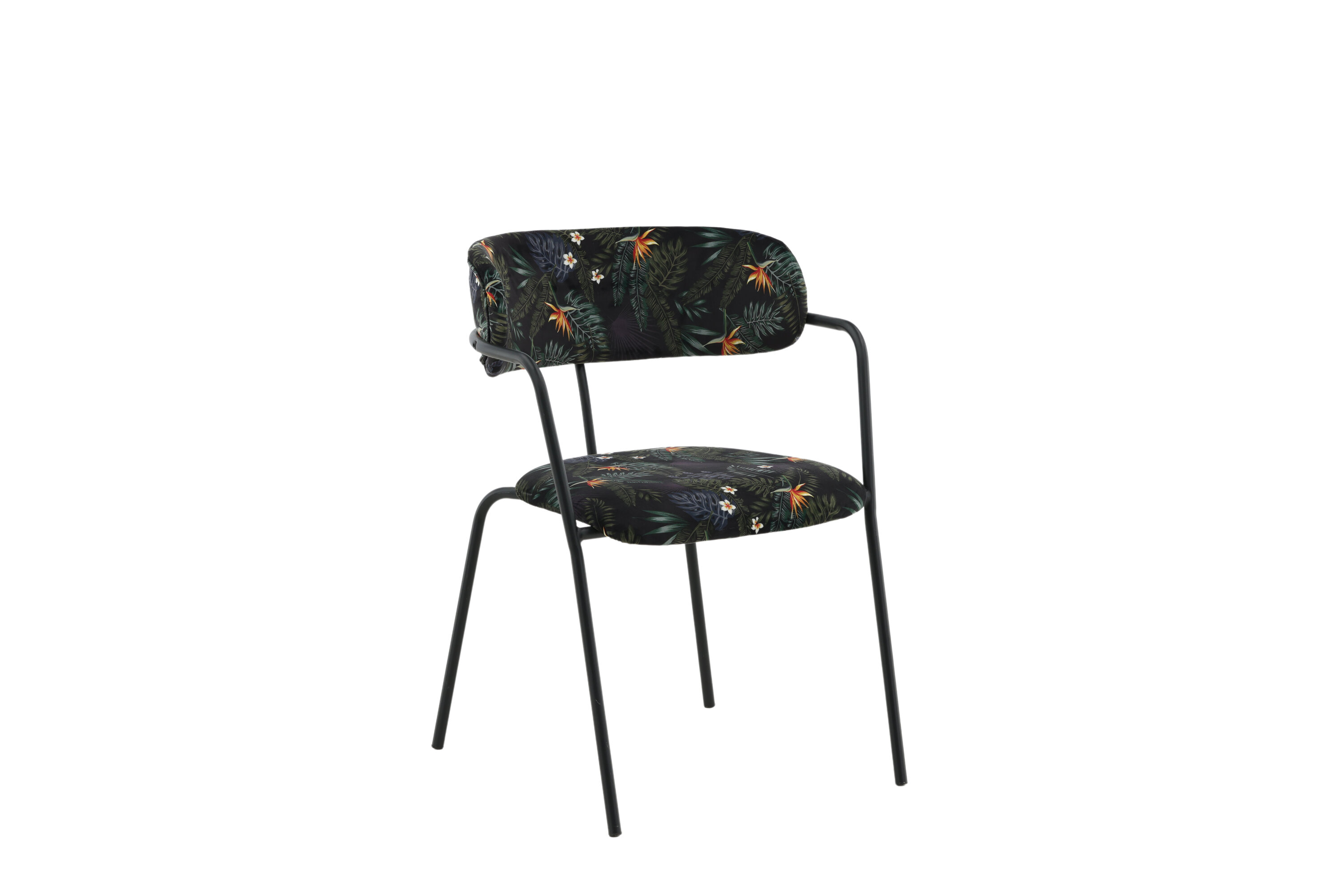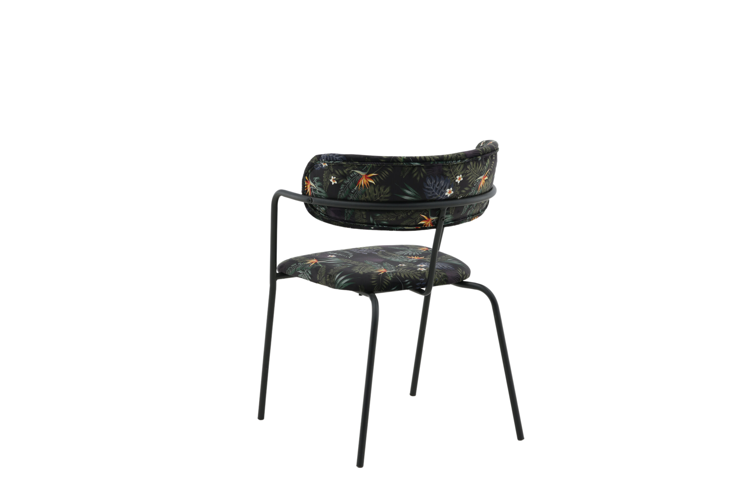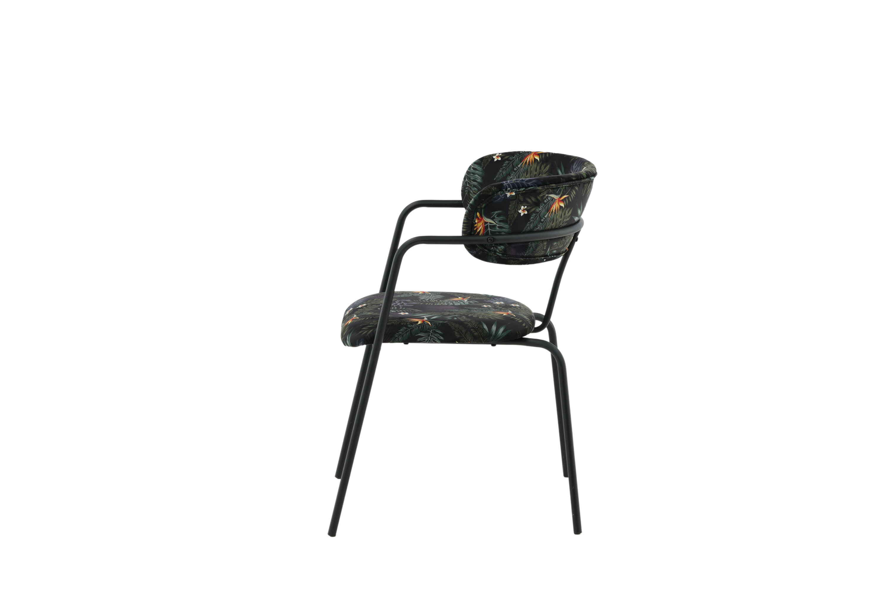 Créez un point focal remarquable avec des chaises de salle à manger multicolores de la série Arrow ! Cette chaise de salle à manger est dotée de pieds et d'accoudoirs intégrés en métal noir thermolaqué et d'un design élégant avec un dos incurvé. Dossier et assise en tissu polyester rembourré noir à motif floral qui crée une impression personnelle à l'intérieur. Un certain montage est nécessaire.