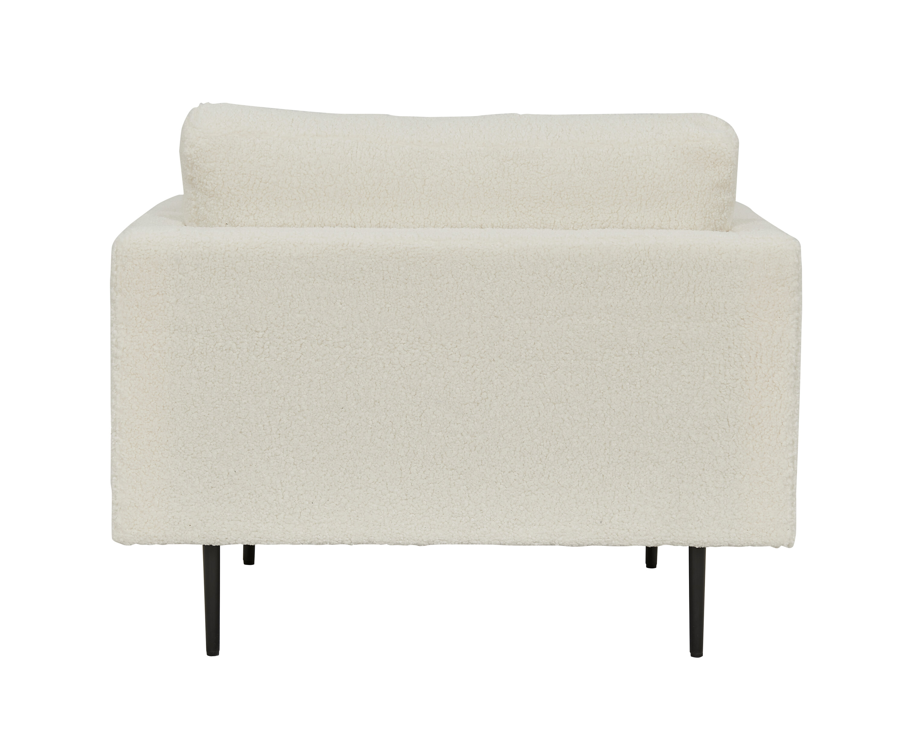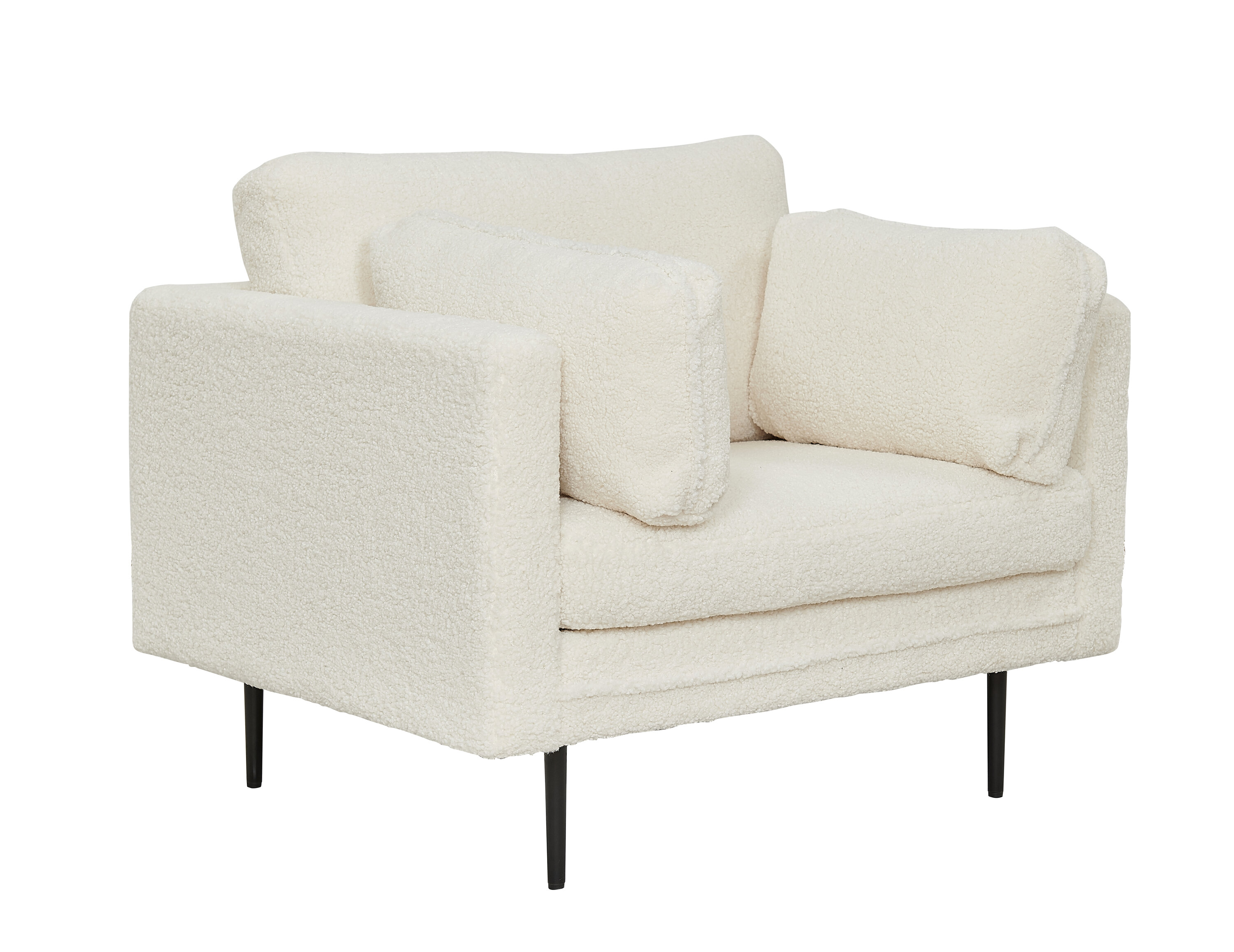 Confortable, luxueux et incroyablement confortable - un vrai fauteuil tout simplement ! Notre fauteuil élégant de la série Boom Inger procure une sensation incroyablement chaleureuse et invitante à votre maison et prolongera sûrement votre précieux temps à la maison. L'accessoire en peluche crème-blanc est aussi confortable que tendance. Le design est intemporel avec des formes nordiques droites et des jambes métalliques étroites. Offrez-vous un endroit agréable pour vous détendre et laissez le fauteuil devenir le cœur du salon !
