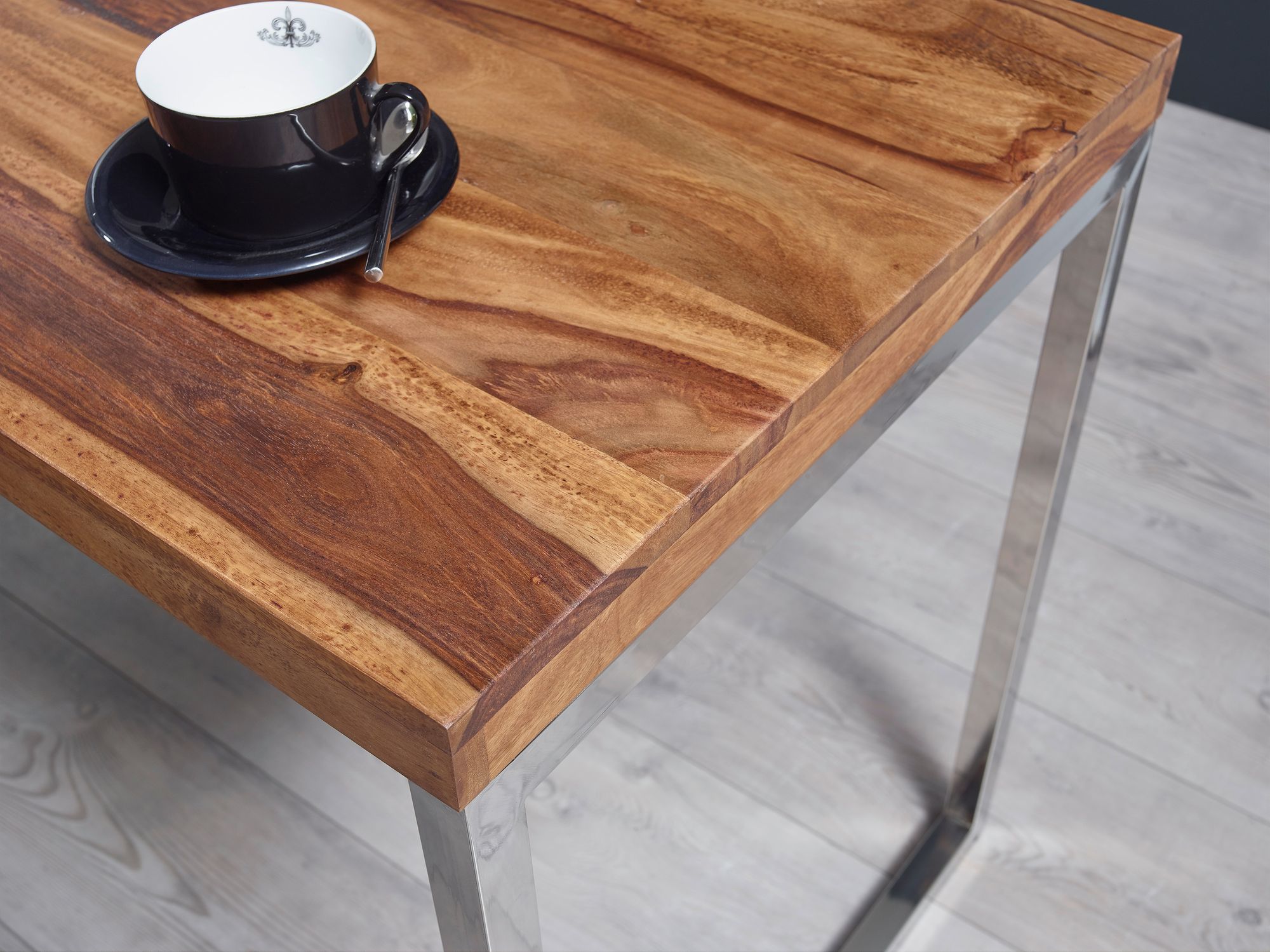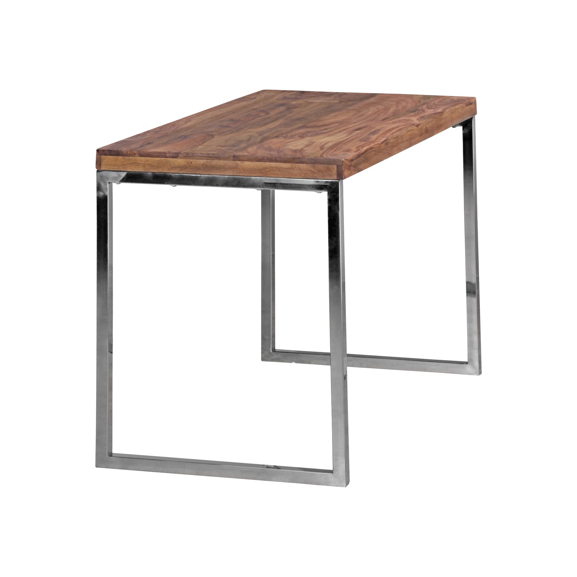 Le bureau GUNA en bois massif Sheesham allie élégance et robustesse pour votre espace de travail. Sa surface en bois naturel à la finition claire et son piètement en métal chromé apportent un contraste chaleureux et moderne. Conçu pour un usage polyvalent dans un style campagne, il offre un espace optimisé et confortable.