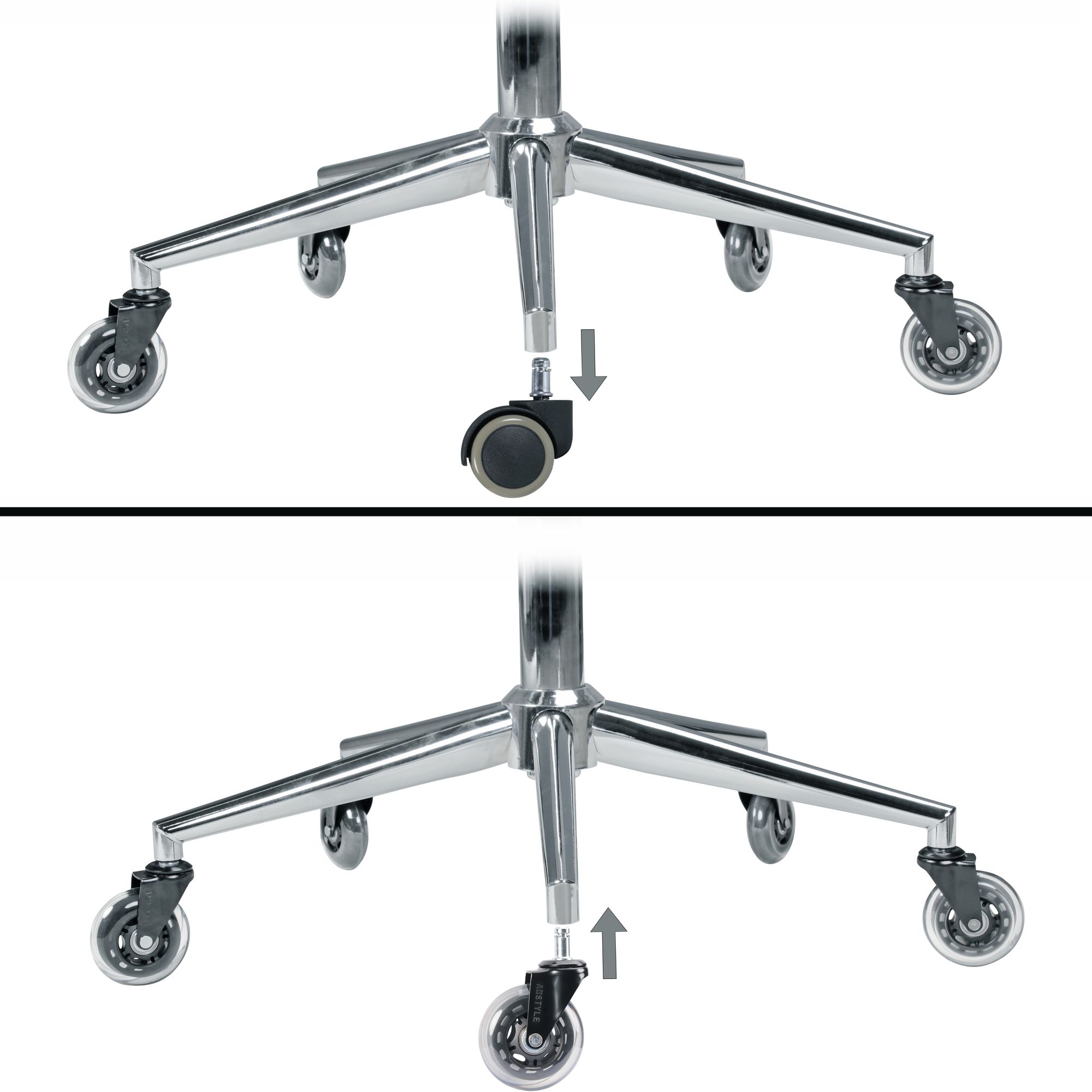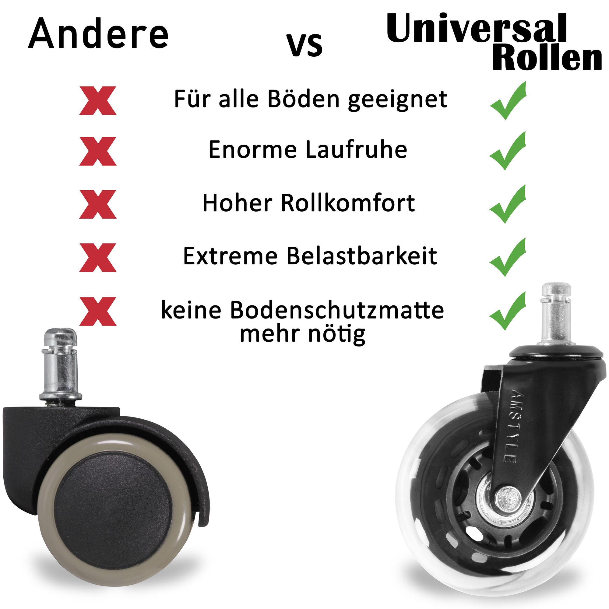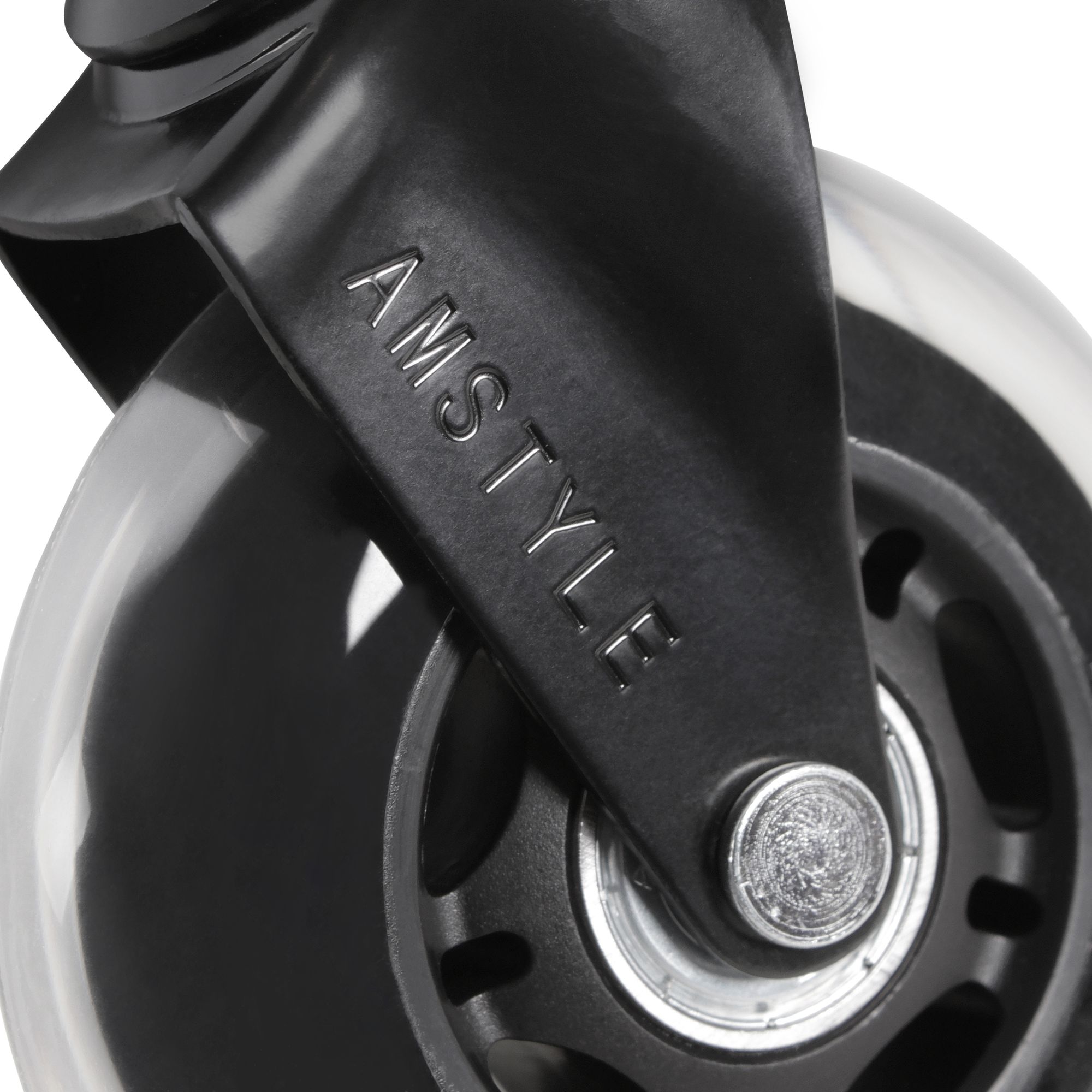 Informations sur le produit "Set de 5 roulettes universelles silencieuses pour fauteuil de bureau | Transparent / Noir | Diamètre 75 mm, Tige 11 mm"