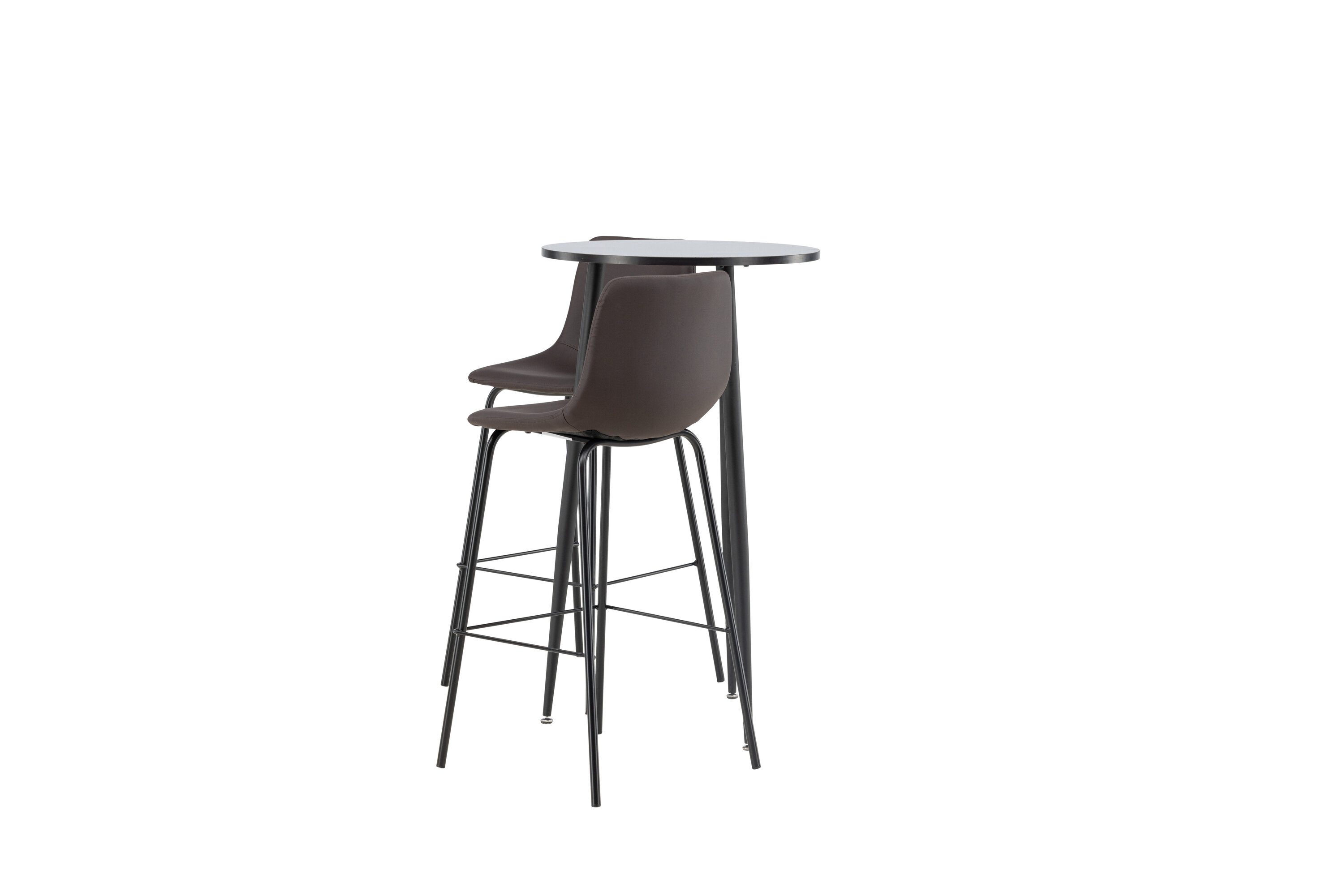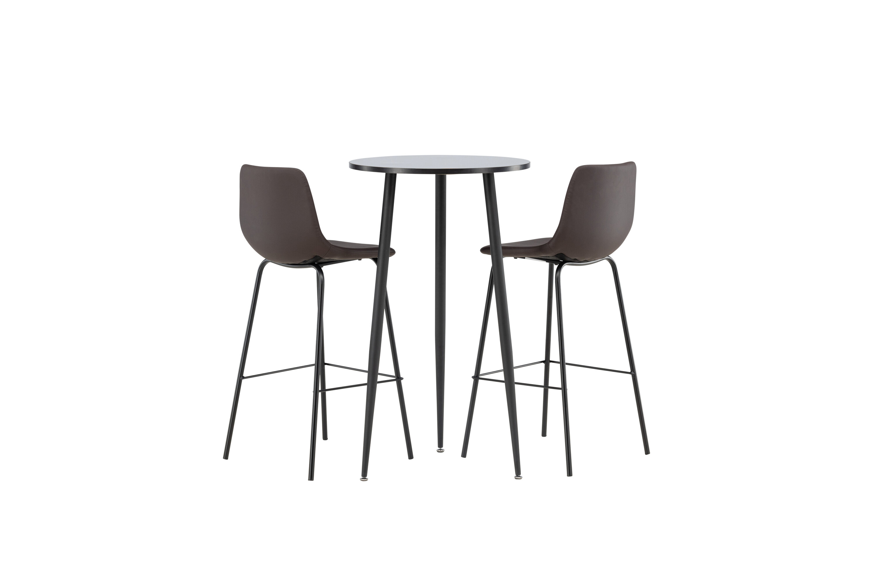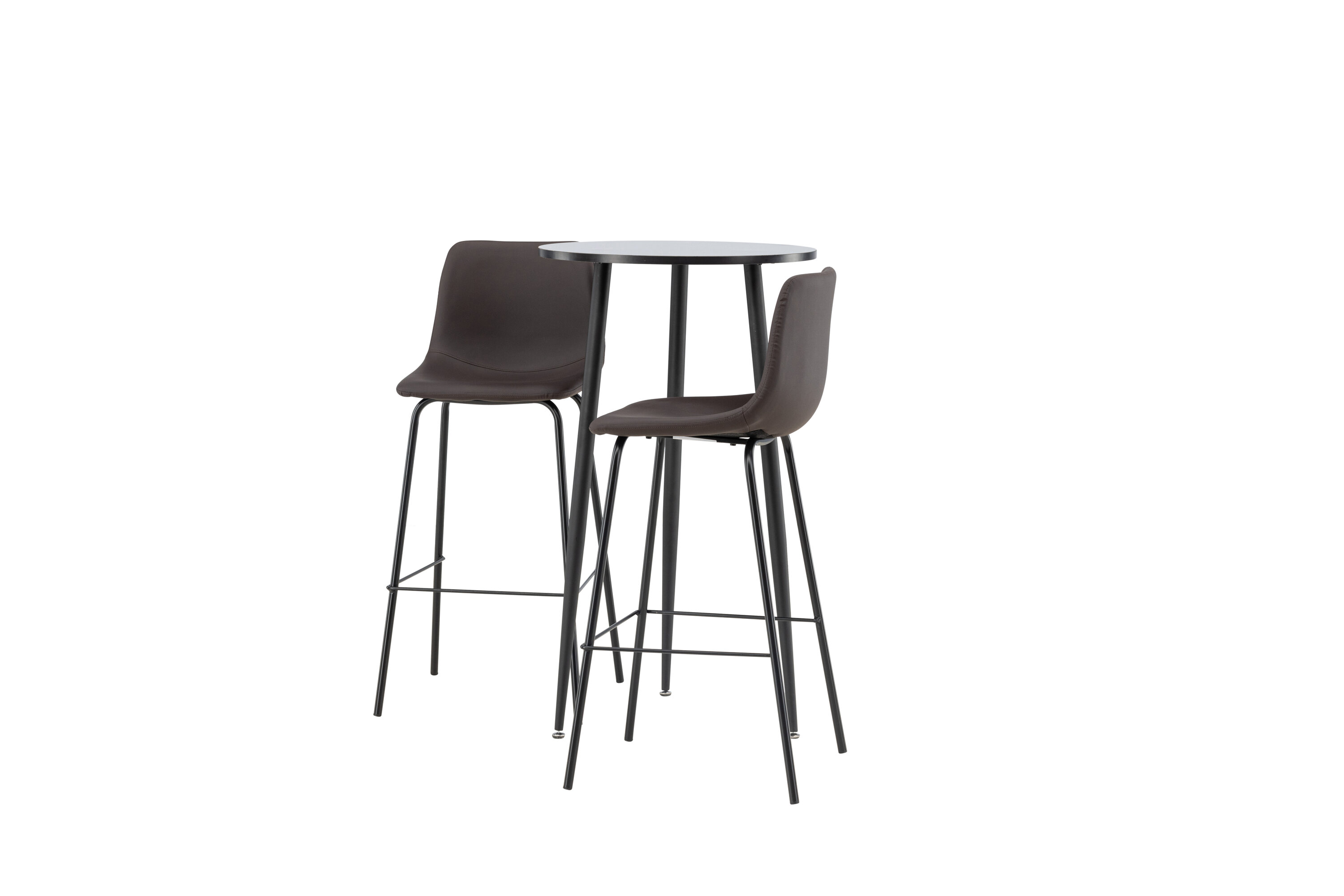 Un groupe de bar confortable dans un design élégant ! La magnifique table de bar Plaza a un plateau rond en MDF noir et les pieds de la table sont légèrement évasés en métal noir. Ici en combinaison élégante avec des tabourets de bar bruns de la série Alexi. Le design est bien pensé avec une chaise entièrement rembourrée en cuir polyuréthane rembourré marron et en polyester et des pieds étroits en métal noir thermolaqué avec repose-pied intégré pour un confort supplémentaire. Décorez votre maison intelligemment ! Dimensions de la table : 60 cm.