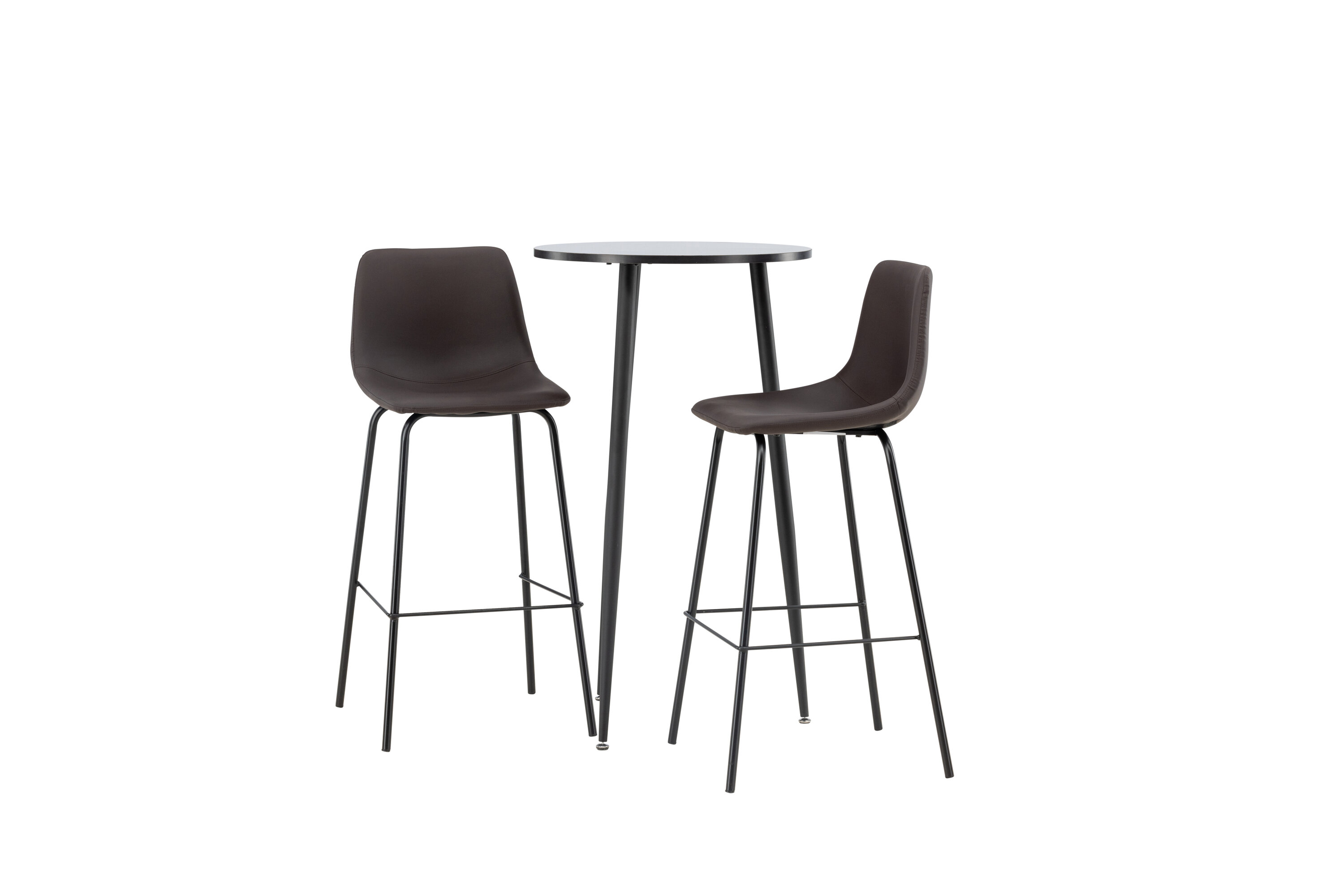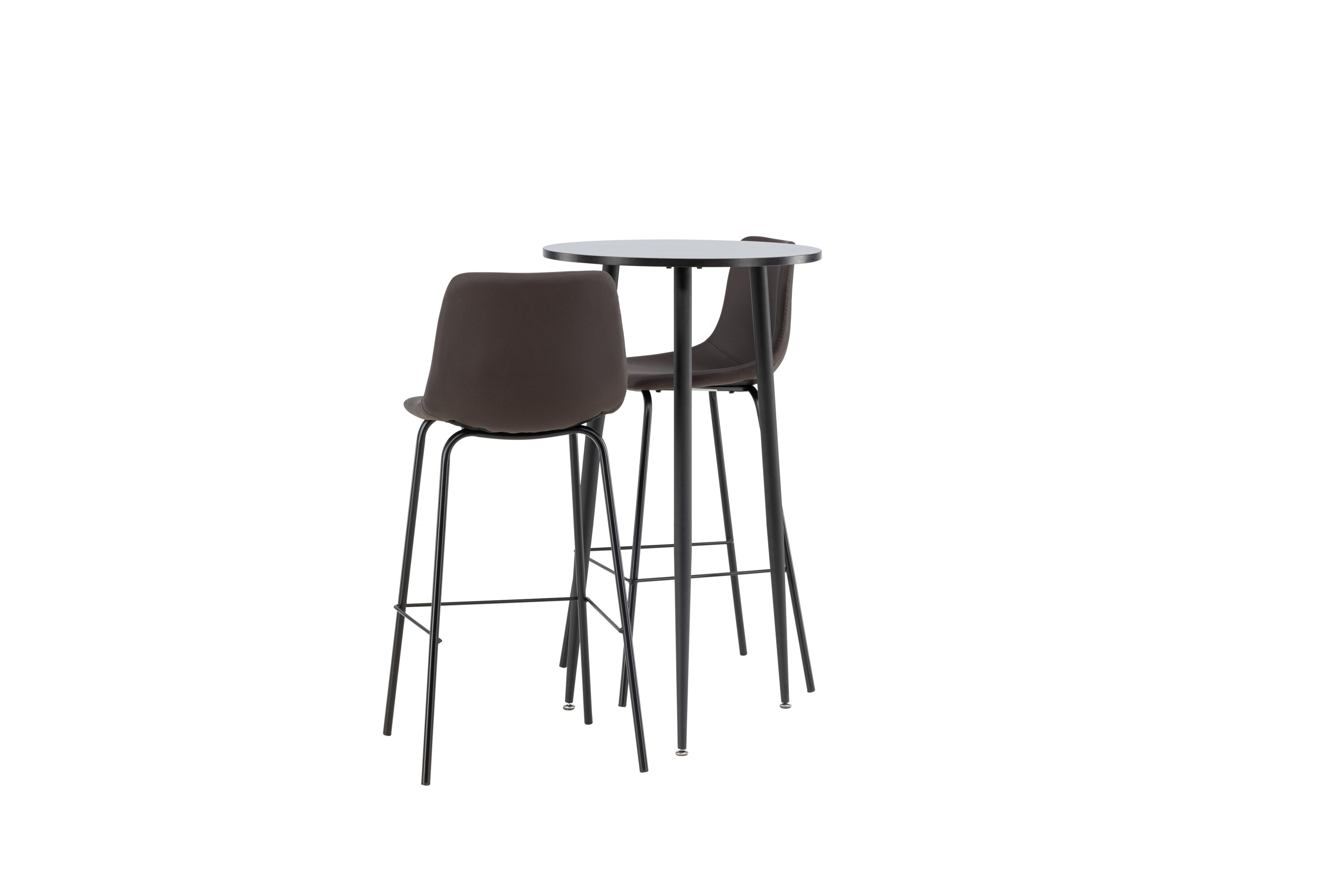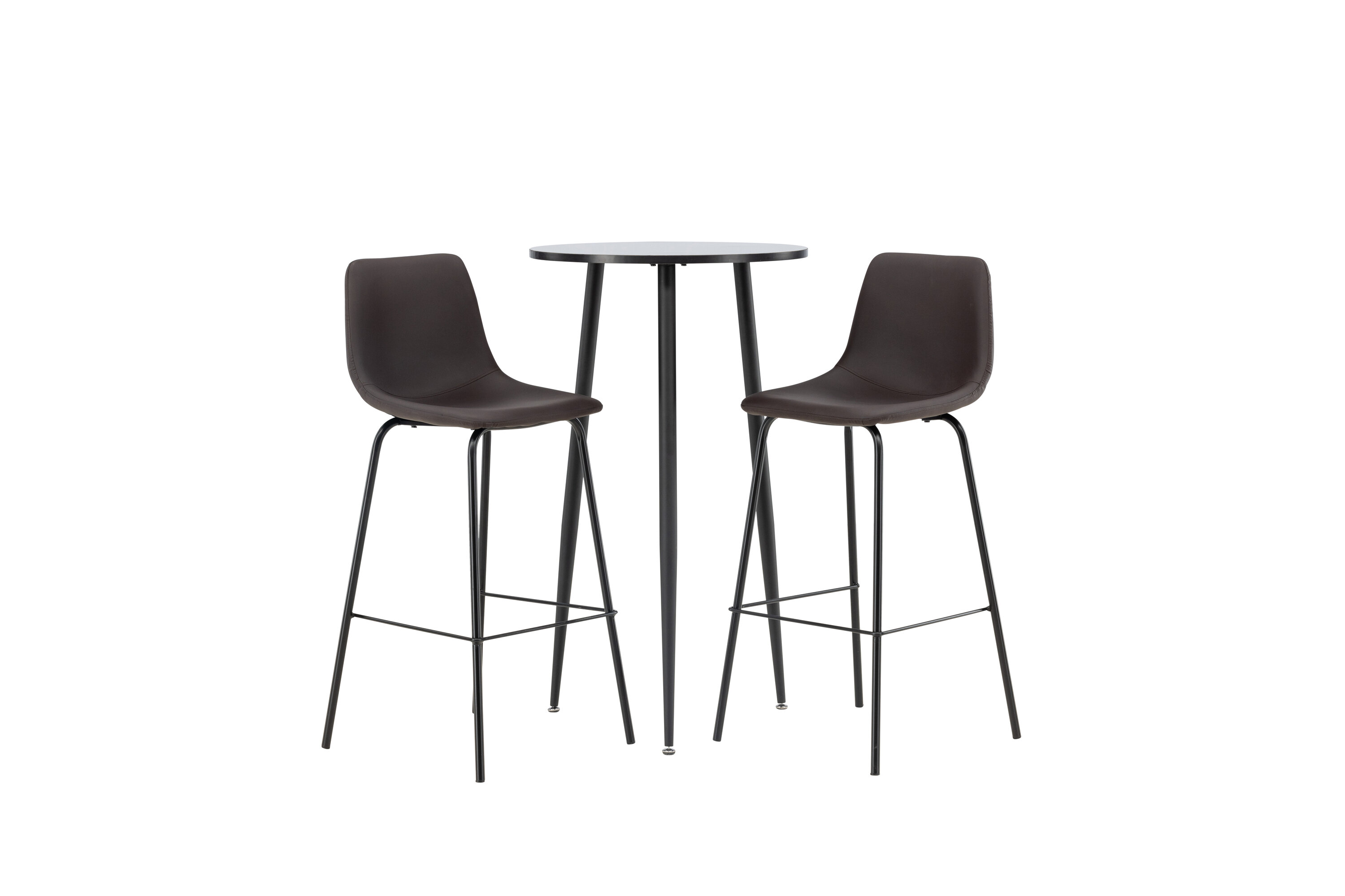 Un groupe de bar confortable dans un design élégant ! La magnifique table de bar Plaza a un plateau rond en MDF noir et les pieds de la table sont légèrement évasés en métal noir. Ici en combinaison élégante avec des tabourets de bar bruns de la série Alexi. Le design est bien pensé avec une chaise entièrement rembourrée en cuir polyuréthane rembourré marron et en polyester et des pieds étroits en métal noir thermolaqué avec repose-pied intégré pour un confort supplémentaire. Décorez votre maison intelligemment ! Dimensions de la table : 60 cm.