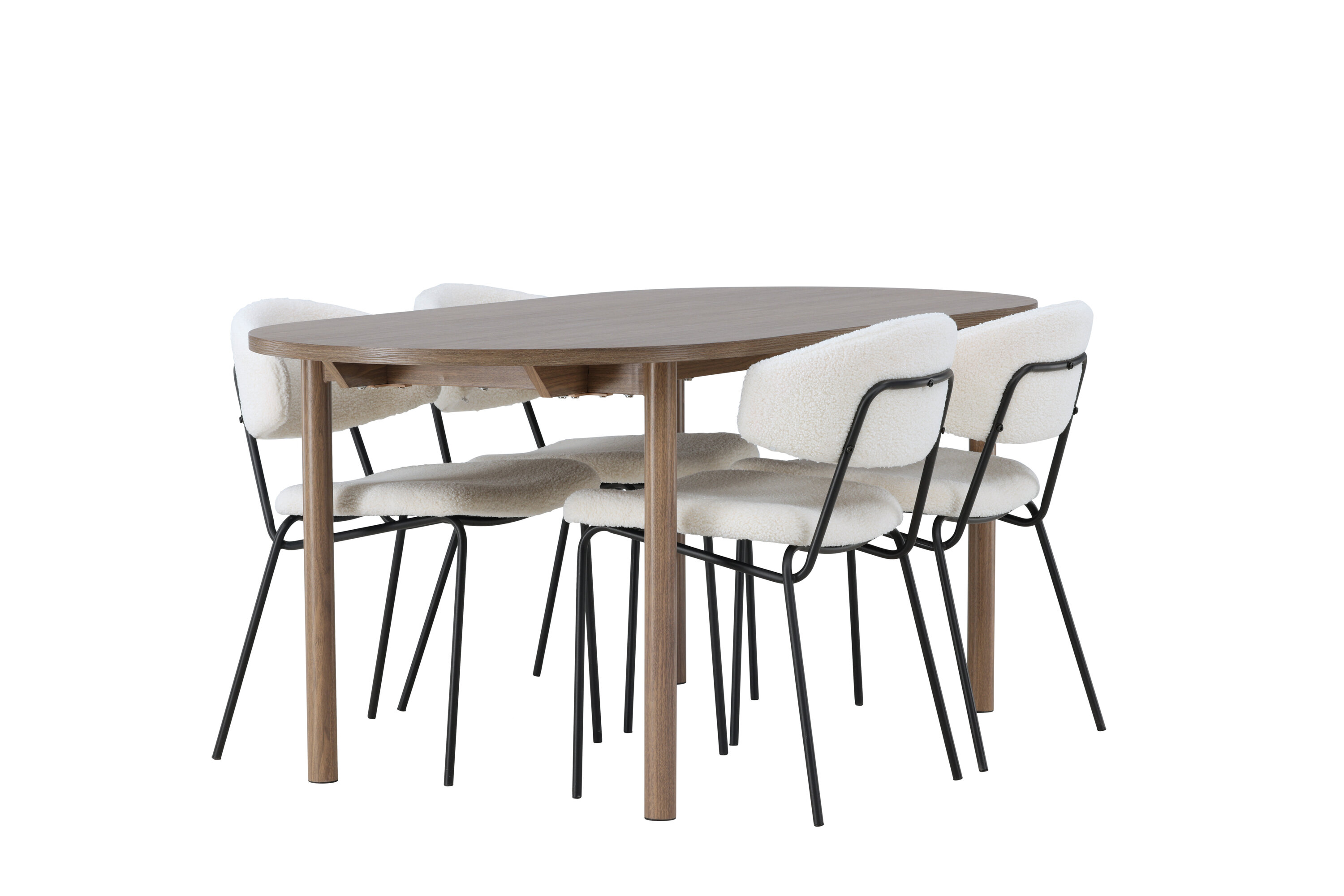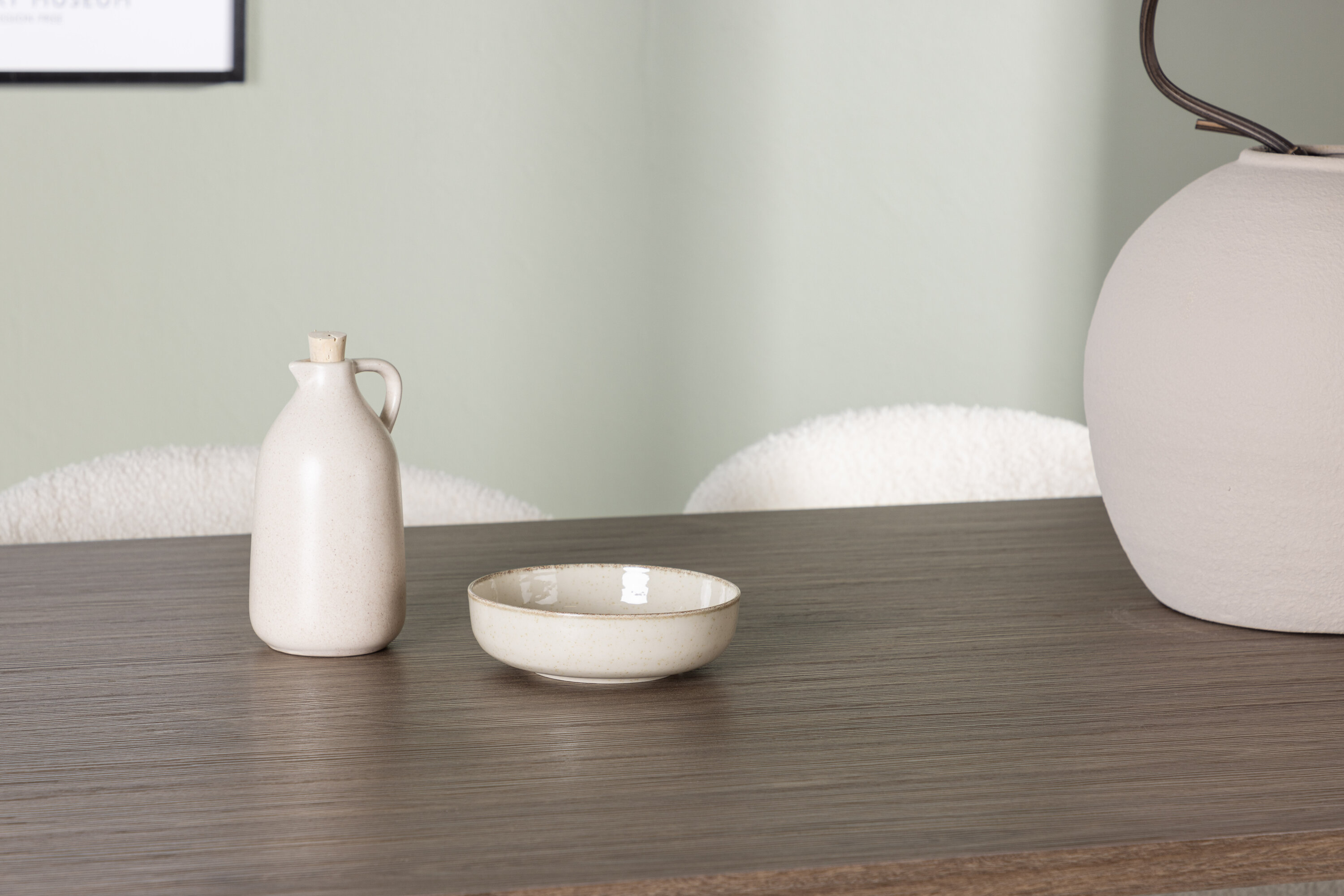 Ici, nous avons complété cette table à manger ovale avec les chaises blanches de la série Chico pour créer une harmonie parfaite. Les chaises Chico impressionnent par leur minimalisme élégant et leur design arrondi qui rehausse l'aspect général. Le tissu slim bouclé dans une belle couleur beige ajoute une touche d'élégance à votre salon.