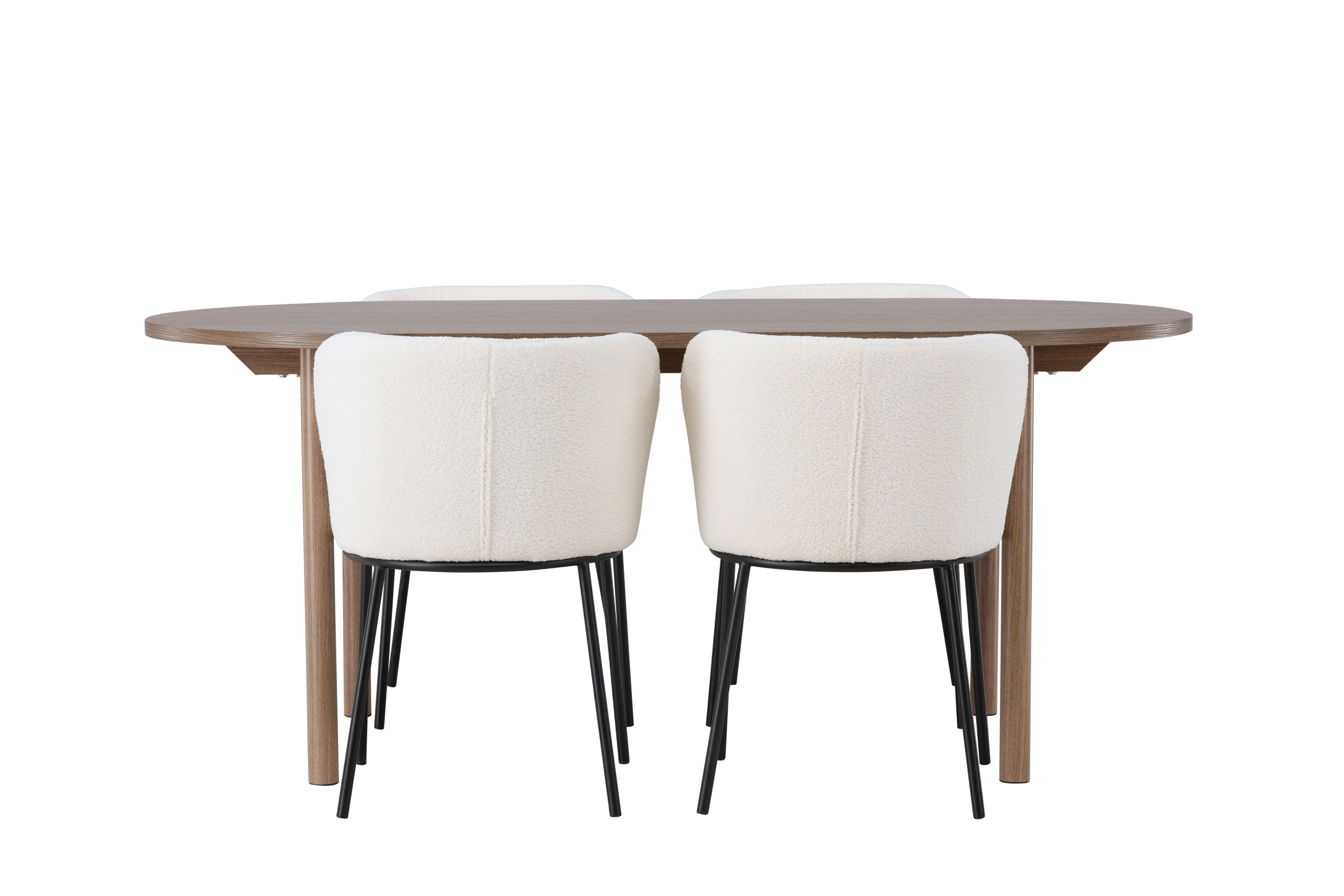 Ici, nous avons associé la table à manger de couleur naturelle à des chaises de salle à manger élégantes de la série Edina. La chaise dispose d'un siège sans couture et entièrement rembourré en tissu bouclé blanc, qui ajoute une touche luxueuse à votre salle à manger. Les pieds de chaise en métal noir minimaliste complètent le design élégant d'une manière élégante.