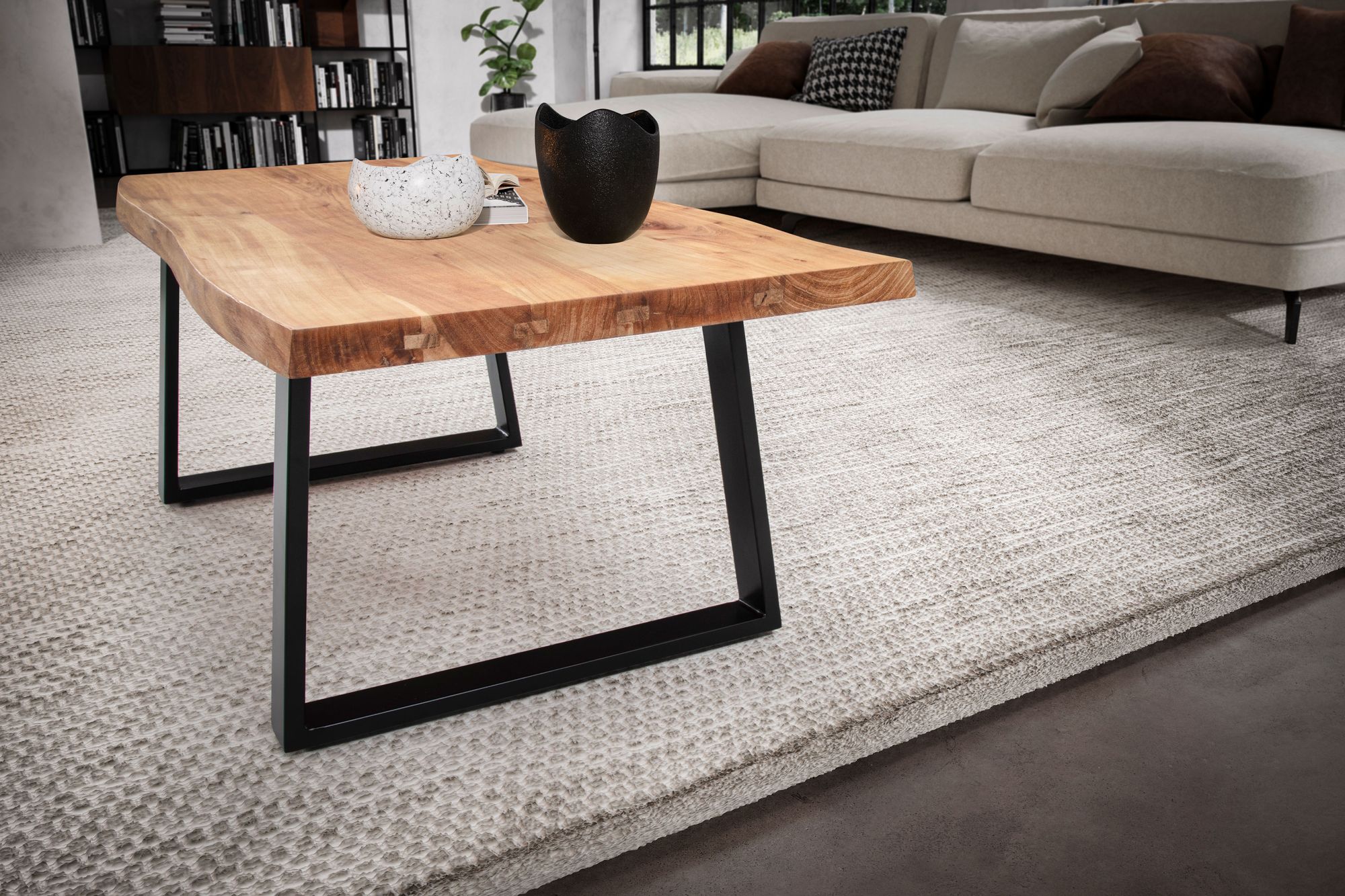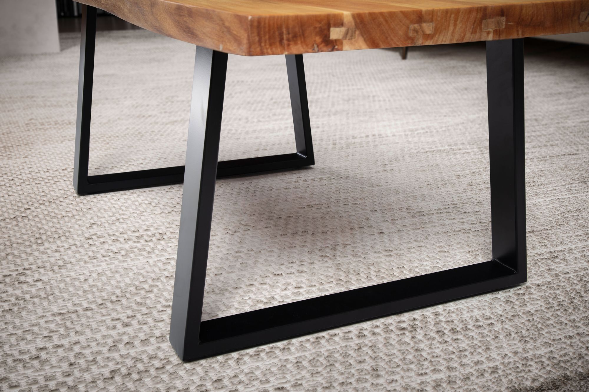 Informations sur le produit "Table basse 120x60x46 cm bois massif d'acacia / bord d'arbre en métal, table de salon design rectangulaire, table de canapé table de salon marron, table basse avec pieds trapézoïdaux en noir"