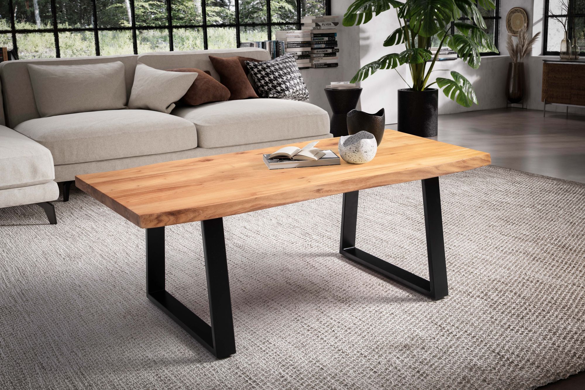 Table basse 120x60x46 cm bois massif d'acacia / bord d'arbre en métal, table de salon design rectangulaire, table de canapé table de salon marron, table basse avec pieds trapézoïdaux en noir