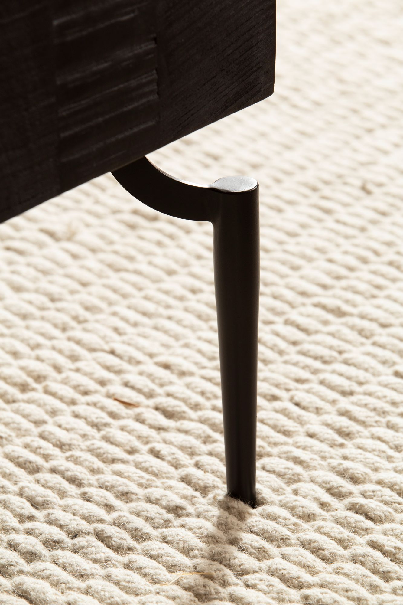 - Matériaux : Plateau en bois massif de manguier laqué noir + MDF laqué + pieds en fer laqué.