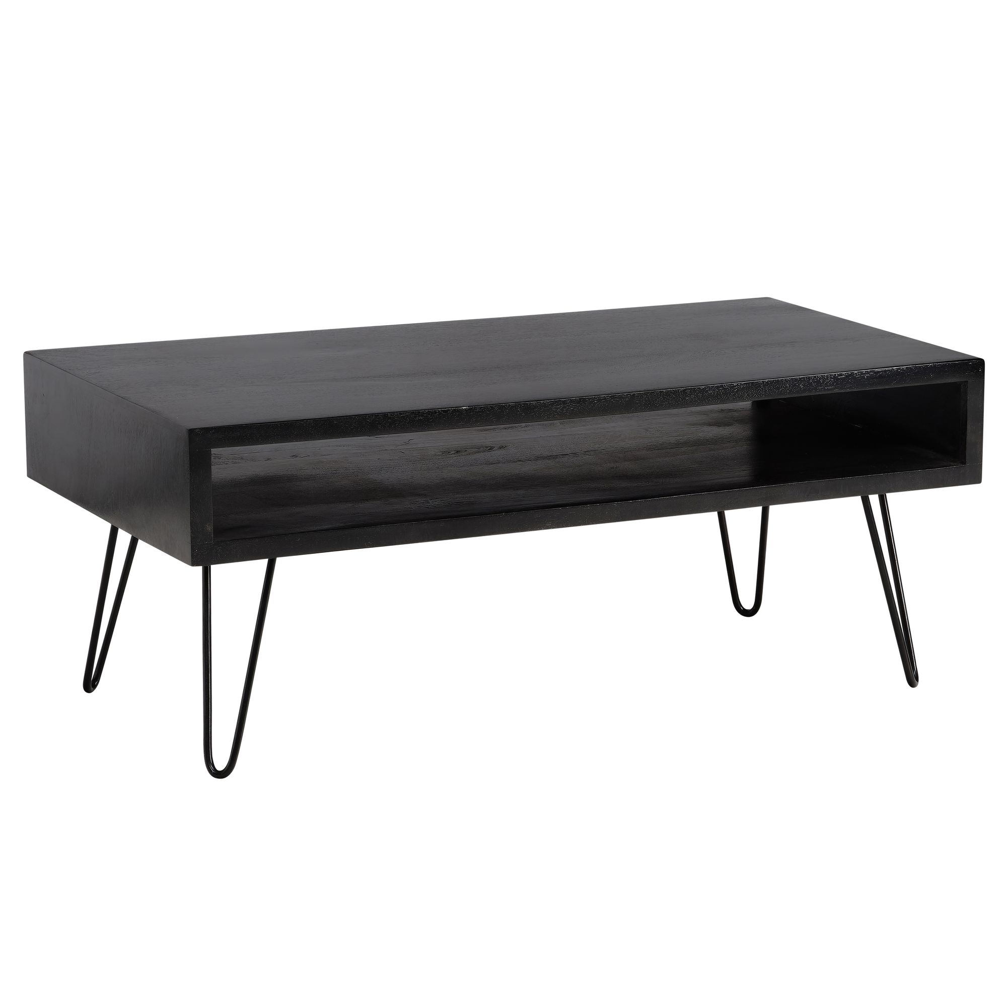 Apportez fonctionnalité et élégance à votre salon avec cette table basse rectangulaire en bois massif de manguier finition noir mat. Soutenue par quatre pieds épingles en métal noir, elle intègre un grand espace de rangement sous le plateau.